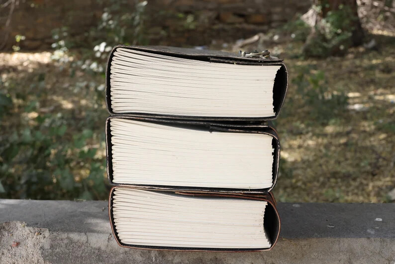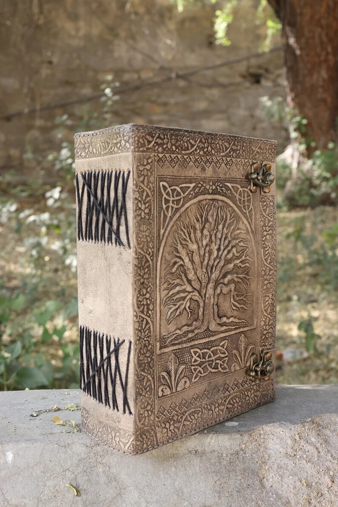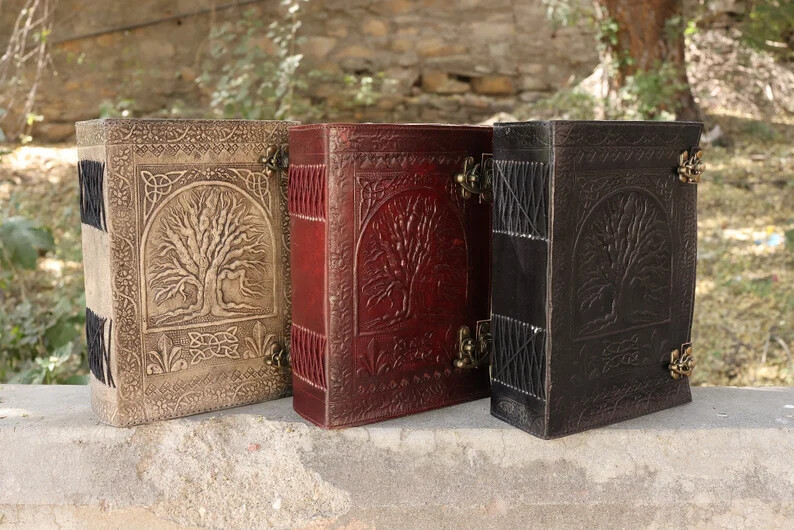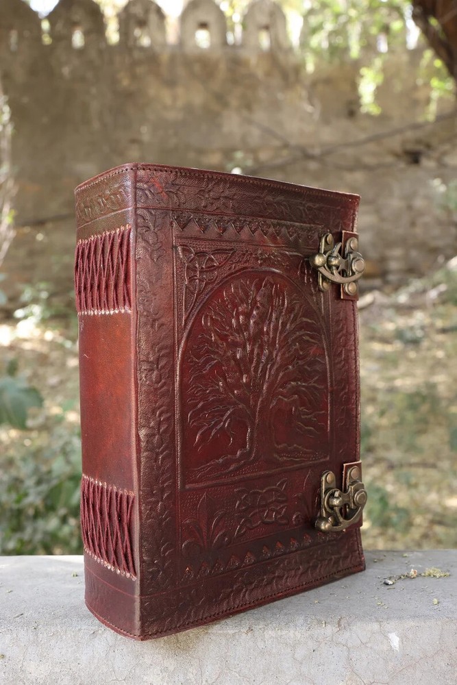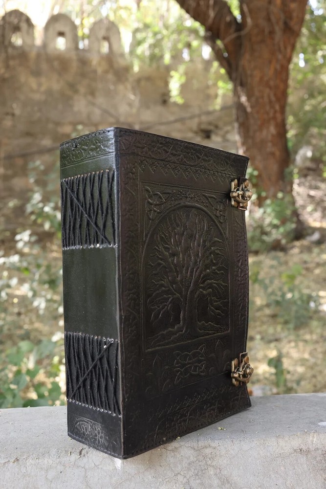 Fat Leather Jo LIFE urnal Large 600 Pages TREE OF Embossed Leather Notebook Journal Blank Handmade Book Sketchbook Christmas Gift Everyday Use or Fat Leather Journal Large 600 Pages Charcol, Brown, Black Tree Of Life Grimoire Wicca Book of Shadow Leather Notebook Journal Blank Handmade Book Sketchbook Beautifully Handcrafted TREE OF LIFE Embossed Fat Large Journal by highly skilled artisans. 100% Natural leather and Handmade Size - 10*7 inches Journals can vary in shade as each leather is different so each item is unique in its own way. There are off white 600 pages counting both sides Pages are made of Drawing Sheet Closure Item description from the seller JOURNAL FOR WOMEN : A perfect Leather Journal for Women by The Udaipur Art . This Vintage Journal is made from Genuine leather which is naturally tanned with oils, Salt & Scents and is Chrome free. These Girls Journals are made with genuine leather so each vary in look and shade producing a unique item. The Distress Leather combined with Antique Vintage paper makes it a perfect Book of shadows - Spell Book. VINTAGE LEATHER JOURNAL: This Old Journal comes with a Beautiful Lock Closer. This Leather Notebook makes a Unique Gift for Women - Teen Girls. Use this Blank Journal as a Travel journal, Daily journal, Gratitude Journal, pregnancy journal, Bible Journal, Prayer Journal, Wedding Guest Book Alternative etc. JOURNAL NOTEBOOKS WITH IDEAL SIZE : - This Gratitude Journal comes with sizes 10 inches X 7 inches & 13.5 with 2.5 inches Thickness. Easy for handwriting, drawing and sketching and compact for carrying in your bag. USE ANY KIND OF PEN; sketch, doodle on your blank Journal with a Calligraphy Pen, Fountain Pen, Brush.