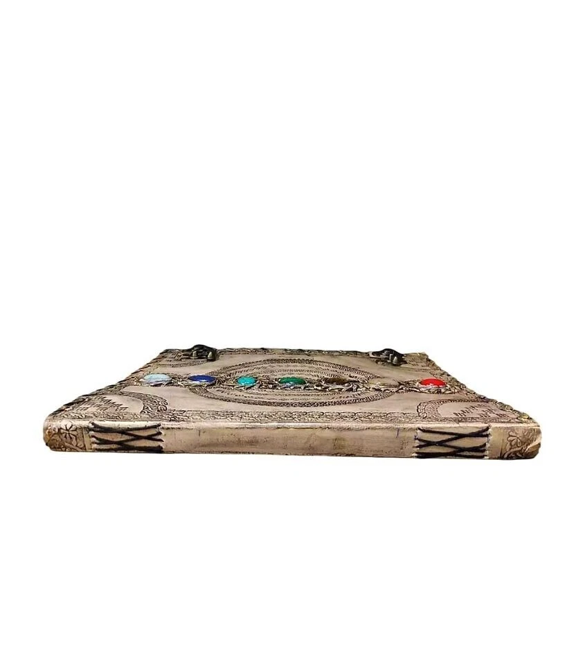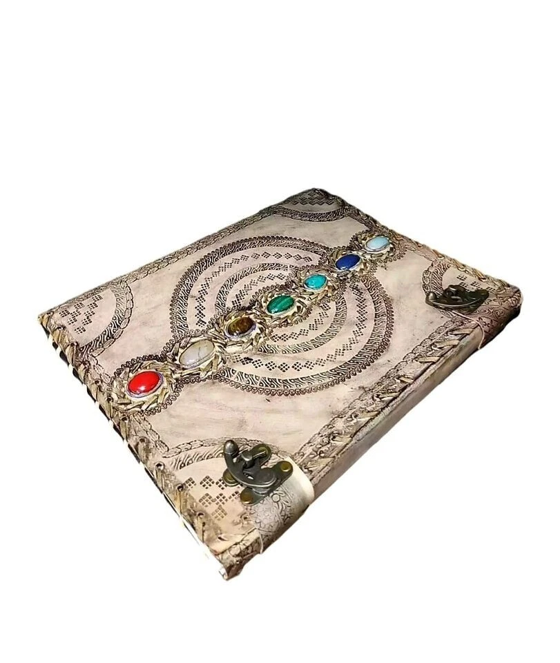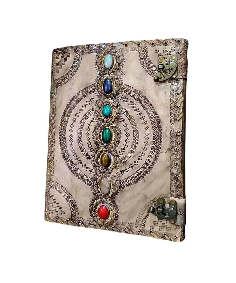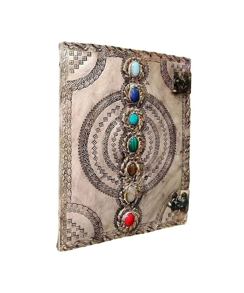 Extra Large Leather Journal Seven Stone Embossed Notebook With Blank Papers Personal Journal For Writing Mother's Day Gift For Her Gift For Mothers Handmade leather journal with seven different stone ( Semi Precious ) embedded and aligned in the center of the book. Size 10X7X3 Brown color extra large journal provided with 2 brass lock for enclose at corner edge for enhancing the distressed look of journal. Hand embossed notebook chakra design around all the 7 different stone which give a detailed fine handmade look to journal. Amazing embossed done on the front and the back side. Provided with 610 Sheets of paper ( pages counting on the both side ) Perfect for Gifts - Suitable for men or women this blank paper personal journal is a perfect gift for mother, writers, your loved once , family members, relatives, occasions, etc. This amazing journal with lock can be used as a handmade journal, refillable journal, embossed journal, personal journal, stone journal, spell book, journal with stones, book of shadows, etc. We guarantee high quality products and unique design. All made especially for you.