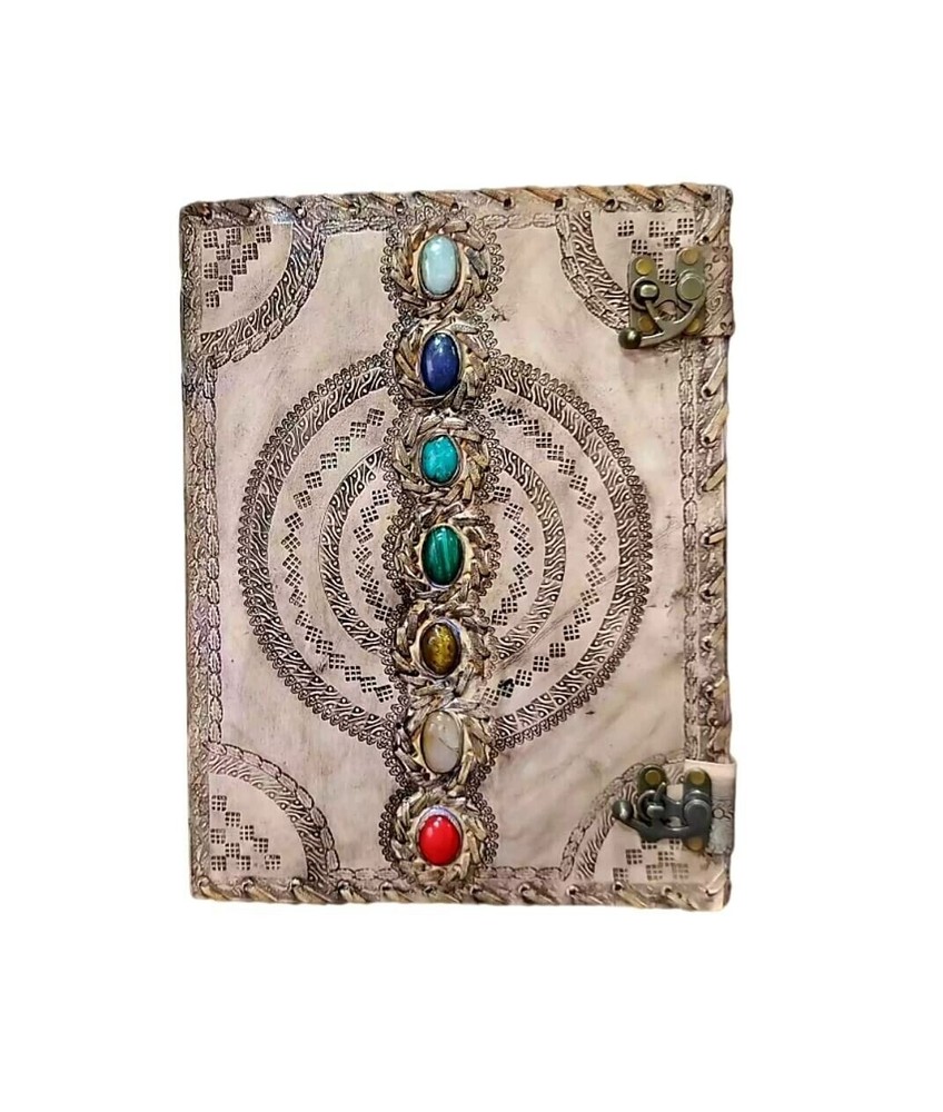 Extra Large Leather Journal Seven Stone Embossed Notebook With Blank Papers Personal Journal For Writing Mother's Day Gift For Her Gift For Mothers Handmade leather journal with seven different stone ( Semi Precious ) embedded and aligned in the center of the book. Size 10X7X3 Brown color extra large journal provided with 2 brass lock for enclose at corner edge for enhancing the distressed look of journal. Hand embossed notebook chakra design around all the 7 different stone which give a detailed fine handmade look to journal. Amazing embossed done on the front and the back side. Provided with 610 Sheets of paper ( pages counting on the both side ) Perfect for Gifts - Suitable for men or women this blank paper personal journal is a perfect gift for mother, writers, your loved once , family members, relatives, occasions, etc. This amazing journal with lock can be used as a handmade journal, refillable journal, embossed journal, personal journal, stone journal, spell book, journal with stones, book of shadows, etc. We guarantee high quality products and unique design. All made especially for you.