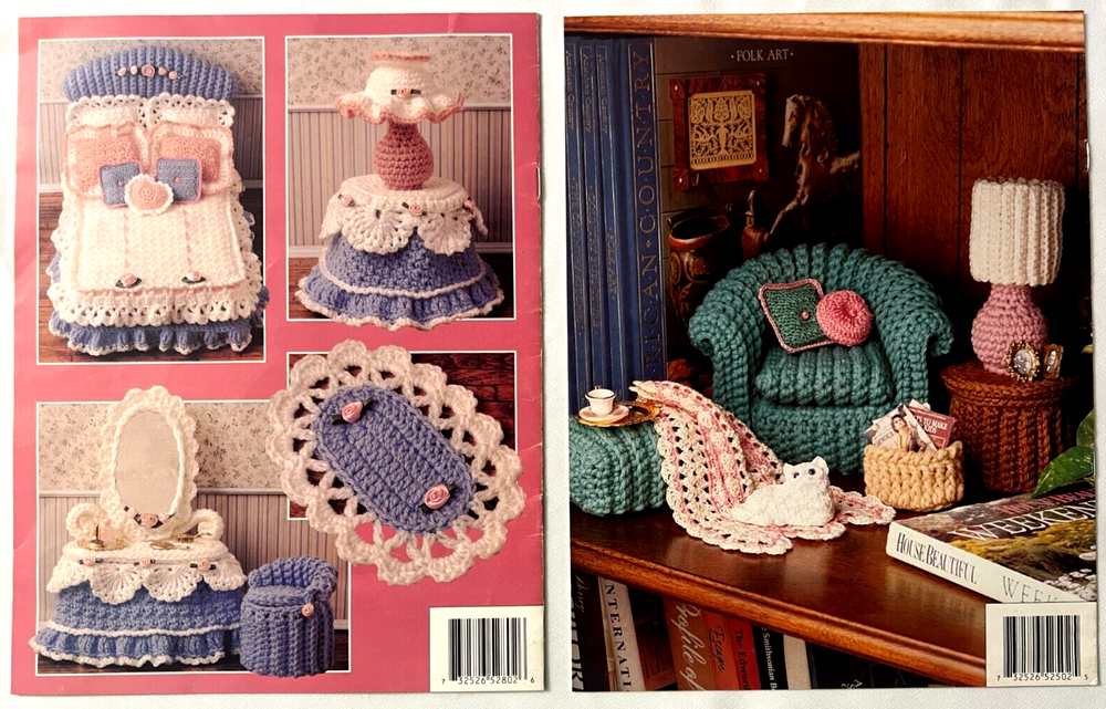 One purchase equals the following item(s): ******** These Patterns are designed to fit an 11-1/2" Fashion Doll such as Barbie. ********* Title: Sweetheart Bedroom Volume 3 Brand: Annie's Attic # 528B SERIES: Annie's Fashion Doll Home Decor Crochet Collector's Guild Designer: An Original by Annie, Annie Potter Number of Pages: 10 Published : 1993 Craft: Crochet Suggested Material: Mix of Sport Weight Yarn & size 10 cotton thread Hook Size: Size 7 & 0 steel & size E, F & H crochet hooks or size required for gauge Condition: edge and corner wear, a few creases on front and back cover, oval drawn in margin of last page, otherwise inside clean with no writing, intact and complete Sweetheart Bedroom Volume 3 book patterns include : This book includes a special stitching guide with details and illustrated diagrams. Each piece in this collection has easy to follow step by step directions with necessary diagrams for completion and assembly. Bed Mattress, 12" long Headboard, 9" tall Mattress cover Dust ruffle Bedspread Pillows Large oblong pillow, 4" x 5" Large square pillow, 4-1/2" square Small square pillow, 2-1/2" square Heart pillow, 2-1/2" across Dressing table ~ 10" tall Dressing table skirt Mirror Nightstand, 4-1/4" tall Lamp and lampshade ~ 4-1/2" tall Rug, 4" x 5-3/4" oval Vanity stool ~ 4" tall Title: Classic Living Room Brand: Annie's Attic # 525B SERIES: Annie's Fashion Doll Home Decor Crochet Collector's Guild Volume I Number of Pages: 7 Published : 1992 Designer: An Original by Annie, Annie Potter Craft: Crochet Suggested Material: Mix of Worsted Weight Yarn & size 10 cotton thread Hook Size: Size 7 & 0 steel & size G, F & H crochet hooks or size required for gauge Condition: edge and corner wear, a few light creases on cover, inside clean with no writing, intact and complete The Classic Living Room booklet patterns include: This book includes a special stitching guide with details and illustrated diagrams. Each piece in this collection has easy to follow step by step directions with necessary diagrams for completion and assembly. Craft patterns designed to fit Barbie and 11-1/2" fashion dolls Afghan ~ Finished Size 5” x 8” Magazine Basket ~ Finished Size 1 ½” tall Round Pillow ~ Finished Size 1 ½” across Square Pillow ~ Finished Size 2” square Rug ~ Finished Size 16 ½” x 24” End Table – Tabletop Finished Size 3 ½” across Lamp ~ Finished Size 4 ½” tall Sofa ~ Finished Size 10 ½” long Chair ~ Finished Size 5” tall Hassock ~ Finished Size 3 x 3 ½” - If you have questions, please feel free to email me. SALES TAX WHERE APPLICABLE. I AM VERY PARTICULAR WITH MY SHIPPING. I SECURE EACH AND EVERY PACKAGE AND GO OUT OF MY WAY TO PROTECT YOUR ITEM. THANKS FOR LOOKING! Listing and template services provided by inkFrog