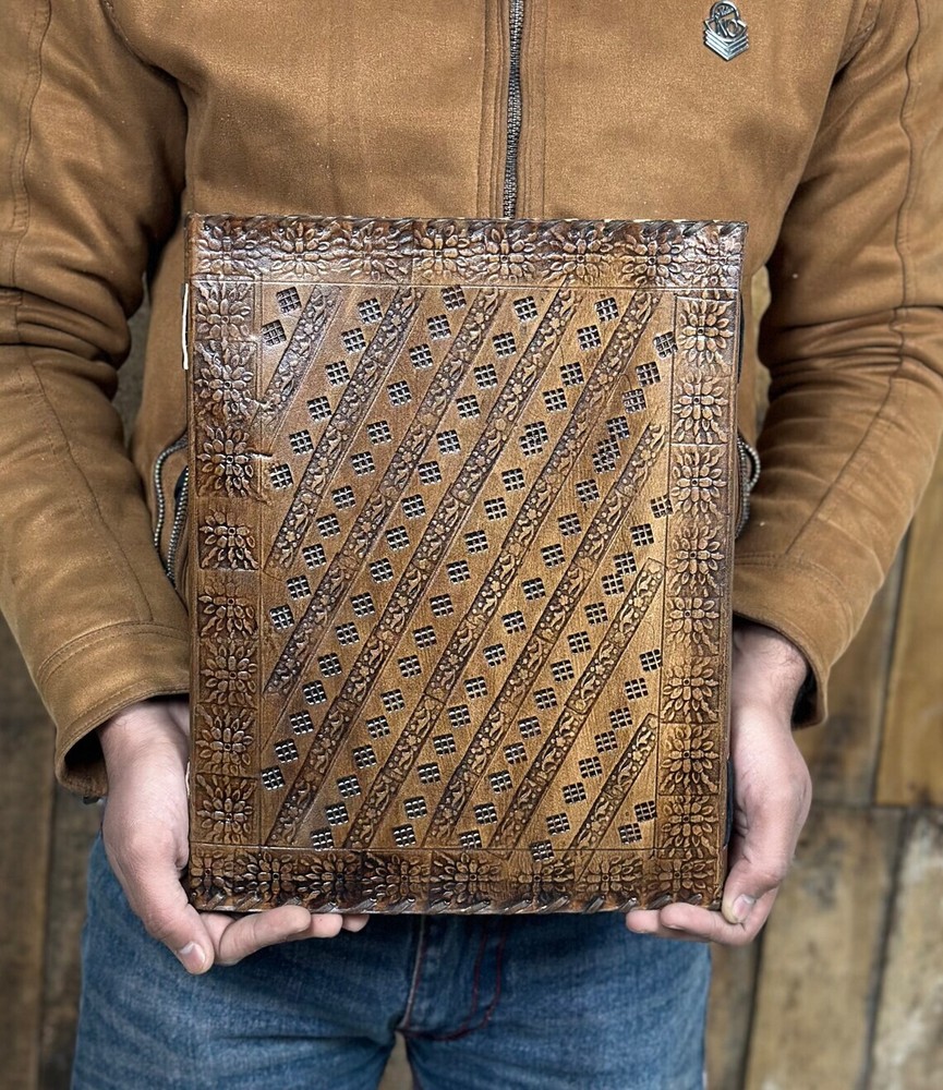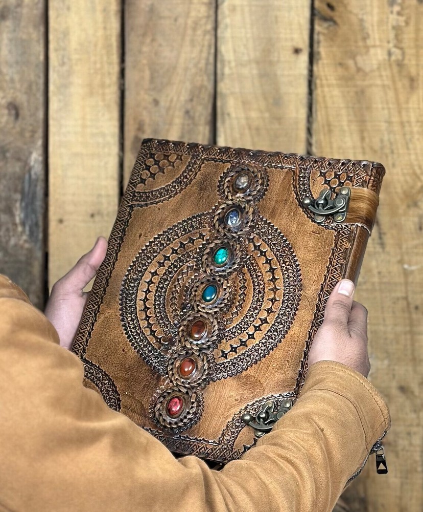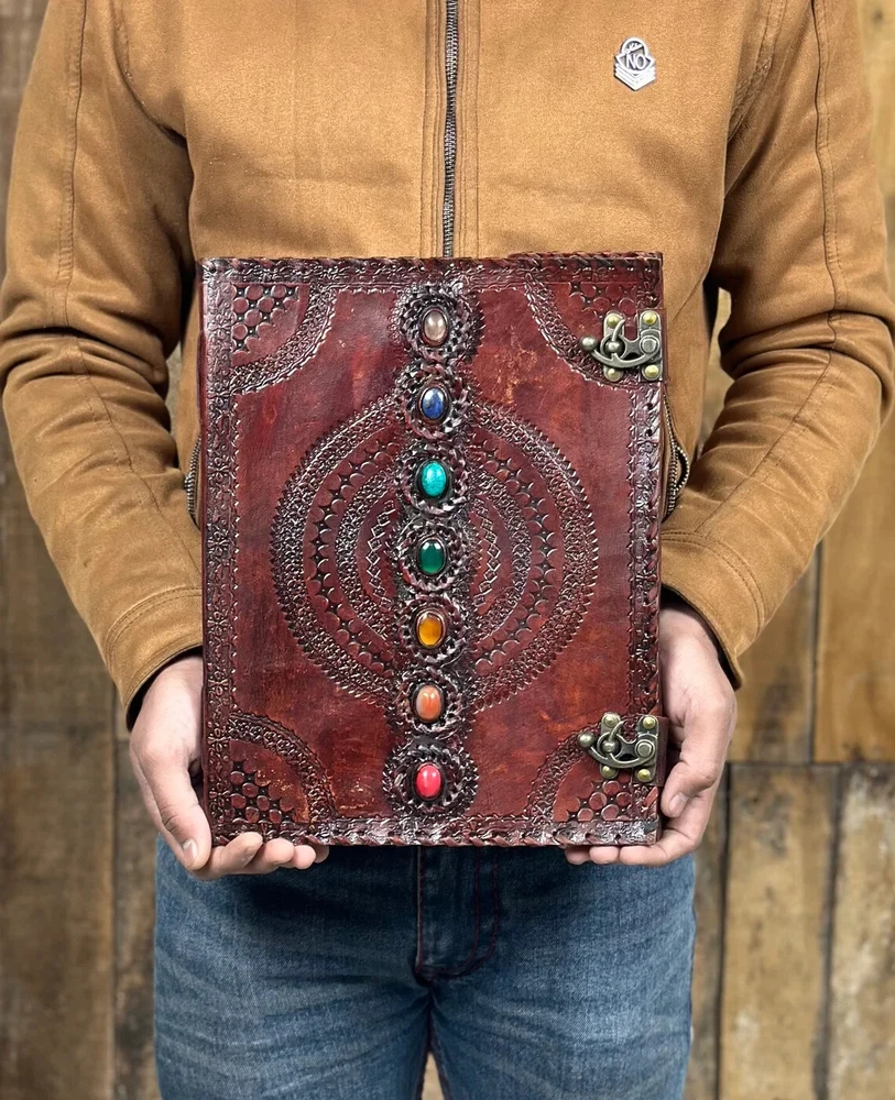 Extra Large Leather Journal Seven Stone Embossed Notebook With Blank Papers Personal Journal For Writing Mother's Day Gift For Her Gift For Mothers Handmade leather journal with seven different stone ( Semi Precious ) embedded and aligned in the center of the book. Size 10X7X3 Brown color extra large journal provided with 2 brass lock for enclose at corner edge for enhancing the distressed look of journal. Hand embossed notebook chakra design around all the 7 different stone which give a detailed fine handmade look to journal. Amazing embossed done on the front and the back side. Provided with 610 Sheets of paper ( pages counting on the both side ) Perfect for Gifts - Suitable for men or women this blank paper personal journal is a perfect gift for mother, writers, your loved once , family members, relatives, occasions, etc. This amazing journal with lock can be used as a handmade journal, refillable journal, embossed journal, personal journal, stone journal, spell book, journal with stones, book of shadows, etc. We guarantee high quality products and unique design. All made especially for you.