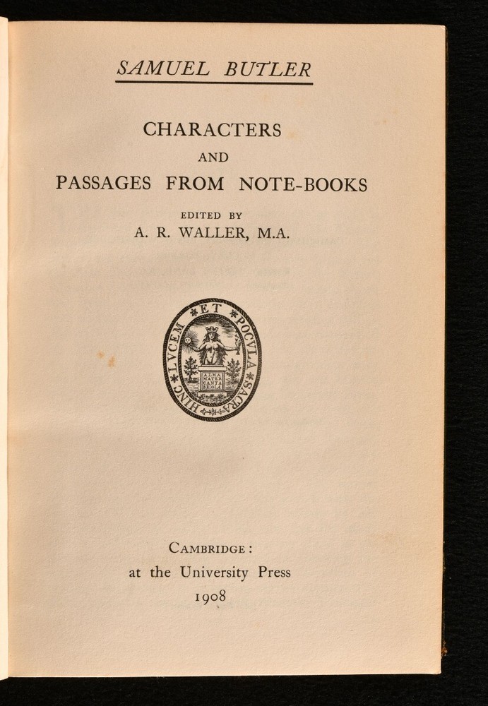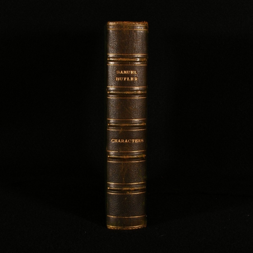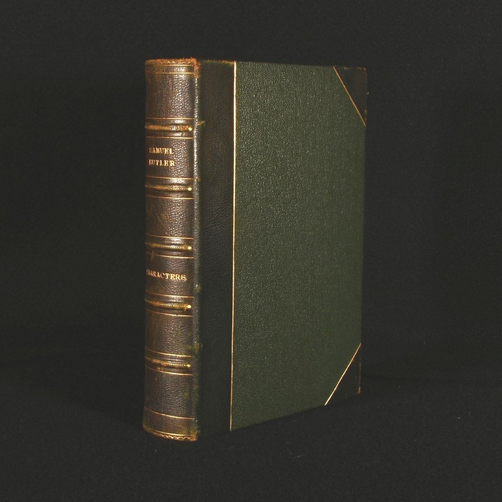 Click here to see our other books! Characters and Passages From Note-Books Samuel Butler 1908 Cambridge University Press : Cambridge 7.5" by 5" [4], v-xii, 489, [1pp] SUMMARY A nicely bound collection of character sketches by the noted poet and satirist Samuel Butler, an entertaining work on Stuart society. Leather Binding,Signed Binding Overall Condition: Very Good Indeed This book weighs 0.75 KG when packed UK Postage: £ 3.99 US Postage: £ 19.99 EU Postage : £ 15.99 European Postage: £ 16.99 Asia Postage: £ 21.99 Worldwide Postage: £ 25.99 DESCRIPTION In a signed binding by Palmer Howe & Co, Manchester. A selection of entertaining character sketches and short pieces of various subjects by Samuel Butler. Butler looks into the character and habits of various genres of people in society, such s politicians, philosophers, curious men, romance writers, rebels, and more. The miscellaneous pieces discuss truth, history, nature, ignorance, religion, and other equally interesting subjects. Edited with notes by A. R. Waller. Bookplate of William John Robertson to the front pastedown. CONDITION In a half morocco binding with cloth to the boards, a signed binding by Palmer Hower & Co. Externally, smart, with light rubbing to the boards and spine. Spine is a little faded. Bookplate to the front pastedown. Internally, firmly bound. Pages are bright and clean. Overall Condition: Very Good Indeed GLOSSARY OF TERMS Overall Condition (Dustwrapper condition rating is shown after that for the book itself, where a dustwrapper is present) Fine - Very well preserved copy showing very little wear Very Good Indeed - Only one or two minor faults, really a very attractive copy Very Good - Quite a wide term meaning no major faults but probably several smaller ones often expected given the age of the book, but still a respectable copy Good - Meaning not very good. Some more serious faults as will be described in the condition report under 'condition' Good Only - Meaning one or more faults that could really do with repair Fair - As with good only above but with other faults leaving a compromised copy even after repair Poor - Really bad and possibly seriously incomplete. We only sell books in this condition where their rarity or value makes them attractive none the less. Major defects will be described. GUARANTEE We offer a full money back guarantee on our descriptions. Please ask for details and conditions. We prefer PAYPAL. If you pay via PAYPAL we will post the item off the same or the next working day with the postage you have selected. Please note we cannot accept USD cheques