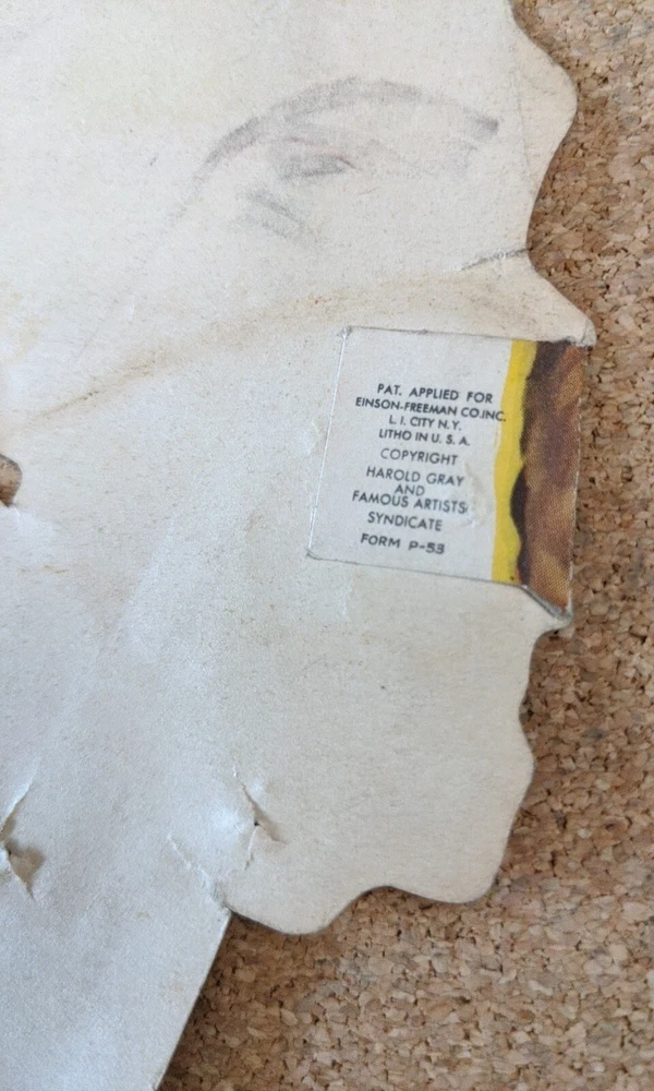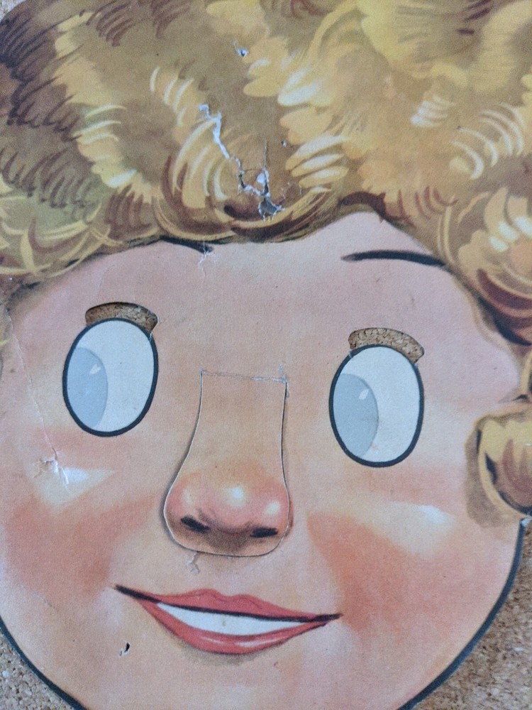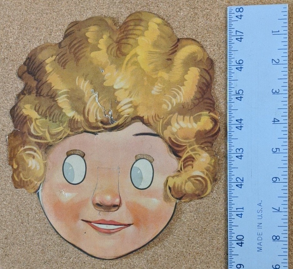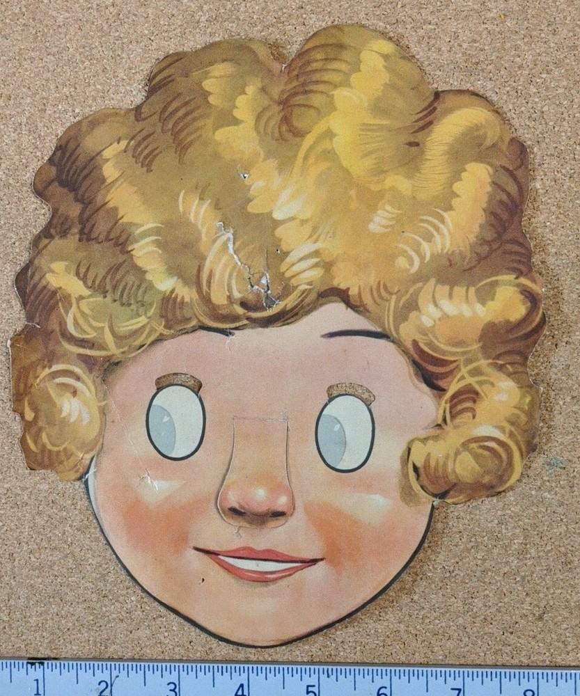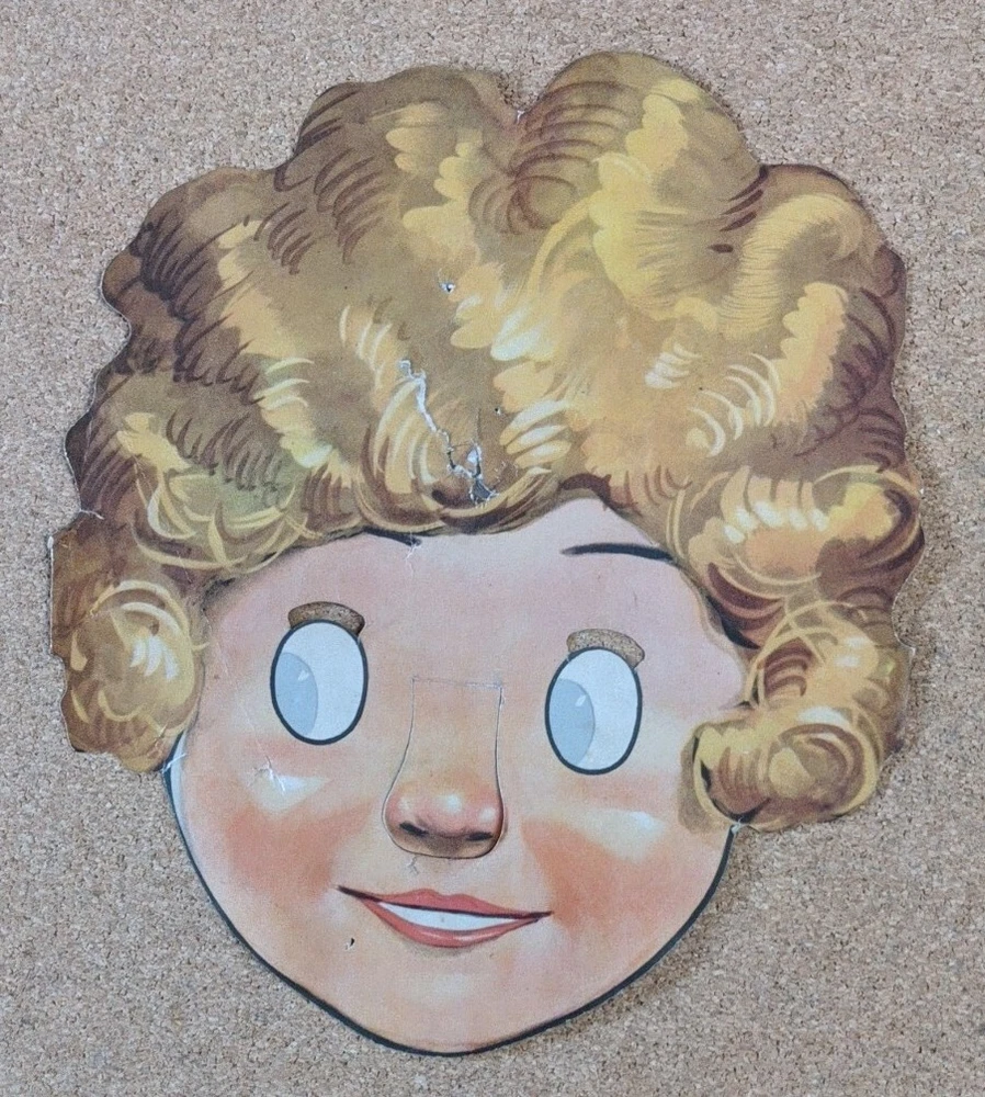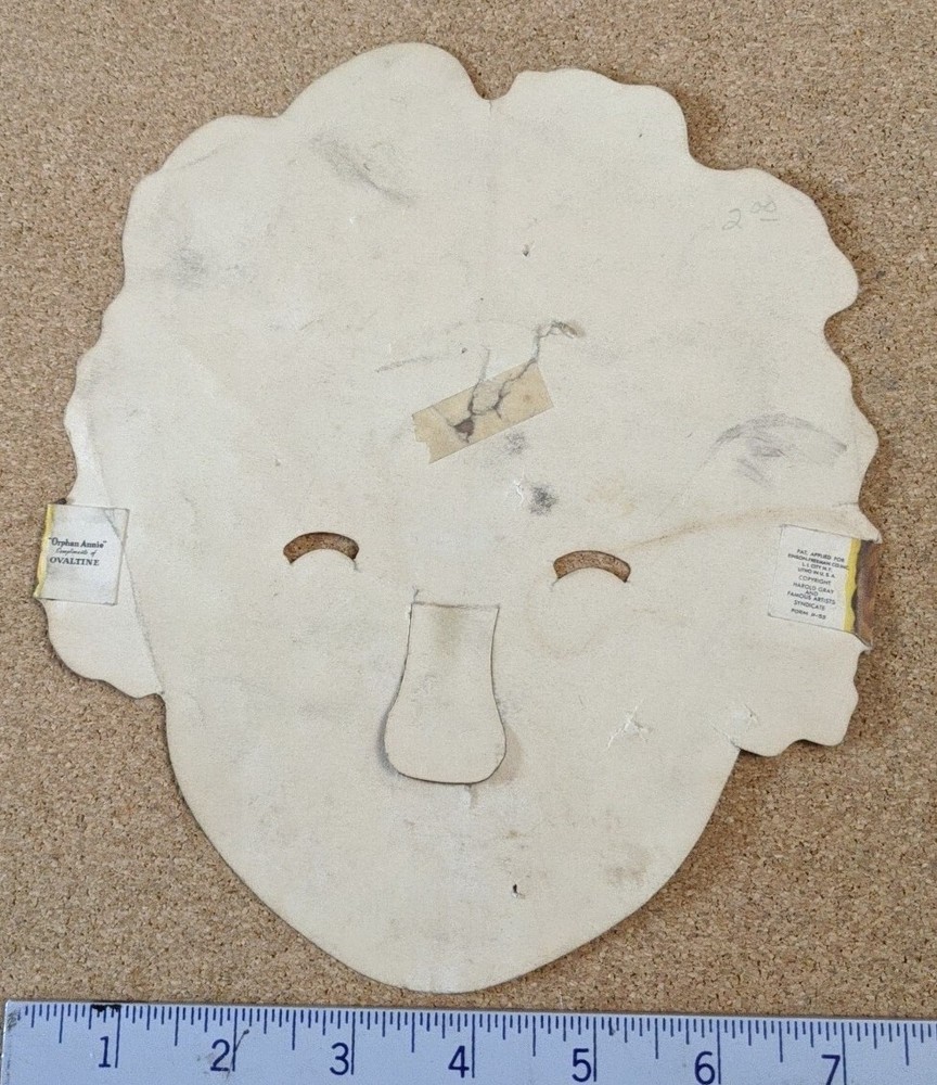 This vintage face mask features the beloved character Little Orphan Annie from the 1930s. The mask is designed in the shape of Annie's face and is made by the famous artists syndicate. It is a perfect addition to any collection of vintage toys and is suitable for children aged 4-7. The mask is in great shape and is a wonderful representation of Annie's iconic face. See pics for specifics. You will receive the exact item pictured. Shipped for free in the United States.
