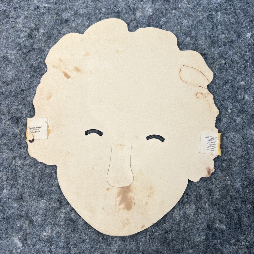 1930's LITTLE ORPHAN ANNIE FACE MASK Ovaltine Famous Artists Syndicate Mask in very good used condition Has some discoloration at back Front of mask has great color Please see photos Will be stored in a clean, dry, smoke-free environment Bagged and boarded and shipped in a stiff cardboard box