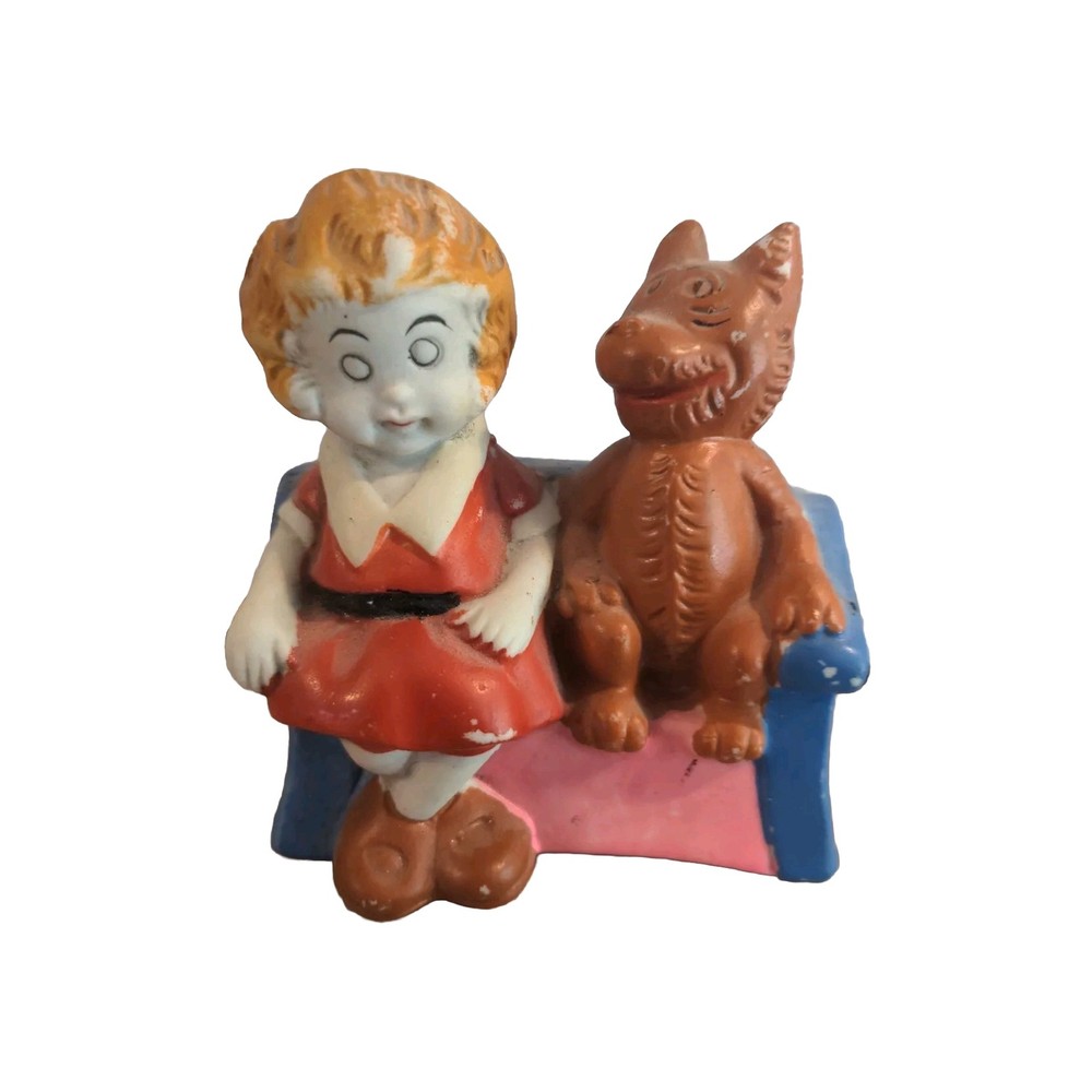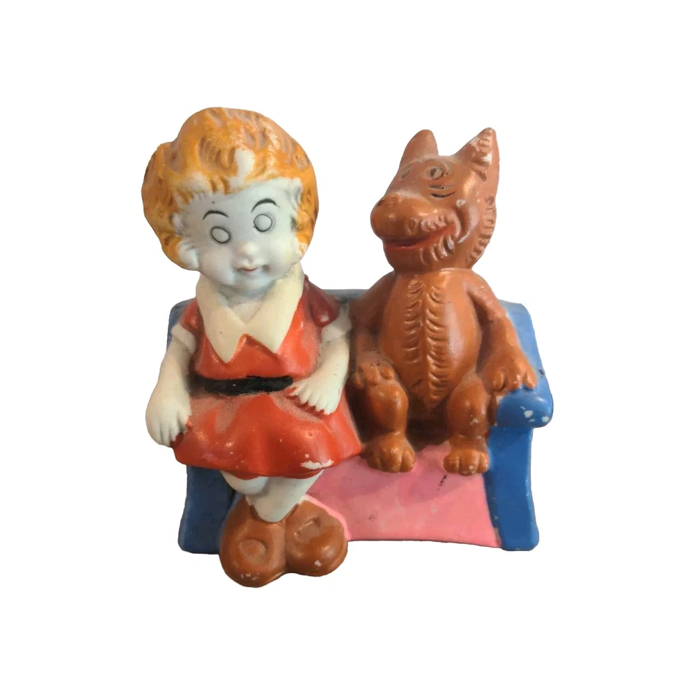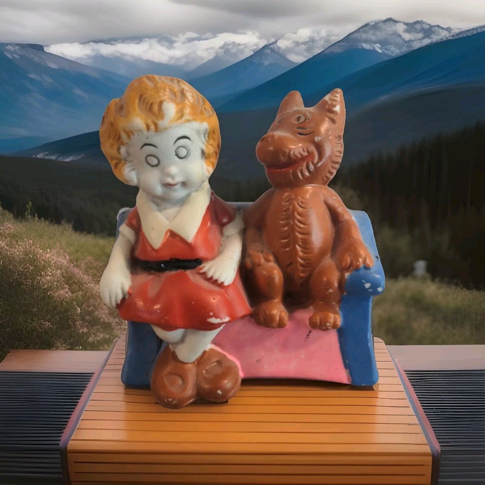This vintage toothbrush holder features the beloved character Orphan Annie and her friend Sandy. Made in Japan in the 1930s, it is a rare find for collectors of vintage toys and porcelain. The holder is made by the Famous Artist Syndicate and bears the number 6681. The design is exquisite and the details are intricate, making it a perfect addition to any collection. This item is a must-have for fans of Orphan Annie and vintage toys. Don't miss the chance to own this unique piece of history. Great overall condition for its age if you need more details or pictures please feel free to contact us. ..….