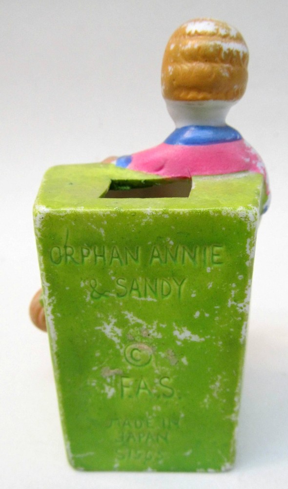 BID WITH CONFIDENCE We guarantee our merchandise. This is our 18th Year on Ebay, and we have sold well over 40,000 items! As with ALL of our auctions, this is the vintage, real McCoy. This is NOT a copy, NOT a modern day replica. Guaranteed authentic! 1930's LITTLE ORPHAN ANNIE and SANDY bisque figural toothbrush holder made in Japan. fully incised on back. designed to hold a single toothbrush. approx. 4" tall. there is a hairline firing crack made during manufacturing - in the base. no chips; no repairs. paint is nice but does show age wear. please view all the photos to make an intelligent decision on condition. YES we do combine shipping. DO NOT MAKE payment until we send a combined invoice to save you $$ on the shipping fees. insurance is required on all fragile items and all shipments over $100.00. to get insurance and tracking for foreign orders we must ship the package PRIORITY AIR all orders over $250 value are shipped SIGNATURE CONFIRMATION PLEASE do not make payment until you receive the updated invoice from me we have many more thousands of items in stock with lots of HYDROPLANE boat racing memorabilia. Please see our other EBAY listings this week. YES, we are happy to combine shipping on multiple wins. Yes, you can stop by the store and pick your winnings up in person. Google GASOLINE ALLEY ANTIQUES in Seattle Washington to learn more about us and to get our address and store hours. Please read the above description, and the following rules COMPLETELY. Thank you. YES, we do combine multiple wins! COMMENTS: NO RESERVE unless stated otherwise! Please do not bid, until you have read the SHIPPING charge, which is NOT negotiable. THANK YOU! We are HAPPY to ship to ANYWHERE in the World. We are not liable for shipping delays due to Customs or Foreign Postal Services. Please note: we are a licensed retailer in Washington State. All orders shipped to Washington State addresses will be charged the appropriate Sales Tax, unless a signed Resale Certificate form is supplied. If you do not agree with these terms, then please refrain from bidding. Your bids are always welcome! If you win multiple items, they can be combined to save on shipping. Questions email us for the Answers! Who are we We invite you to Stop by & Visit. We have been full time MEMORABILIA DEALERS since 1974! We offer THOUSANDS of similar items for collectors around the world. See ALL our Great eBay auctions: Thank You and GOOD LUCK!