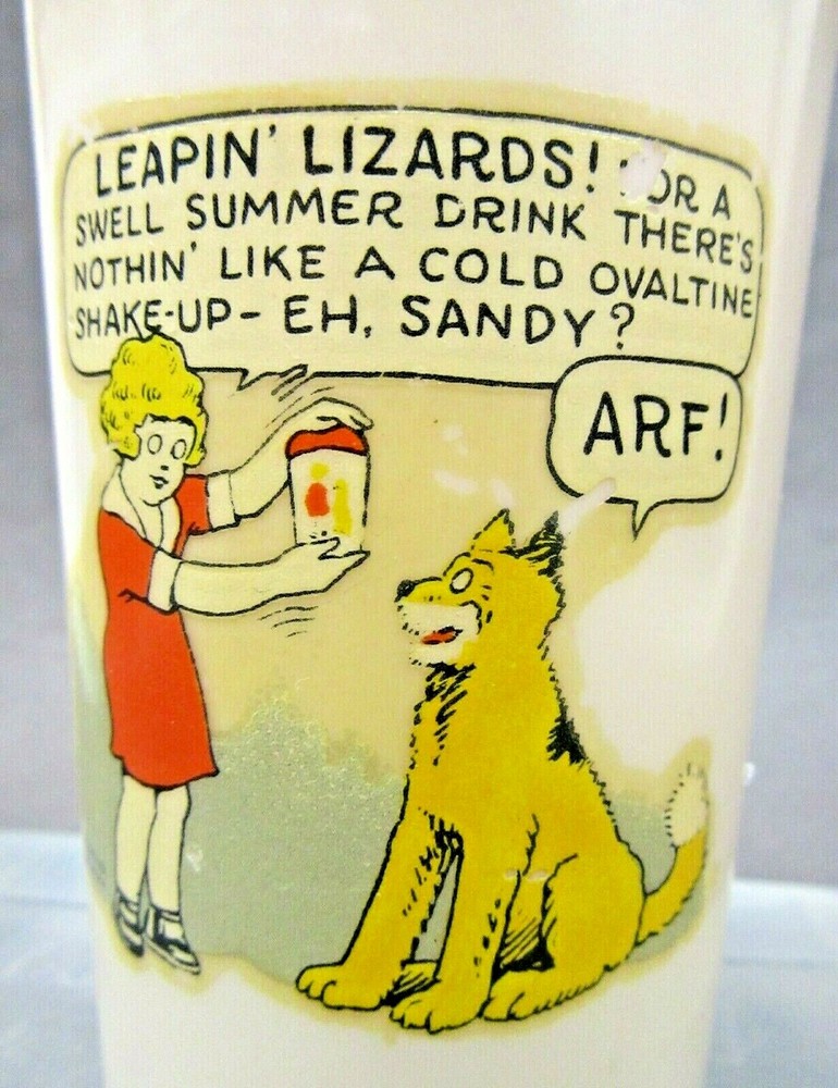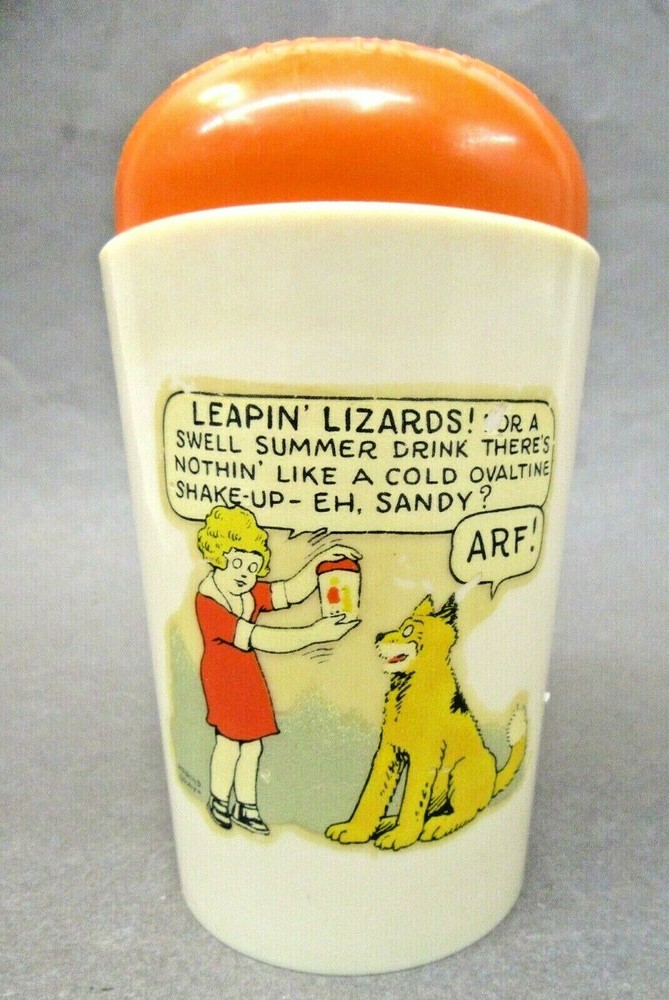 BID WITH CONFIDENCE We guarantee our merchandise. This is our 18th Year on Ebay, and we have sold well over 40,000 items! As with ALL of our auctions, this is the vintage, real McCoy. This is NOT a copy, NOT a modern day replica. Guaranteed authentic! 1930's LITTLE ORPHAN ANNIE white full figure Ovaltine Shake Up Mug cup premium version with FULL figures of Annie and Sandy mail-in premium from Ovaltine made by Beetleware for the Wander Co. creamy white with orange top approx. 5" tall overall decal has a few minor nicks colors are strong please view all the photos to make an intelligent decision on condition. YES we do combine shipping. DO NOT MAKE payment until we send a combined invoice to save you $$ on the shipping fees. insurance is required on all fragile items and all shipments over $100.00. to get insurance and tracking for foreign orders we must ship the package PRIORITY AIR all orders over $250 value are shipped SIGNATURE CONFIRMATION PLEASE do not make payment until you receive the updated invoice from me we have many more thousands of items in stock. Please see our other EBAY listings this week. YES, we are happy to combine shipping on multiple wins. Yes, you can stop by the store and pick your winnings up in person. Google GASOLINE ALLEY ANTIQUES in Seattle Washington to learn more about us and to get our address and store hours. Please read the above description, and the following rules COMPLETELY. Thank you. YES, we do combine multiple wins! COMMENTS: NO RESERVE unless stated otherwise! Please do not bid, until you have read the SHIPPING charge, which is NOT negotiable. THANK YOU! We are HAPPY to ship to ANYWHERE in the World. We are not liable for shipping delays due to Customs or Foreign Postal Services. Please note: we are a licensed retailer in Washington State. All orders shipped to Washington State addresses will be charged the appropriate Sales Tax, unless a signed Resale Certificate form is supplied. If you do not agree with these terms, then please refrain from bidding. Your bids are always welcome! If you win multiple items, they can be combined to save on shipping. Questions email us. Who are we We invite you to Stop by & Visit. We have been full time MEMORABILIA DEALERS since 1974! We offer THOUSANDS of similar items for collectors around the world. See ALL our Great eBay auctions: Thank You and GOOD LUCK!
