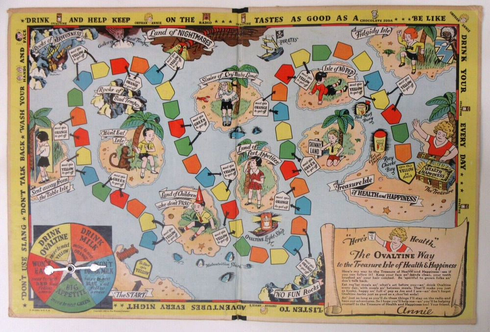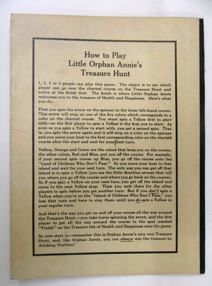 BID WITH CONFIDENCE We guarantee our merchandise. This is our 18th Year on Ebay, and we have sold well over 40,000 items! As with ALL of our auctions, this is the vintage, real McCoy. This is NOT a copy, NOT a modern day replica. Guaranteed authentic! 1930's LITTLE ORPHAN ANNIE's TREASURE HUNT Game Board Ovaltine radio premium mail-in premium from Ovaltine very colorful with built-in spinner bifold when opened it measures approx. 16" by 11" colors are strong and bright backside shows age wear minor warpage please view all the photos to make an intelligent decision on condition. YES we do combine shipping. DO NOT MAKE payment until we send a combined invoice to save you $$ on the shipping fees. insurance is required on all fragile items and all shipments over $100.00. to get insurance and tracking for foreign orders we must ship the package PRIORITY AIR all orders over $250 value are shipped SIGNATURE CONFIRMATION PLEASE do not make payment until you receive the updated invoice from me we have many more thousands of items in stock. Please see our other EBAY listings this week. YES, we are happy to combine shipping on multiple wins. Yes, you can stop by the store and pick your winnings up in person. Google GASOLINE ALLEY ANTIQUES in Seattle Washington to learn more about us and to get our address and store hours. Please read the above description, and the following rules COMPLETELY. Thank you. YES, we do combine multiple wins! COMMENTS: NO RESERVE unless stated otherwise! Please do not bid, until you have read the SHIPPING charge, which is NOT negotiable. THANK YOU! We are HAPPY to ship to ANYWHERE in the World. We are not liable for shipping delays due to Customs or Foreign Postal Services. Please note: we are a licensed retailer in Washington State. All orders shipped to Washington State addresses will be charged the appropriate Sales Tax, unless a signed Resale Certificate form is supplied. If you do not agree with these terms, then please refrain from bidding. Your bids are always welcome! If you win multiple items, they can be combined to save on shipping. Questions email us. Who are we We invite you to Stop by & Visit. We have been full time MEMORABILIA DEALERS since 1974! We offer THOUSANDS of similar items for collectors around the world. See ALL our Great eBay auctions: Thank You and GOOD LUCK!