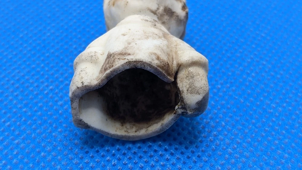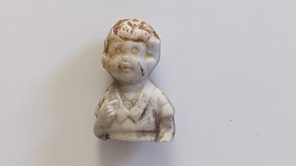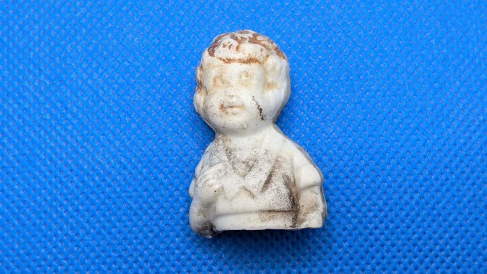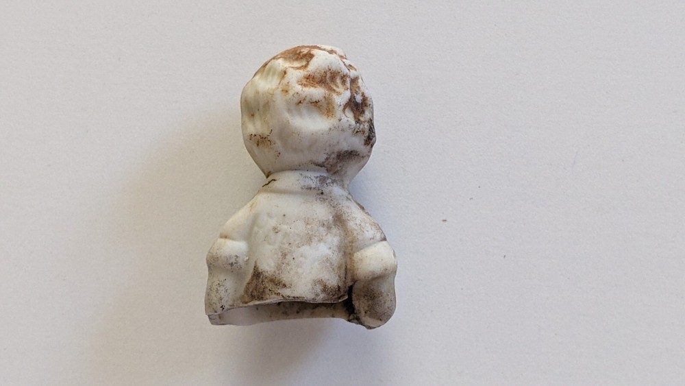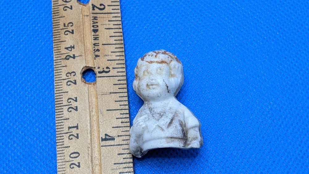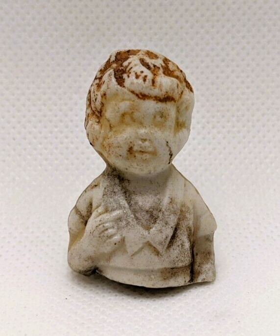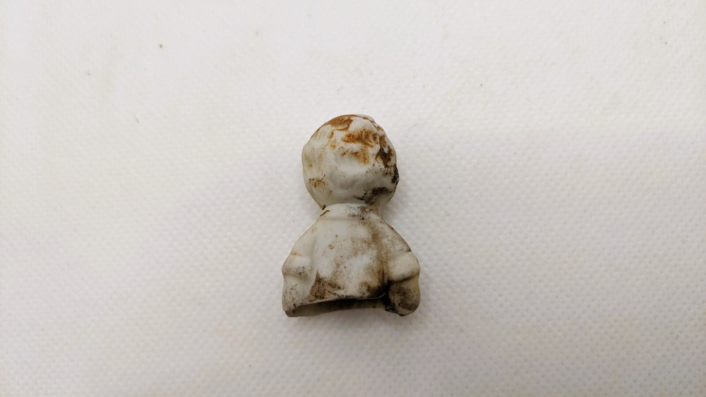 This is a vintage 1930s Little Orphan Annie bisque doll, originally part of a boxed set by Famous Artists Syndicate, George Borgfeldt Corporation, made in Japan. It appears to be marked on the back but its illegible. The antique china doll was found in a field behind an old home in Virginia more than 40 years ago. The miniature Annie figure was discovered broken in half, with only the top half of the doll, waist up, remaining. (See Photos) Remaining portion measures about 1.5" tall x 1" wide. These dolls were hand-painted, each being slightly different and only traces of the original paint remain on this doll. The antique doll was likely produced as a promotional offering for the Little Orphan Annie radio broadcast. The doll is sold as is.