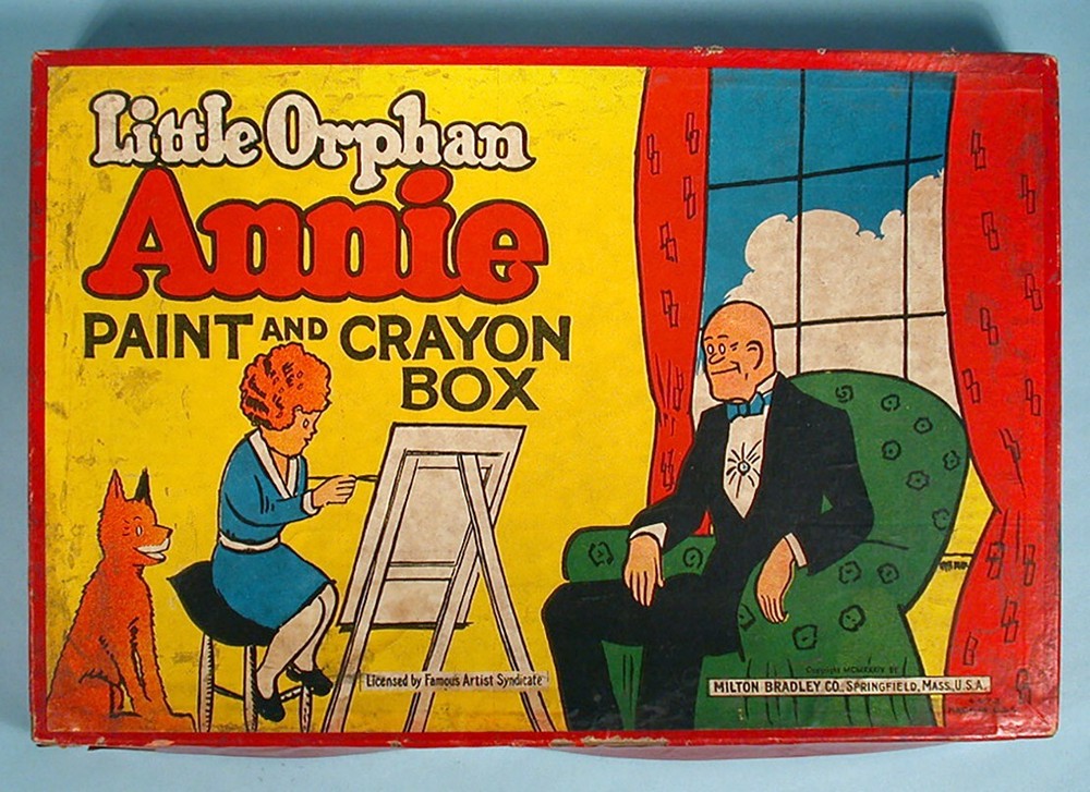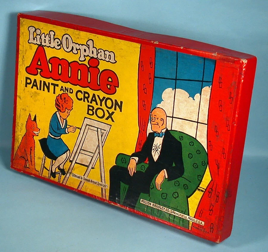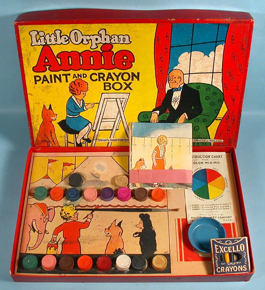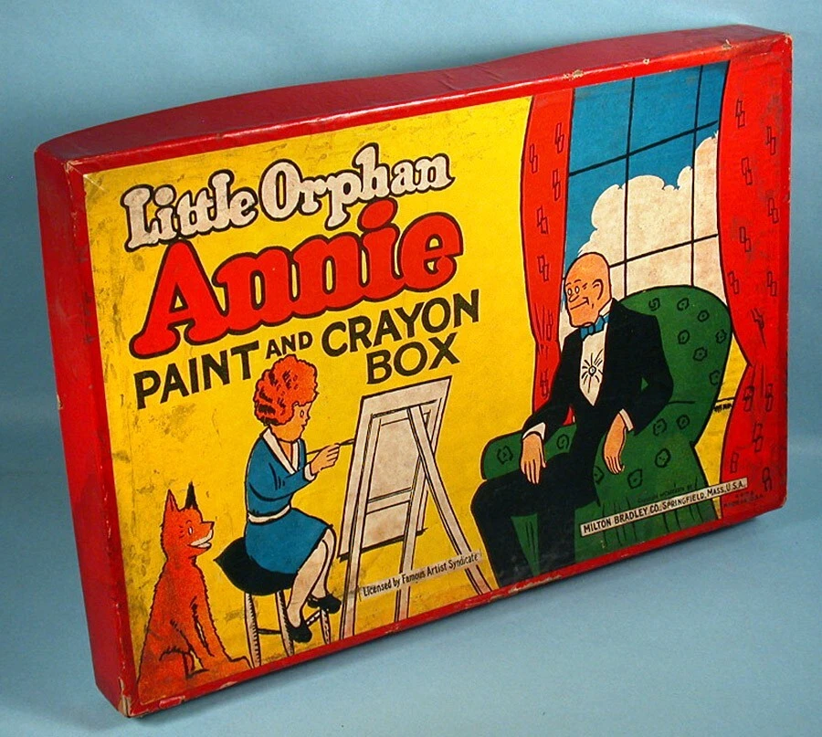 "LITTLE ORPHAN ANNIE PAINT AND CRAYON BOX" COLORING SET – (c)1934 Milton Bradley Co. / Famous Artist Syn. No. 4473. 14.5" x 9.5" x 1.25" colorful graphic box. NOTE: Box art was used for several paint set variations (this being the scarcer of the sets). Includes graphic inner-box insert, 18 color blocks (still adhered to insert), 1 tin mixing bowl, assorted used boxed crayons (in pieces & adhered together), color mixing chart, paint brush, and 5 paint sheets (Harold Gray art, 4 partially colored). NOTE: Crayon box is marked "Excello Crayons, The Saalfield Publishing Company". They are from the 1930s period but not original to the set. A well-designed paint assortment with great eye appeal. Condition is considered FAIR with miscellaneous surface/stain/edge wear. Box sides is mildly warped with misc. surface scuffing & creasing. One corner separation on lower left box lid with some side red paper torn/missing (mainly from bottom side area). Varying degrees of inner-box litho surface pulls. Though apparent, we feel these defects do not overshadow the overall graphic integrity by most standards. Box colors / graphics are still bold, bright and attractive (see photos). An uncommon set. This scarce item would make a nice LITTLE ORPHAN ANNIE display for the discriminating VINTAGE COMIC CHARACTER TOY enthusiast. On a condition code scale of 1 to 10, the above listed item(s) rated - (7-6). U.S.A. BUYERS and/or BIDDERS ONLY - Sorry, no International or Canada purchases and/or bids accepted. FREE SHIPPING - Includes USPS (U.S. Postal Service) Priority Mail and Delivery Confirmation to Continental United States ONLY (48 states and Washington, D.C.). LOCAL AREA BUYERS - Requests are NOT taken for buyer to "pick the item up". PAYMENT METHOD - PayPal accepted. MARYLAND STATE SALES TAX - Add 6% state sales tax for Maryland residents and items delivered to Maryland. User of Maryland Sales Tax Registration Number submit a signed Maryland Certificate of Resale. PAYMENT DUE - Item(s) held for (7) days. INSURANCE CLAIMS - If a problem occurs AFTER our mailing the item(s) in regards to the delivery process, buyer is responsible for notifying their local Post Office to start a search and/or file an insurance claim. RETURN POLICY - Item(s) may be returned for a refund if received back by our company in its original condition (30) days from the date delivered. Merchandise must be packed in the original packaging and free return shipping paid by the seller. If item arrives back to our company damaged due to buyer's negligence, a full refund will not be issued. QUESTIONS WELCOMED - While reading about item for sale and viewing photos, e-mail questions regarding further item description and/or company terms. THANK YOU FOR YOUR PURCHASE! PLEASE SEE OUR COMPLETE INVENTORY IN OUR EBAY STORE!
