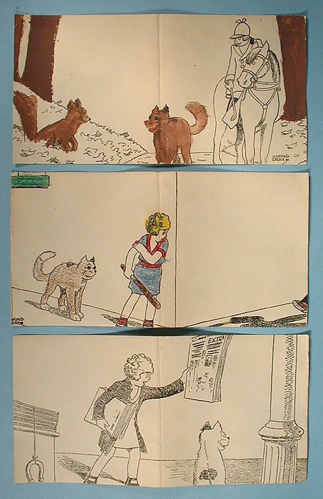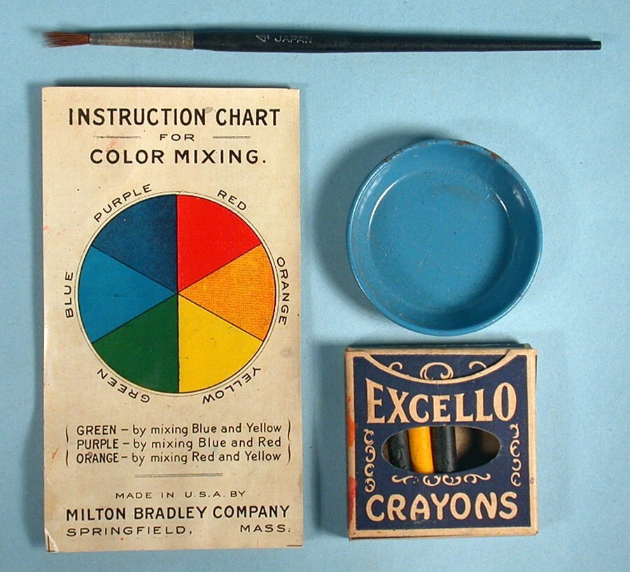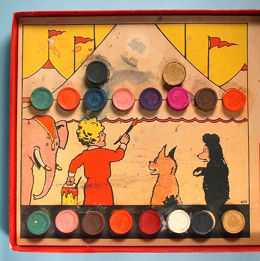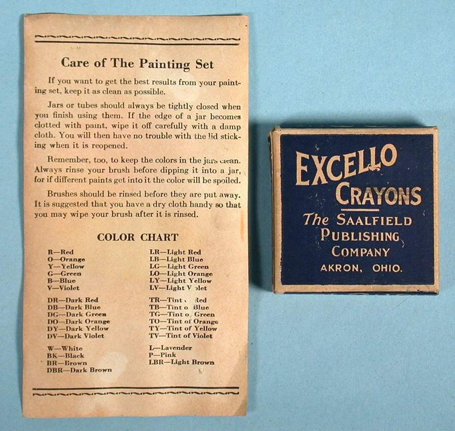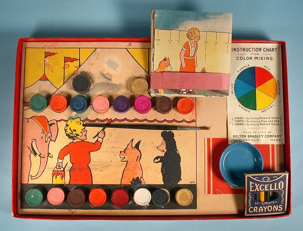 "LITTLE ORPHAN ANNIE PAINT AND CRAYON BOX" COLORING SET – (c)1934 Milton Bradley Co. / Famous Artist Syn. No. 4473. 14.5" x 9.5" x 1.25" colorful graphic box. NOTE: Box art was used for several paint set variations (this being the scarcer of the sets). Includes graphic inner-box insert, 18 color blocks (still adhered to insert), 1 tin mixing bowl, assorted used boxed crayons (in pieces & adhered together), color mixing chart, paint brush, and 5 paint sheets (Harold Gray art, 4 partially colored). NOTE: Crayon box is marked "Excello Crayons, The Saalfield Publishing Company". They are from the 1930s period but not original to the set. A well-designed paint assortment with great eye appeal. Condition is considered FAIR with miscellaneous surface/stain/edge wear. Box sides is mildly warped with misc. surface scuffing & creasing. One corner separation on lower left box lid with some side red paper torn/missing (mainly from bottom side area). Varying degrees of inner-box litho surface pulls. Though apparent, we feel these defects do not overshadow the overall graphic integrity by most standards. Box colors / graphics are still bold, bright and attractive (see photos). An uncommon set. This scarce item would make a nice LITTLE ORPHAN ANNIE display for the discriminating VINTAGE COMIC CHARACTER TOY enthusiast. On a condition code scale of 1 to 10, the above listed item(s) rated - (7-6). U.S.A. BUYERS and/or BIDDERS ONLY - Sorry, no International or Canada purchases and/or bids accepted. FREE SHIPPING - Includes USPS (U.S. Postal Service) Priority Mail and Delivery Confirmation to Continental United States ONLY (48 states and Washington, D.C.). LOCAL AREA BUYERS - Requests are NOT taken for buyer to "pick the item up". PAYMENT METHOD - PayPal accepted. MARYLAND STATE SALES TAX - Add 6% state sales tax for Maryland residents and items delivered to Maryland. User of Maryland Sales Tax Registration Number submit a signed Maryland Certificate of Resale. PAYMENT DUE - Item(s) held for (7) days. INSURANCE CLAIMS - If a problem occurs AFTER our mailing the item(s) in regards to the delivery process, buyer is responsible for notifying their local Post Office to start a search and/or file an insurance claim. RETURN POLICY - Item(s) may be returned for a refund if received back by our company in its original condition (30) days from the date delivered. Merchandise must be packed in the original packaging and free return shipping paid by the seller. If item arrives back to our company damaged due to buyer's negligence, a full refund will not be issued. QUESTIONS WELCOMED - While reading about item for sale and viewing photos, e-mail questions regarding further item description and/or company terms. THANK YOU FOR YOUR PURCHASE! PLEASE SEE OUR COMPLETE INVENTORY IN OUR EBAY STORE!