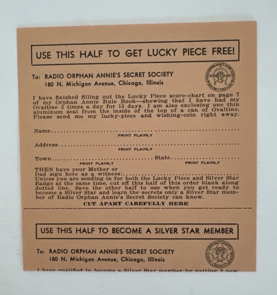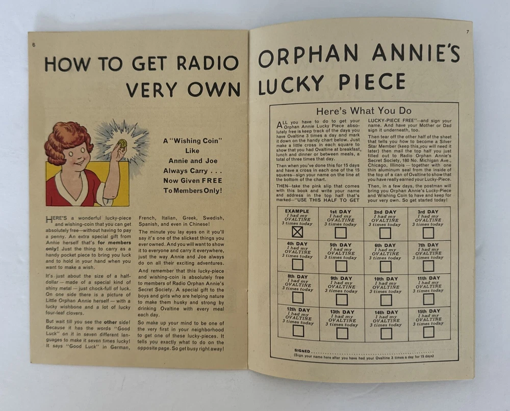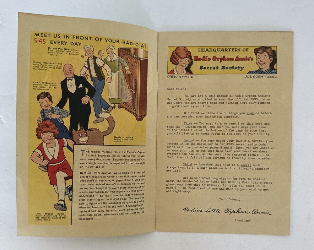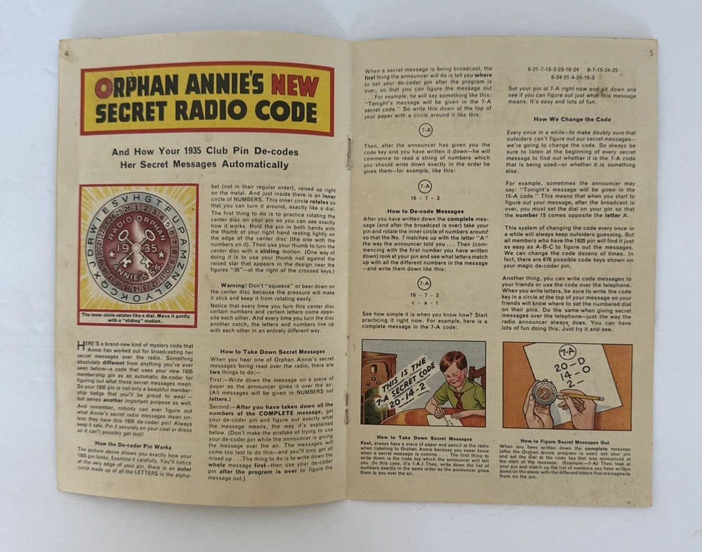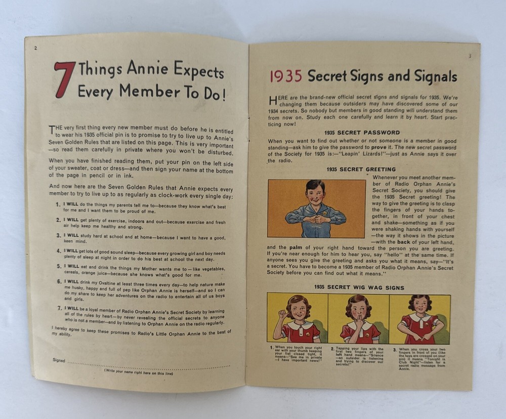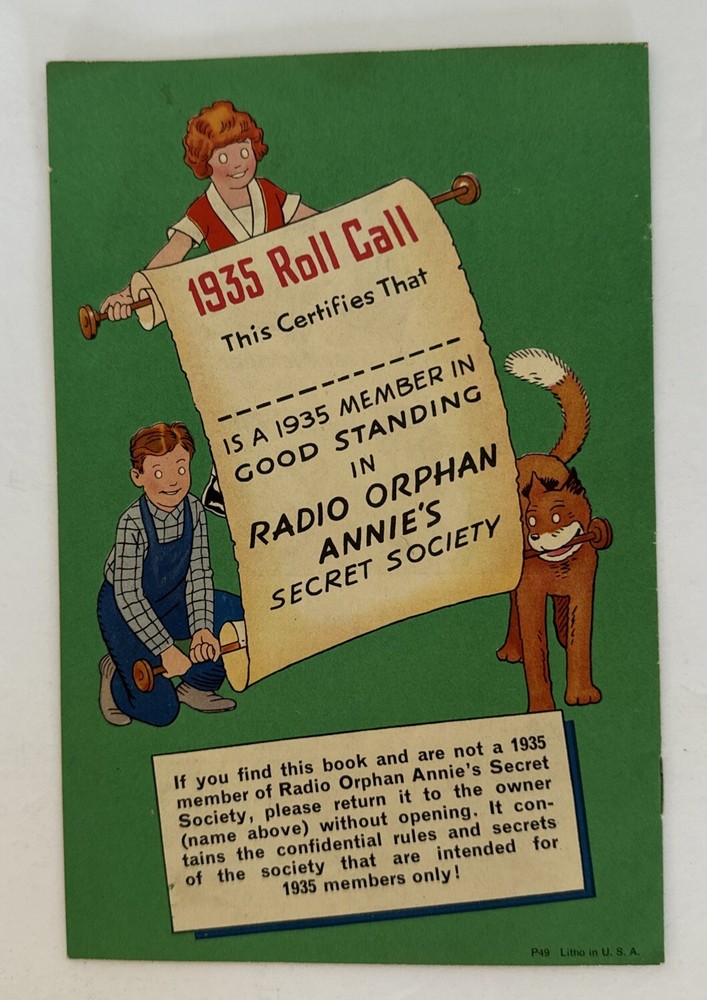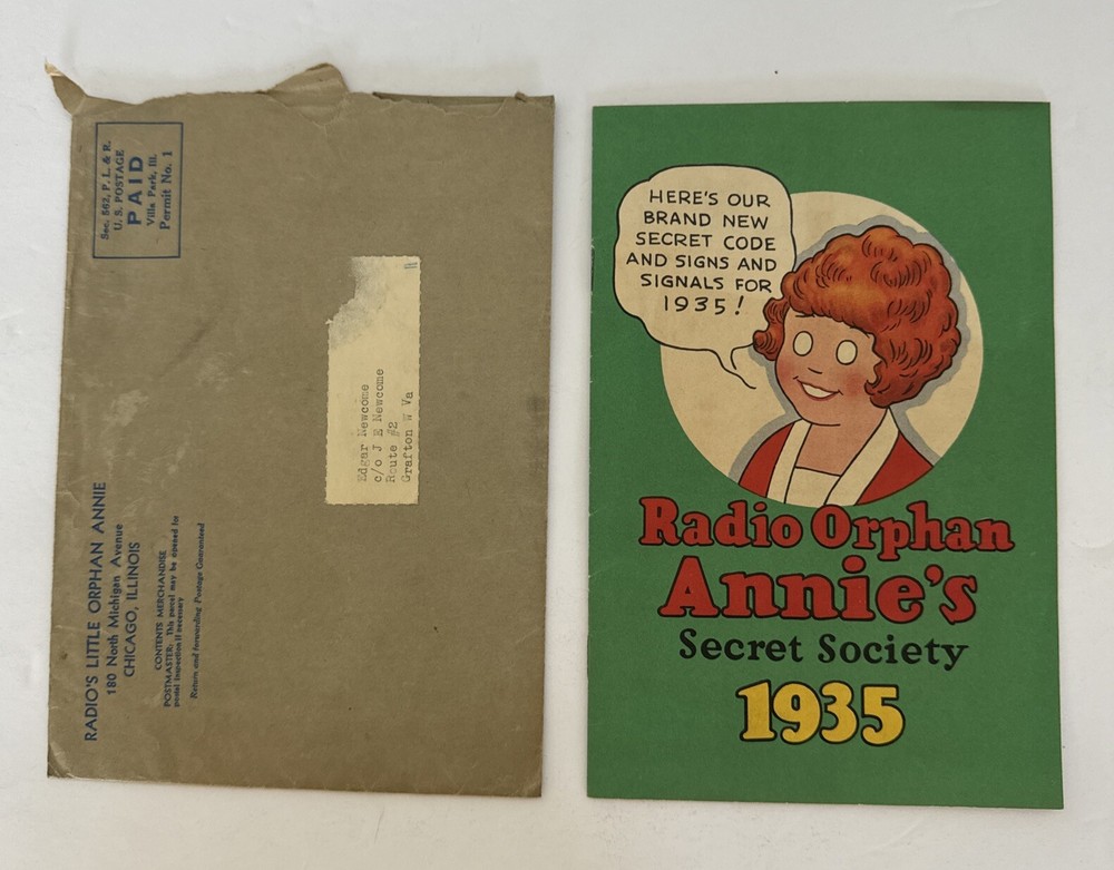 This is a vintage 1935 Radio Orphan Annie's Secret Society OVALTINE Signs Signals Book with an envelope. The book contains signs and signals for use with the included envelope. The brand is Character and the character is Annie. It was manufactured in the United States and is suitable for ages 12-16 years and 17 years & up. The character family is Orphan Annie. This item is perfect for collectors of vintage toys and fans of the classic radio show. Please see pictures of this highly sought after piece. Thanks for visiting !!