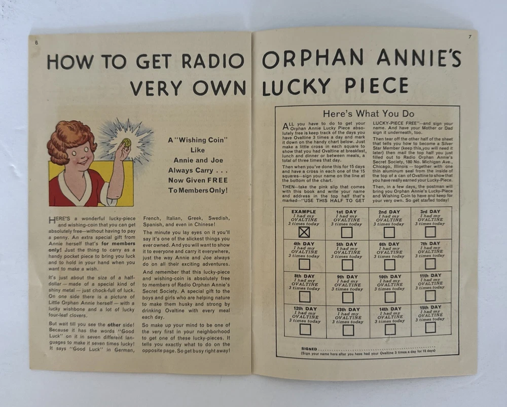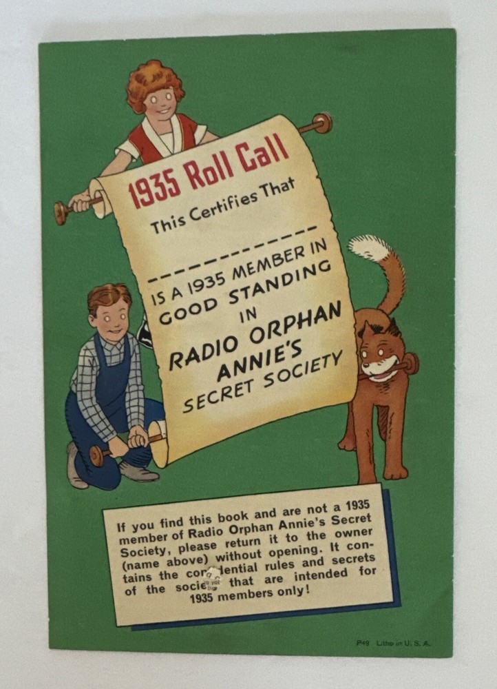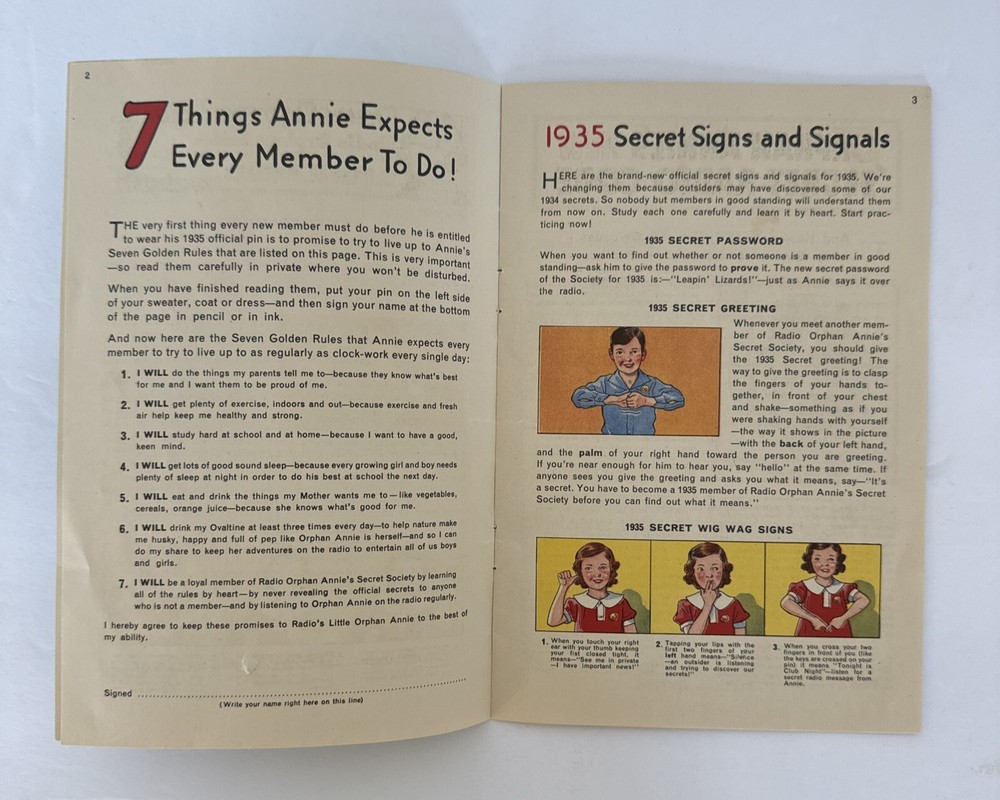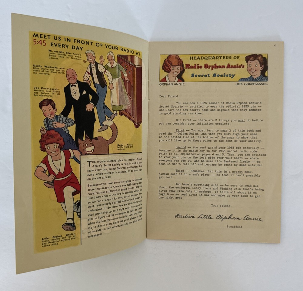 This is a vintage 1935 Radio Orphan Annie's Secret Society OVALTINE Signs Signals Book with an envelope. The book contains signs and signals for use with the included envelope. The brand is Character ...