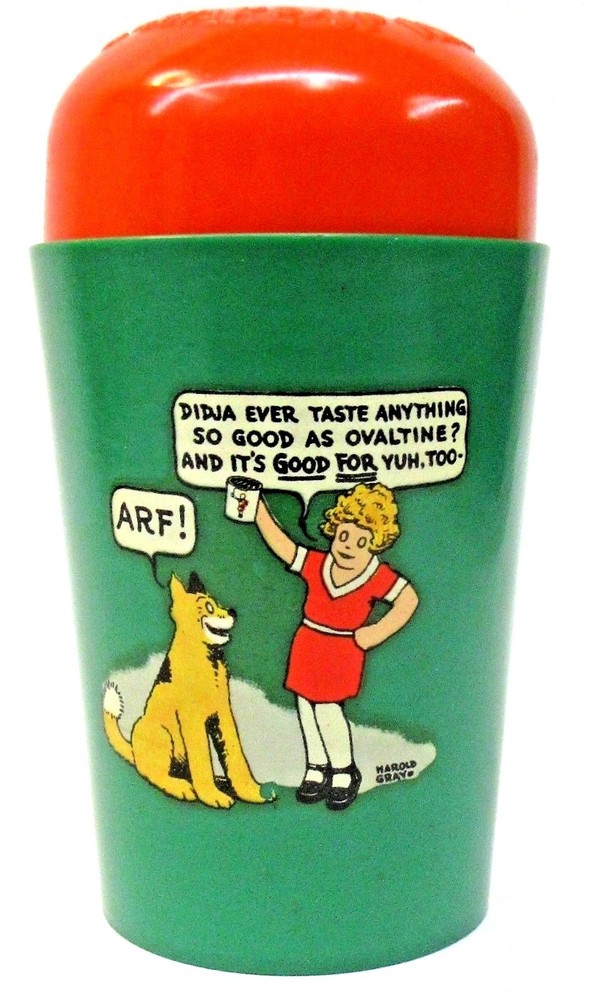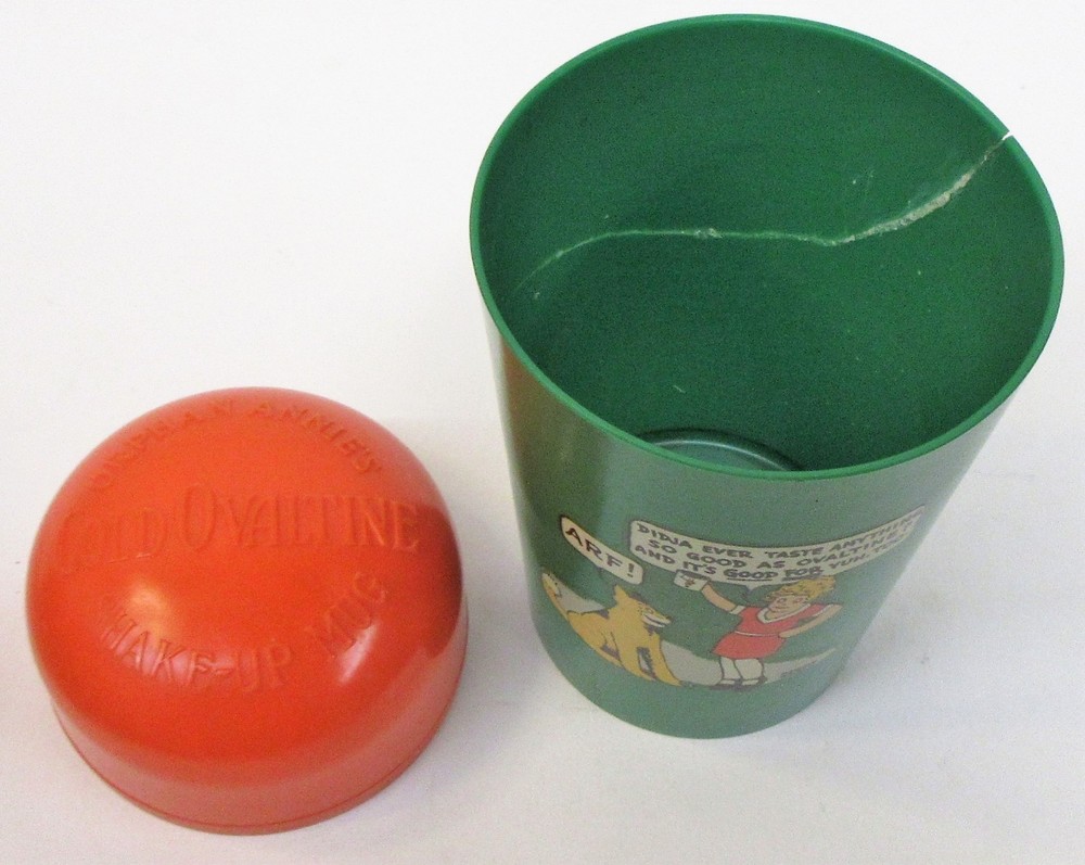 PURCHASE WITH CONFIDENCE We guarantee our merchandise. We have been on EBAY for over 25 Years and we have sold Tens of Thousands of items! As with ALL of our listings that unless stated otherwise, this is the vintage, real McCoy. This is NOT a copy, NOT a modern day replica. Guaranteed authentic! 1939 LITTLE ORPHAN ANNIE green FULL FIGURES Ovaltine Shake Up Mug cup premium rare style NOTE that it has been broken and glued together on reverse still displays beautifully green version with FULL FIGURES decal mail-in premium from Ovaltine made by Beetleware for the Wander Co. with orange top approx. 5" tall overall decal complete and intact colors are strong please view all the photos to make an intelligent decision on condition. YES we do combine shipping. DO NOT MAKE payment until we send a combined invoice to save you $$ on the shipping fees. insurance is required on all fragile items and all shipments over $100.00. to get insurance and tracking for foreign orders we must ship the package PRIORITY AIR all orders over $250 value are shipped SIGNATURE CONFIRMATION PLEASE do not make payment until you receive the updated invoice from me we have many more thousands of items in stock. Please see our other EBAY listings this week. YES, we are happy to combine shipping on multiple wins. Yes, you can stop by the store and pick your winnings up in person. Google GASOLINE ALLEY ANTIQUES in Seattle Washington to learn more about us and to get our address and store hours. Please read the above description, and the following rules COMPLETELY. Thank you. YES, we do combine multiple wins! COMMENTS: NO RESERVE unless stated otherwise! Please do not bid, until you have read the SHIPPING charge, which is NOT negotiable. THANK YOU! We are HAPPY to ship to ANYWHERE in the World. We are not liable for shipping delays due to Customs or Foreign Postal Services. Please note: we are a licensed retailer in Washington State. All orders shipped to Washington State addresses will be charged the appropriate Sales Tax, unless a signed Resale Certificate form is supplied. If you do not agree with these terms, then please refrain from bidding. Your bids are always welcome! If you win multiple items, they can be combined to save on shipping. Questions email us. Who are we We invite you to Stop by & Visit. We have been full time MEMORABILIA DEALERS since 1974! We offer THOUSANDS of similar items for collectors around the world. See ALL our Great eBay auctions: Thank You and GOOD LUCK!
