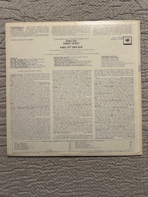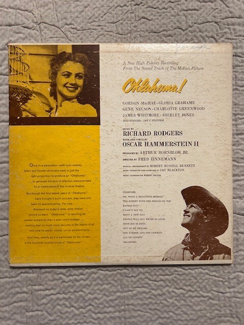 Lot of 4 Vintage Broadway Musical Vinyl LP Albums Consisting of: 1955 Rogers and Hammersteins's Oklahoma! Sound Track of the Motion Picture - ink notation on back of cardboard sleeve 1963 Annie Get Your Gun (Doris Day and Robert Goulet) - missing original inner paper sleeve 1964 My Fair Lady - The Original Sound Track Recording starring Audrey Hepburn and Rex Harrison - missing original inner paper sleeve 1967 Oliver! - The Pickwick Children's Chorus and Orchestra - 2 stickers on cellophane wrap Condition averages about very good to excellent, with issues noted above.