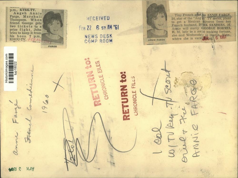 ebay template 1961 Press Photo Actress Annie Fargé with Joyeux Noël sign - tup18022 This is an original press photo. Tiny French actress Annie Fargé, 24, star of the "Angel" TV series, plans to get a Mexican divorce from her French husband, Dirk Sanders, 26. Annie will marry George Hormel II, 33, heir to a meat packing fortune, she said Wednesday in Austin, Minnesota, where she is vacationingPhoto measures 7 x 9.25inches. Photo is dated 02-22-1961. Part Number: tup18022 Please look at the images below carefully to determine the condition of this vintage photograph, as it may not be in perfect condition. It may contain wrinkles, cracks, and possibly even tears due to its age and how it was handled before it got to us. A scanner may see a photograph differently than human eyes will, so it is possible that the actual photograph may be slightly darker or lighter in person. This vintage photograph is offered for sale as a collectible item and conveys no transfer of copyright. PHOTO FRONT PHOTO BACK Sell Smarter with Kyozou. Inventory and Ecommerce Management