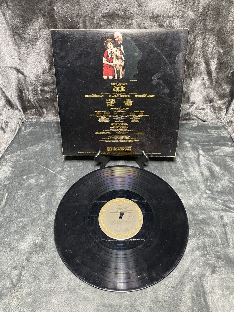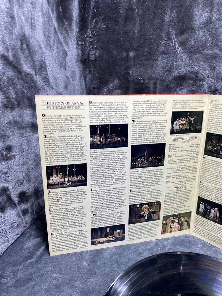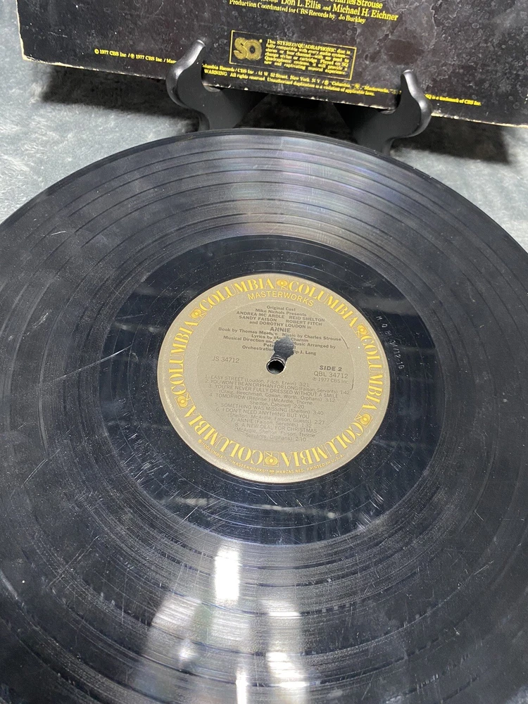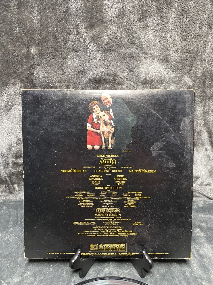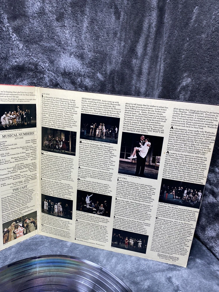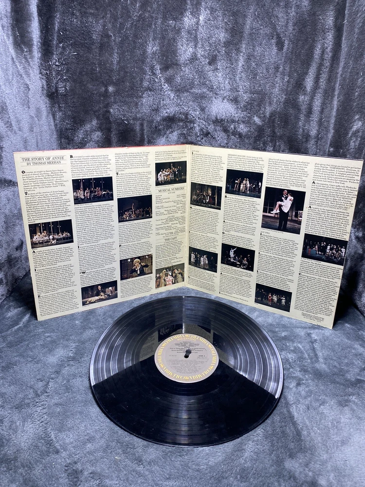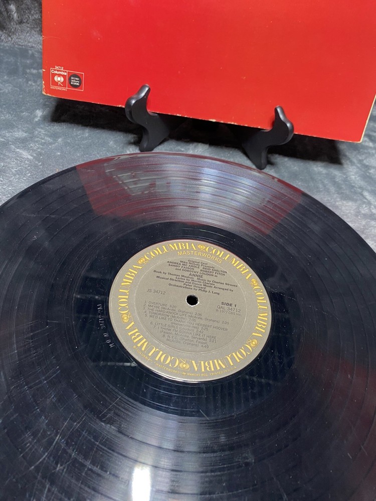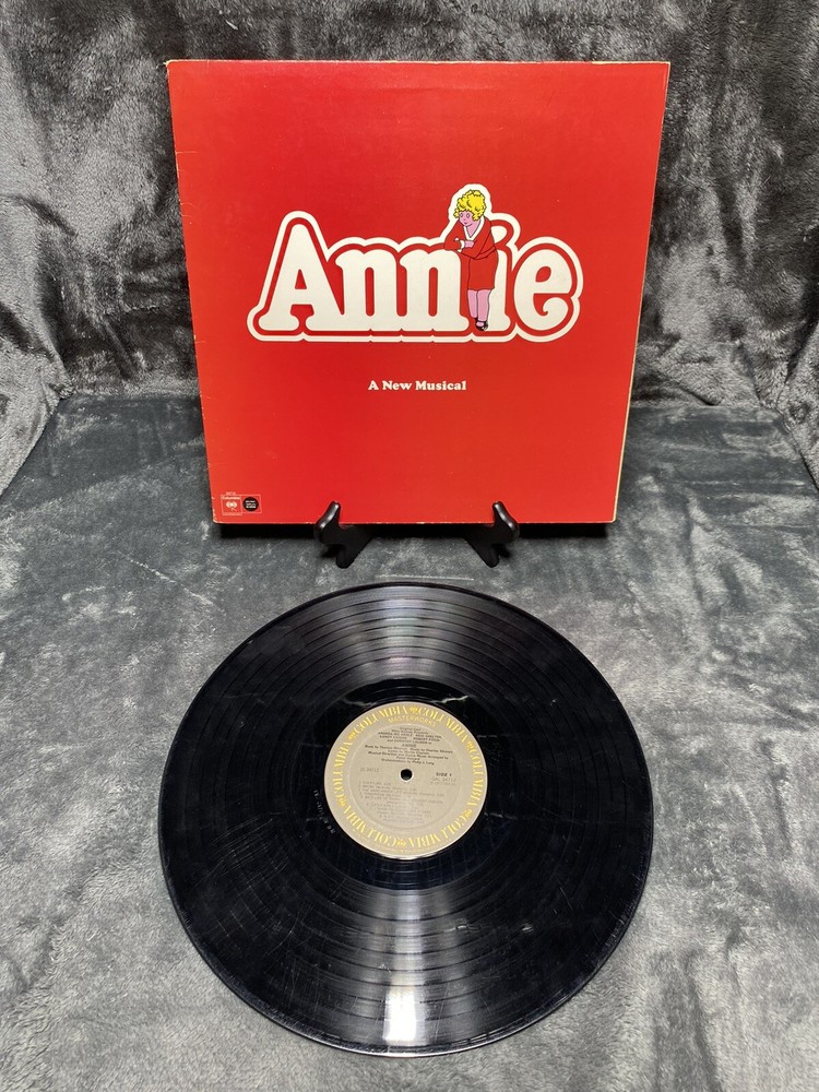 This is a 1977 LP vinyl record of the original Broadway cast recording of Annie - A New Musical. The album comes in a cardboard sleeve and is a first pressing, with a record size of 12 inches and a speed of 33 RPM. The vinyl is graded as Very Good (VG), while the sleeve is also Very Good (VG). The record label is Masterworks and the release year is 1977. The musical falls under the genres of Soundtracks & Musicals and Broadway. The country of manufacture is the United States. The aspects of the record include the artist, which is the Original Broadway Cast, the material which is vinyl, and the style which is Musicals and Musical/Original Cast from the 1970s.