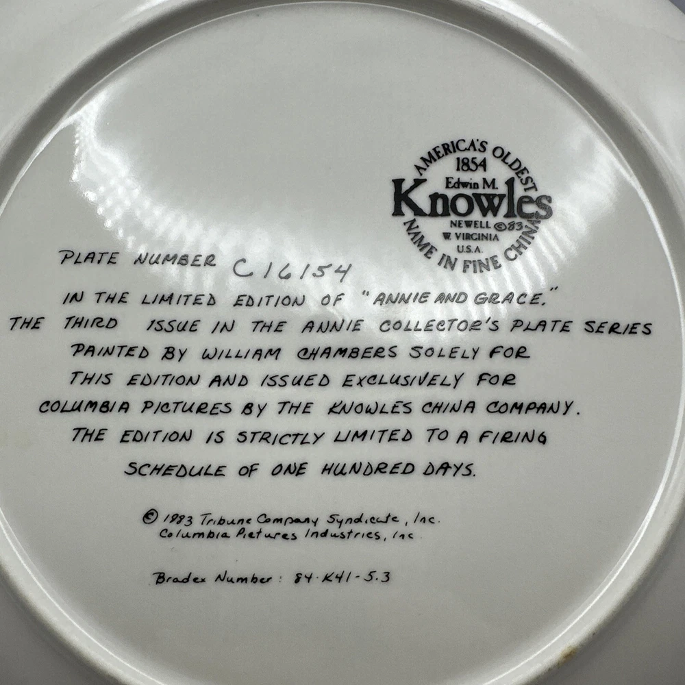 1983 "Annie and Grace" 3rd in Annie Collector Plate Series from Knowles Ships: US Postal Service, unless difference paid by buyer or there is a better pricing option for the seller. Combined Shipping: Will combine shipping for the purchase of multiple items on a single transaction with the exception of shipping charges based on total weight/insurance. Request invoice prior to paying. Returns: 30-day returns are accepted, MUST open up a return. We do not refund the original postal/shipping fees or return postal/shipping fees. The item is to be received in same condition as sent including original manufactured attached tags; carefully packaged with model, serial, and/or security markings verified same as shipped. Thanks for stopping by to check out our items; we appreciate your time and business. Please feel free to message us with any questions.