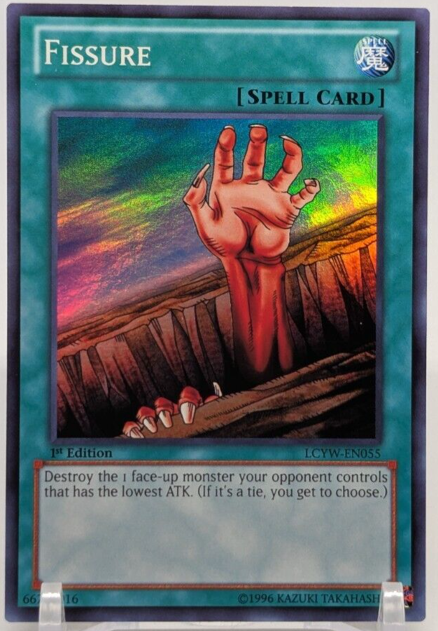 This is a rare and highly sought-after 1996 Yu-Gi-Oh! Fissure LCYW-EN055 card from the Legendary Collection 3: Yugi's World set. It features a stunning holo finish and is made of high-quality card stock material. The card is a Super Rare Spell-Normal type, with an Attack/Power of 0 and Defense/Toughness of 0. It is in English language and was manufactured by Konami in the United States. The card is suitable for collectors and fans of the Yu-Gi-Oh! Trading Card Game. It is recommended for ages 4 and up and is not autographed. This vintage card is a must-have for any serious collector and is sure to be a valuable addition to your collection.