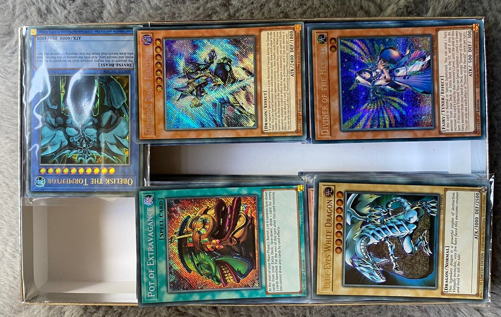 Yugioh! 500 Cards Bundle/Job Lot + 1 Egyptian God Card & 1 Iconic Card. You will receive the following: - 1 Egyptian God - 1 Iconic Card (Dark Magician, Blue-Eyes & Red-Eyes) - 50 Holos - 50 Rares - 400 Commons Message me to request a specific Egyptian God or Iconic card from the selection shown in the 3rd photo. The listing ‘item specifics’ refer to the guaranteed Egyptian God and Iconic card, shown in the photos. The cards are almost all in mint/NM with potentially the exception of some being in excellent/LP condition. The cards shown in the pictures are only an example representation of what you will receive and may not be those exact cards. The cards you will receive are in the format mentioned at the top of the description and will be random, although specific Egyptian God and Iconic cards may be requested for the first few buyers. Please message me if you have any questions regarding the product, or for negotiations.