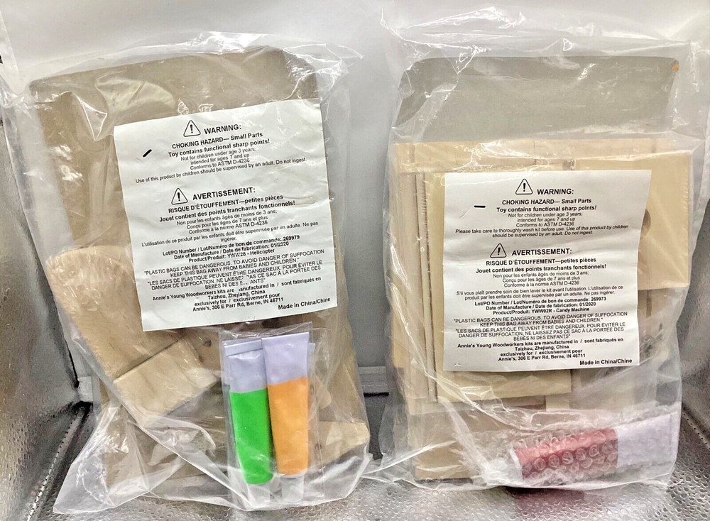 Get your creative juices flowing with this lot of two unopened construction kits from Annie's Young Woodworkers Kit Club. Perfect for children aged 7 and up, these kits come with everything you need to build your own candy machine and helicopter. Made from high-quality wood, they promise hours of fun and excitement for both kids and adults alike. Each kit is individually sealed, and the bundle includes a total of four kits, making it a great value for money. Whether you're an experienced woodworker or a beginner, these kits are easy to assemble and will provide a great sense of accomplishment once completed. So why wait? Order now and let the building begin! New, does have two small holes in front of plastic evidently where price sticker was. All from a smoke free and pet free home. Payment Payment is expected within 3 days. However if you are still "shopping" with me, just let me know with a quick email. I'm happy to wait for payment until you make all of your purchases. Thank you for looking at my auction. Shipping I'm happy to combine items in one box to save money on shipping charges. The only items I don’t usually combine are breakable items though there are exceptions to some breakable items that I sell. I don’t want the box to be too heavy and I want plenty of room to pack it properly so I have done all I can do to hopefully prevent breakage. I use Ground Advantage for shipping thru USPS. Sometimes due to weight and/or size I will use FedEx. Both services offer 100.00 in Insurance and confirmation of tracking. There is never a handling charge. I try to get the postage closes I can to the actual weight and size of package. If you have any questions please email me. Terms of Sale Please let me know if you have questions or concerns after you receive your item and if there is anything that would keep you from giving us 5 stars on all the ratings. We will do what we can to make it right. About Us Check my feedback and bid with confidence. All of my items come from smoke-free and pet free homes and I always try to describe my items as accurately as possible so you won't be disappointed when you receive it. However, I can always make a mistake or miss something - please let me know if you have any questions or concerns after you receive your item, no sale is ever final until you are happy and satisfied with your purchase! Contact Us If you have any questions, please email me through the ebay messaging system and I'll get right back to you!
