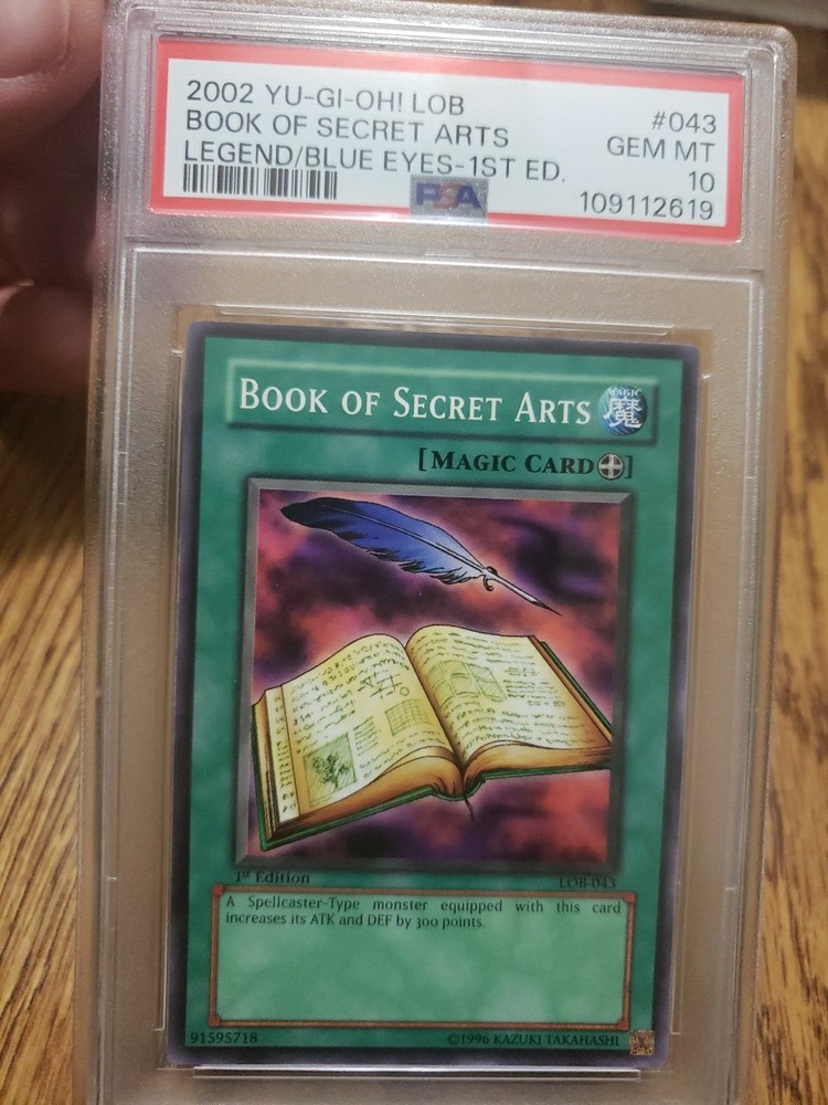 The 2002 Yugioh LOB-043 Book of Secret Arts Legend Blue Eyes 1st Ed PSA Gem Mint 10 is a highly sought-after collectible card from the Yu-Gi-Oh! TCG. This rare card belongs to the LOB set and is a Spell-Equip type with a special attribute of Spell. Manufactured by Konami in 2002, this common / short print card features the iconic Legend Blue Eyes White Dragon theme and is in English language. It is a valuable addition to any card collection, especially for fans of vintage Yu-Gi-Oh! cards. Its low population and freshly graded slab make it a desirable item for collectors and enthusiasts. Here’s your chance to get this item at a great price! I have over 500 graded cards as well as over 150 raw cards and more being listed each day so check out my Ebay store and fill up the cart 👍