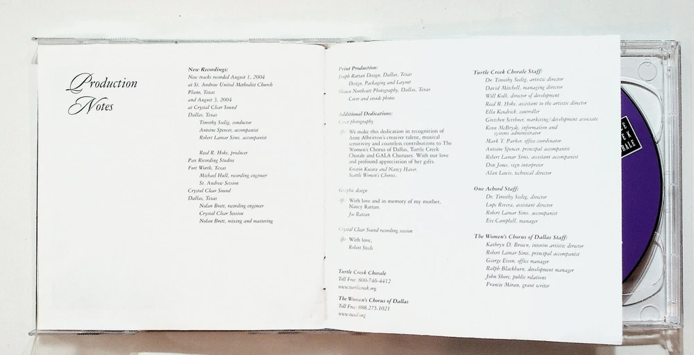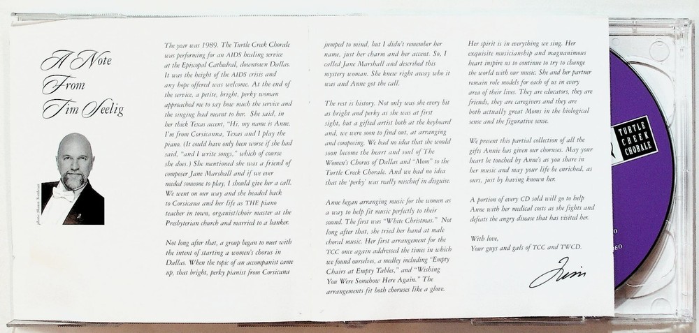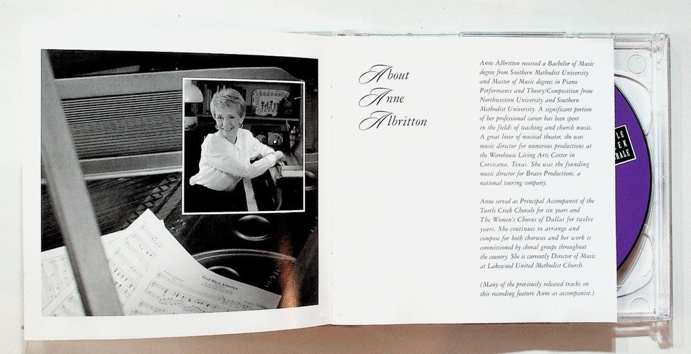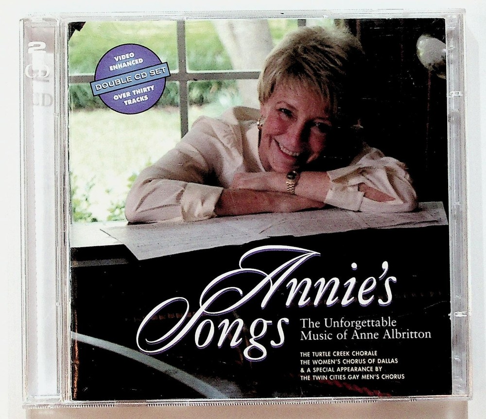 Combined Shipping - Add items to cart Choral gold shines bright— Annie’s Songs weaves Anne Albritton’s genius across two CDs! This 2004 Northeast TN-sourced set from Turtle Creek Chorale (TCC) and The Women’s Chorus of Dallas (TWCD), with a Twin Cities Gay Men’s Chorus cameo, honors Albritton’s legacy—six years as TCC’s Principal Accompanist, twelve with TWCD. From “White Christmas” to AIDS-era medleys like “Empty Chairs at Empty Tables/Wishing You Were Somehow Here Again,” her arrangements fit like gloves—33 tracks of love, loss, and hope (Vol. I: 17, Vol. II: 16). Proceeds aid her medical fight, making this a rare, soulful must for gospel fans and choral collectors! The year was 1989. The Turtle Creek Chorale was performing for an AIDS healing service at the Episcopal Cathedral downtown Dallas. It was the height of the AIDS crisis and any hope offered was welcome. At the end of the service, a petite, bright, perky woman approached me to say how much the service and the singing had meant to her She said, tn her thick Texas accent, “Hi, my name is Anne. I'm from Corsicanna. Texas and I play the piano. (It could have only been worse if she had said, “and I write songs, ” which of course she does.) She mentioned she was a friend of composer Jane Marshall and if we ever needed someone to play. I should give her a call. We went on our way and she headed back to Corsicana and her life as THE piano teacher in town, organist/choir master at the Presbyterian church and married to a banker. Not long after that, a group began to meet with the intent of starting a women’s chorus in Dallas. When the topic of an accompanist came up, that bright, perky pianist from Corsicana jumped to mind, but I didn't remember her name, just her charm and her accent. So, I called Jane Marshall and described this mystery woman. She knew right away who it was and Anne got the call. The rest is history. Not only was she every bit as bright and perky as she was at first sight, but a gifted artist both at the keyboard and, we were soon to find out, at arranging and composing. W4 had no idea that she would soon become the heart and soul of The Women’s Chorus of Dallas and “Mom” to the Turtle Creek Chorale. And we had no idea that the perky' was really mischief in disguise. Anne began arranging music for the women as a way to help fit music perfectly to their sound. The first was “White Christmas. ” Not long after that, she tried her hand at male choral music. Her first arrangement for the TCC once again addressed the times in which we found ourselves, a medley including “Empty Chairs at Empty Tables.” and “ Wishing You Were Somehow Here Again. ” The arrangements fit both choruses like a glove. Her spirit is in everything we sing. Her exquisite musicianship and magnanimous heart inspire us to continue to try to change the world with our music. She and her partner remain role models for each of us in every area of their lives. They are educators, they are friends, they are caregivers and they are both actually great Moms in the biological- sense and the figurative sense. We present this partial collection of all the gifts Annie has given our choruses. May your heart be touched by Anne’s as you share in her music and may your life be enriched, as ours, just by having known her. /A portion of every CD sold will go to help Anne with her medical costs as she fights and defeats the angry disease that has visited her. With love. Your guys and gals of TCC and TWCD. Anne Albritton received a Bachelor of Music degree from Southern Methodist University and Master of Music degrees in Piano Performance and Theory/Compos it ion from Northwestern University and Southern Methodist University. A significant portion of her professional career has been spent in the fields of teaching and church music. /I great lover of musical theater, she was music director for numerous productions at the Warehouse Living Arts Center in Corsicana. Texas. She was the founding music director for Bravo Productions, a national touring company. Anne served as Principal Accompanist of the Turtle Creek Chorale for six years and The Women's Chorus of Dallas for twelve years. She continues to arrange and compose for both choruses and her work is commissioned by choral groups throughout the country. She is currently Director of Music at Lakewood United Methodist Church. (Many of the previously released tracks on this recording feature Anne as accompanist.) Thank you for your business. Gallimoresgoods