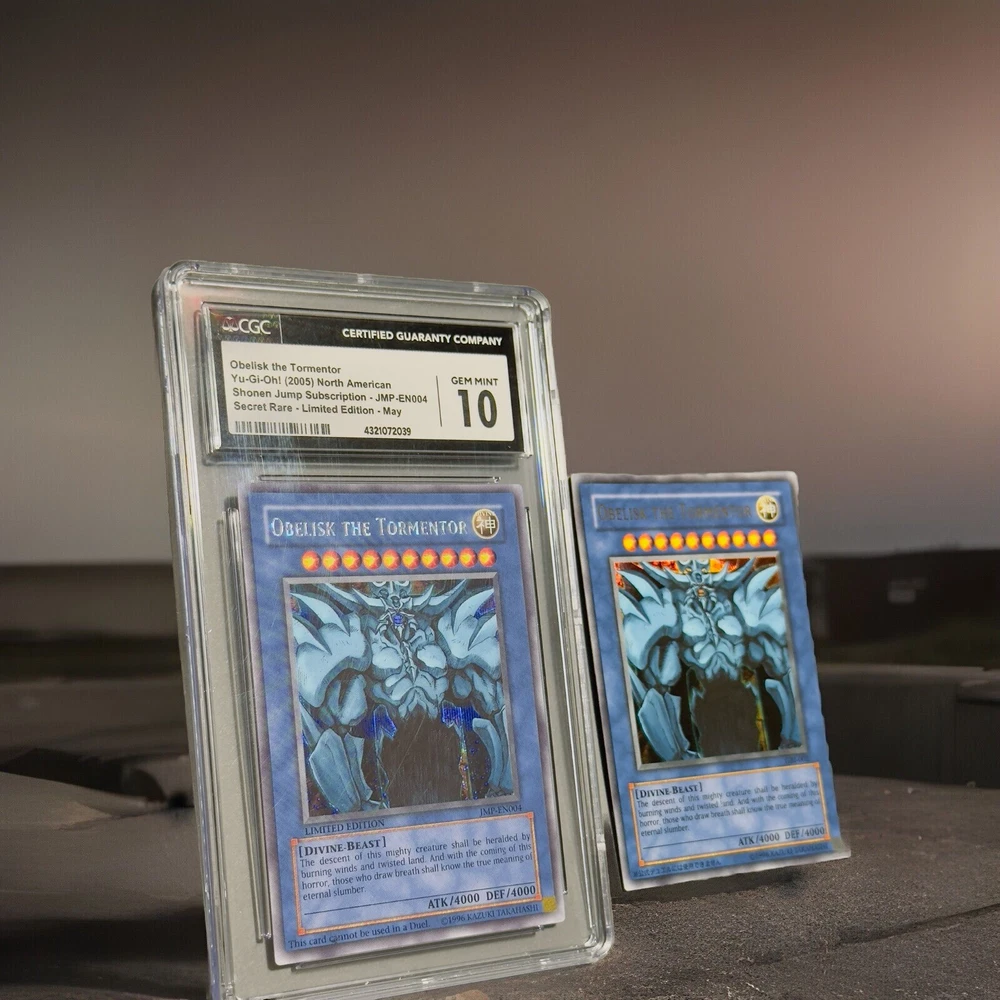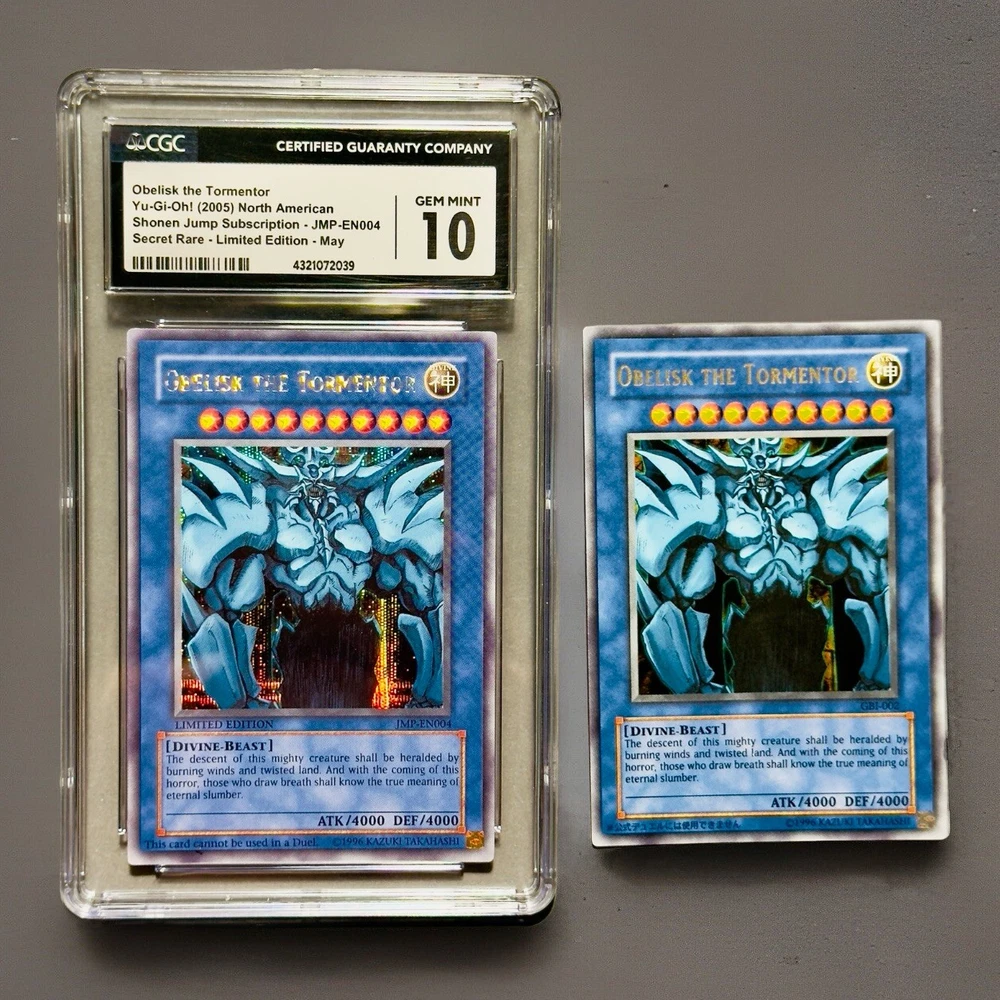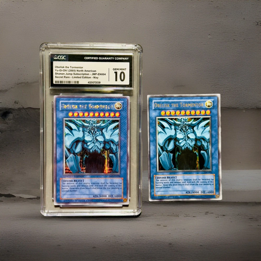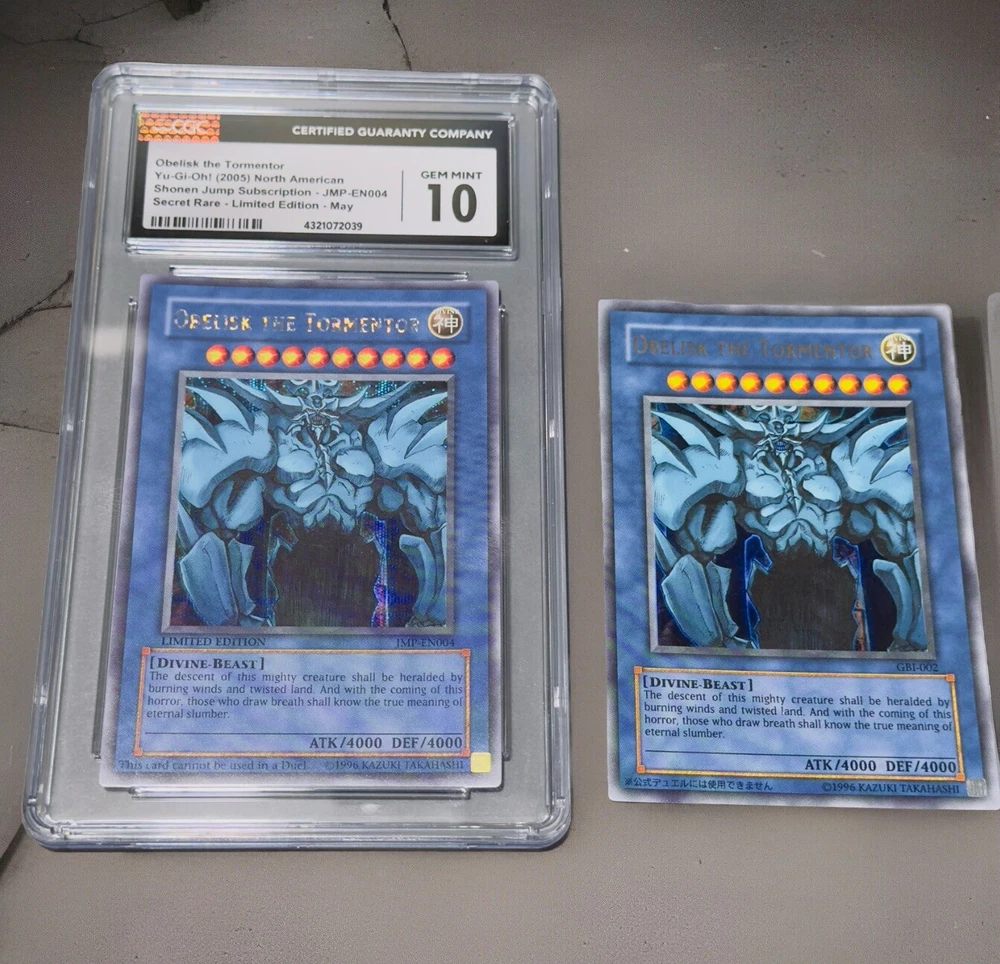 **Yu-Gi-Oh! Obelisk the Tormentor - from Shonen Jump Magazine promo Ultra Rare- GEM MINT 10 (CGC Graded) & Raw Card - Limited Edition Secret Rare** **Item Description:** Up for sale are two stunning editions of the iconic Yu-Gi-Oh! card, Obelisk the Tormentor: 1. **Obelisk the Tormentor (CGC Graded GEM MINT 10)** - **Year:** 2005 - **Edition:** North American Shonen Jump Subscription - **Card Number:** JMP-EN004 - **Rarity:** Secret Rare - Limited Edition (May) - **Grade:** CGC GEM MINT 10 (Serial #: 4321072039) - **Condition:** This card has been professionally graded by CGC, ensuring its pristine condition. It features sharp corners, perfect centering, and a flawless surface. 2. **Obelisk the Tormentor (Raw Card)** - **Edition:** GBI-004 - **Rarity:** Secret Rare - **Condition:** The raw card is in excellent condition with minor wear visible under close inspection. It displays vivid artwork and a clean surface, making it a great addition to any collection. **Highlights:** - **Iconic Divine-Beast:** Obelisk the Tormentor is one of the most powerful and revered cards in the Yu-Gi-Oh! trading card game, known for its formidable attack and defense stats (ATK/4000 DEF/4000). - **Limited Edition Secret Rares:** Both cards are limited edition Secret Rares, featuring the unique holographic artwork that collectors cherish. - **Perfect for Collectors:** Whether you are a seasoned collector or a Yu-Gi-Oh! enthusiast, these cards are a must-have. The GEM MINT 10 grade adds immense value and prestige to your collection. **Shipping and Handling:** - **Secure Packaging:** Both cards will be securely packaged to ensure they arrive in perfect condition. - **Shipping Options:** Available worldwide with tracked and insured shipping. **Buy with Confidence:** - **Trusted Seller:** I have a proven track record of excellent customer service and fast shipping. - **Satisfaction Guaranteed:** Your satisfaction is my top priority. If you have any questions or need further information, please feel free to contact me. Don't miss the opportunity to own these exceptional Obelisk the Tormentor cards. Place your bid now or buy it outright to secure these treasures for your collection!