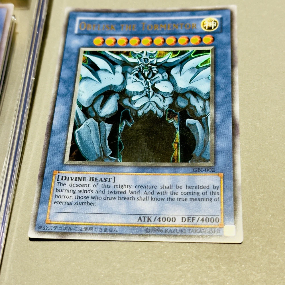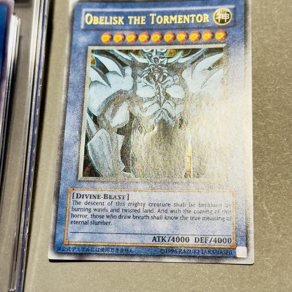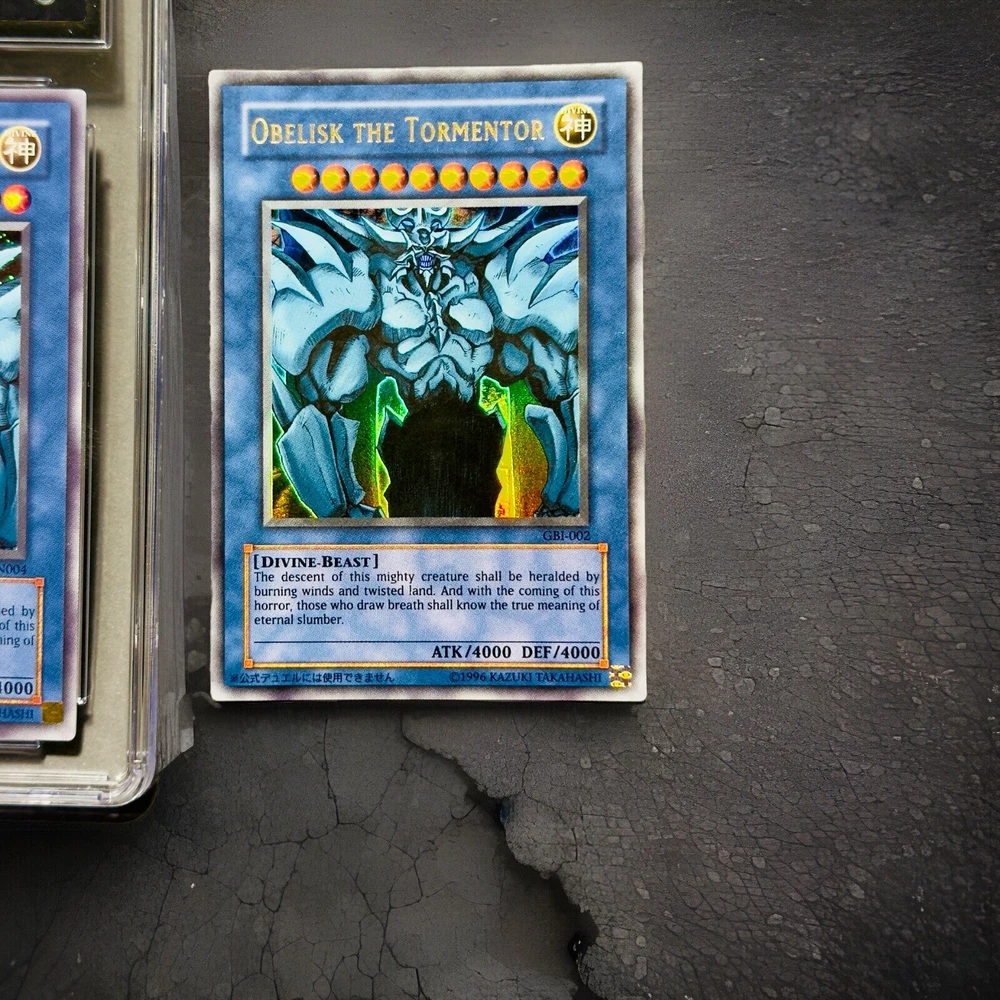 **Yu-Gi-Oh! Obelisk the Tormentor - from Shonen Jump Magazine promo Ultra Rare- GEM MINT 10 (CGC Graded) & Raw Card - Limited Edition Secret Rare** **Item Description:** Up for sale are two stunning editions of the iconic Yu-Gi-Oh! card, Obelisk the Tormentor: 1. **Obelisk the Tormentor (CGC Graded GEM MINT 10)** - **Year:** 2005 - **Edition:** North American Shonen Jump Subscription - **Card Number:** JMP-EN004 - **Rarity:** Secret Rare - Limited Edition (May) - **Grade:** CGC GEM MINT 10 (Serial #: 4321072039) - **Condition:** This card has been professionally graded by CGC, ensuring its pristine condition. It features sharp corners, perfect centering, and a flawless surface. 2. **Obelisk the Tormentor (Raw Card)** - **Edition:** GBI-004 - **Rarity:** Secret Rare - **Condition:** The raw card is in excellent condition with minor wear visible under close inspection. It displays vivid artwork and a clean surface, making it a great addition to any collection. **Highlights:** - **Iconic Divine-Beast:** Obelisk the Tormentor is one of the most powerful and revered cards in the Yu-Gi-Oh! trading card game, known for its formidable attack and defense stats (ATK/4000 DEF/4000). - **Limited Edition Secret Rares:** Both cards are limited edition Secret Rares, featuring the unique holographic artwork that collectors cherish. - **Perfect for Collectors:** Whether you are a seasoned collector or a Yu-Gi-Oh! enthusiast, these cards are a must-have. The GEM MINT 10 grade adds immense value and prestige to your collection. **Shipping and Handling:** - **Secure Packaging:** Both cards will be securely packaged to ensure they arrive in perfect condition. - **Shipping Options:** Available worldwide with tracked and insured shipping. **Buy with Confidence:** - **Trusted Seller:** I have a proven track record of excellent customer service and fast shipping. - **Satisfaction Guaranteed:** Your satisfaction is my top priority. If you have any questions or need further information, please feel free to contact me. Don't miss the opportunity to own these exceptional Obelisk the Tormentor cards. Place your bid now or buy it outright to secure these treasures for your collection!