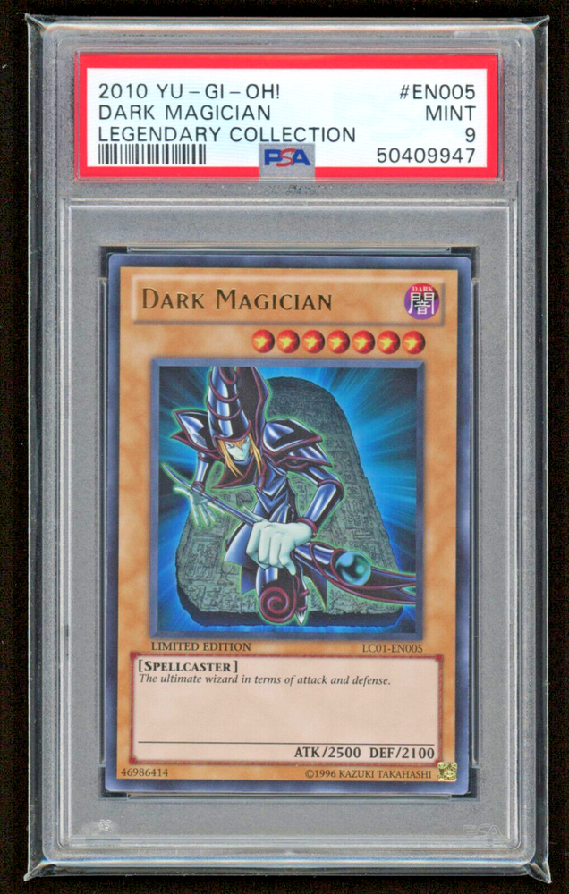 YU-GI-OH! TRADING CARD GAME (YTCG) BY KONAMI The Yu-Gi-Oh! Trading Card Game was launched by Konami in 1999 in Japan and March 2002 in North America . It was named the top selling trading card game in the world by Guiness World Records on July 7, 2009, having sold over 22 billion cards worldwide. As of March 31, 2011, Konami Digital Entertainment Co., Ltd. Japan sold 25.2 billion cards globally since 1999. As of January 2021, the game is estimated to have sold about 35 billion cards worldwide and grossed over ¥1 trillion ( $9.64 billion ). Yu-Gi-Oh! Speed Duel, a faster and simplified version of the game, was launched worldwide in January 2019. Another faster-paced variation, Yu-Gi-Oh! Rush Duel, launched in Japan in April 2020. DARK MAGICIAN 2010 LEGENDARY COLLECTION HOLO RARE #EN 005 ORIGINAL SERIES PROFESSIONAL SPORTS AUTHENTICATOR / (PSA): GRADE 9 CONDITION: MINT RELEASE DATE: MARCH 8, 2002 YU-GI-OH! TRADING CARD GAME / (YTCG) PROFESSIONAL SPORTS AUTHENTICATOR (PSA) Professional Sports Authenticator was launched in July 1991 by David Hall , owner of the coin grading company Professional Coin Grading Service, to serve collectors as a third-party card grader. When they started, they struggled as a business, due to a low demand of collectors wanting their cards to be graded. A lot of sports card dealers were against the idea of having a third-party grade their cards, and decided against using card grading as a benefit to their business. Eventually, the market quickly shifted towards wanting cards graded, due to a prevalent amount of dishonesty at trade shows. Customers rarely felt comfortable with a purchase, and always felt as though it was a gamble if they were getting a real card, and not a fake. A third-party grading company started to make sense; a party that had no financial influence in telling you the honest grade of a card. Having a card graded gave peace of mind to customers, who can buy a card with confidence knowing it was a legitimate card, instead of believing the dealer's biased opinion on what the grade of the card is.