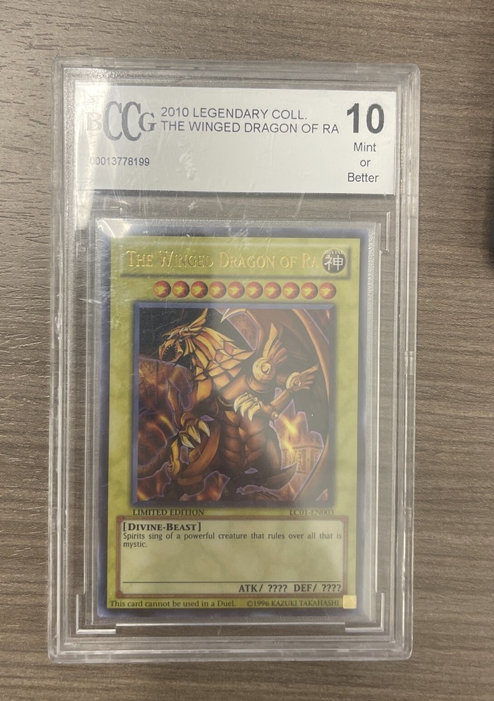 This highly collectible card game item features the legendary Winged dragon of Ra from the Yu-Gi-Oh! TCG. It comes from the 2010 Legendary Collection set and has been graded a perfect BCCG 10 Mint. This card is a must-have for any serious collector of CCG individual cards. The card name is "The winged dragon of Ra" and it is manufactured in the year 2010. The set is "Legendary Collection" and the card is categorized under "Toys & Hobbies", "Collectible Card Games", and "CCG Individual Cards".
