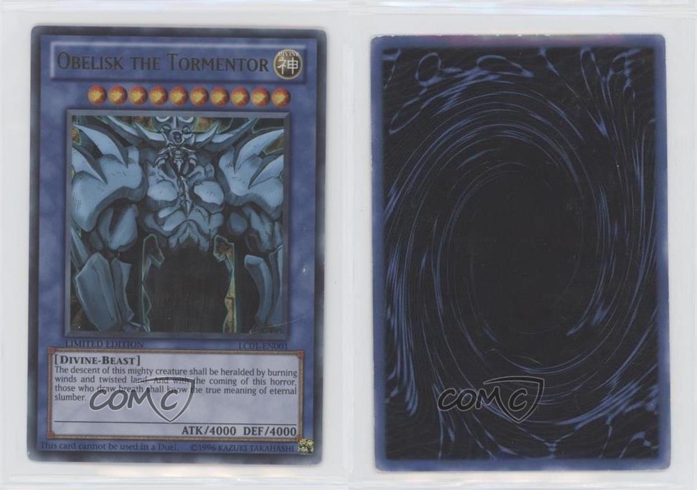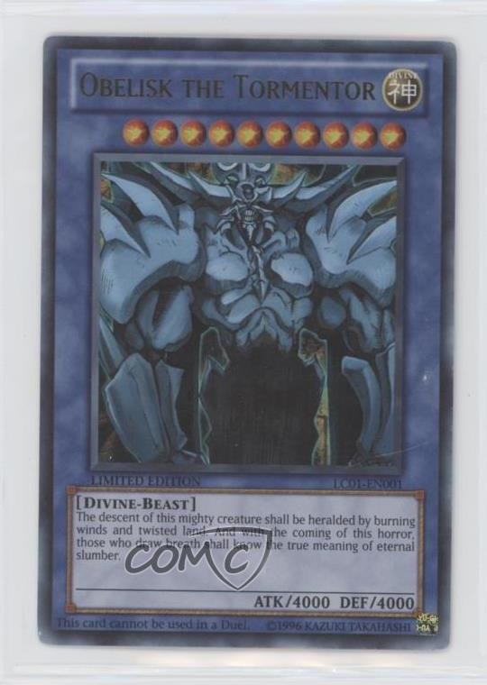 2010 Yu-Gi-Oh! Legendary Collection 1 - Box Set [Base] - Limited Edition #LC01-EN001 Obelisk the Tormentor COMC Item: 143150357 - YuGiOh Card - Featuring Obelisk the Tormentor Search for more: 2010 Yu-Gi-Oh! Legendary Collection 1 Search for more: 2010 Yu-Gi-Oh! Legendary Collection 1 - Box Set [Base] - Limited Edition View all of our Listings Auctions Buy It Now About Us Located in the beautiful Pacific Northwest, COMC (Check Out My Cards) is the world's largest consignment service for trading card singles. More than 10,000 people have used our consignment service to list over 50 million trading cards. Find out how we can help you consign your items on eBay by contacting us through eBay messaging. COMC -- "The Safe & Easy Way to Buy & Sell" Raw Condition for Modern Cards Unless otherwise noted, raw modern cards are listed in Near Mint-Mint condition or better. A NM-MT card appears to be Mint at first glance, but upon closer inspection, may exhibit some of the following: minor print defects (e.g. roller marks, print line, dimple), minor scratches, slight edge wear, and slight corner wear. Centering is clearly visible in the images provided and does not factor into our condition assessment. Raw Condition for Vintage Cards Unless otherwise noted, raw vintage cards are listed in Excellent condition or better. An EX card may exhibit some of the following: minor rounding of corners, surface wear, print defects, light scratches, and slight edge wear/chipping. Centering is clearly visible in the images provided and does not factor into our condition assessment. Domestic Shipping Combined shipping for multiple items is available. To receive combined shipping, please ensure all desired items are in your eBay shopping cart before proceeding to checkout. eBay limits orders to 40 items per order. We automatically combine multiple orders placed on the same day. If you place multiple orders on the same day, please contact us to request a refund of applicable shipping costs. Signature confirmation may be required on invoices over $400. All cards are protected and shipped securely. International Shipping COMC offers eBay's International Shipping (EIS) for international orders under $2,500* (see country exceptions below). All duties and import fees are paid at checkout; in the rare event that there are additional import fees upon delivery, these are borne by the buyer. EIS packages route through a shipping hub in Erlanger, KY before shipping to their final destination. Please note that EIS does not allow for combined shipments. The shipping rates are determined by eBay and cannot be adjusted. *Maximum sale price exceptions: Colombia, Kuwait ($2,000); Taiwan ($1,539); Chile, Costa Rica, Guatemala, Honduras, Trinidad and Tobago ($1,000); Antigua and Barbuda, Aruba, Belize, Dominica, Grenada, Philippines, Saint Kitts and Nevis, Saint Lucia, Montserrat, Turks and Caicos Islands ($500); Dominican Republic, El Salvador ($200). Please request a shipping quote through eBay messaging for orders that exceed the maximum sale price supported by eBay's International Shipping. You will be responsible for all duties and import fees for international orders shipped outside the EIS. All cards are protected and shipped securely. Payment COMC does not accept offers on our cards through our eBay storefront. COMC utilizes eBay’s managed payments system. If you are experiencing difficulties making a payment, please contact eBay for assistance. Return Policy Returns are only accepted on the rare occasion the item is not as described. If you are making a return, please initiate the return process through eBay so a mailing label can be provided for you. Prior to listing, our expert team carefully assessed this item to represent it accurately. Please review the description and high-definition images prior to purchasing to ensure this item meets your satisfaction. We welcome you to contact us if you have further questions about this item. Trust and Integrity COMC carefully assesses each item consigned to us to prevent fraudulent items from entering the marketplace. If you believe an item offered on COMC may be fraudulent, please contact us with details so we can investigate the issue. Items we determine are outside our supported items policy may be removed. Last Modified: 6/15/2025 7:07:01 AM PDT