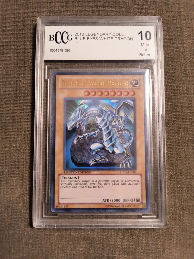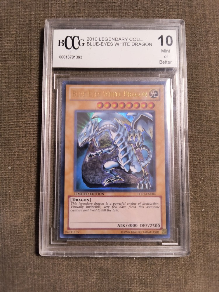 This is a 2010 Blue-Eyes White Dragon card from the Legendary Collection set for the Yu-Gi-Oh! TCG game. The card has a grade of BCCG 10 and is in near mint or better condition. It features a dragon design and is a great addition to any collector's card collection. The card was manufactured in 2010 and is perfect for those who love to play the Yu-Gi-Oh! TCG game or simply collect its cards.
