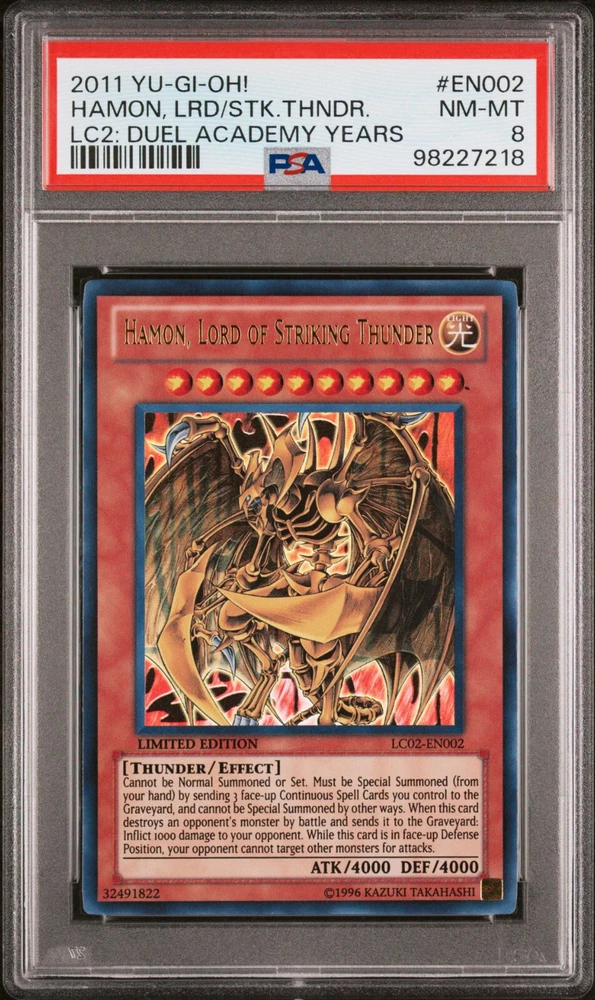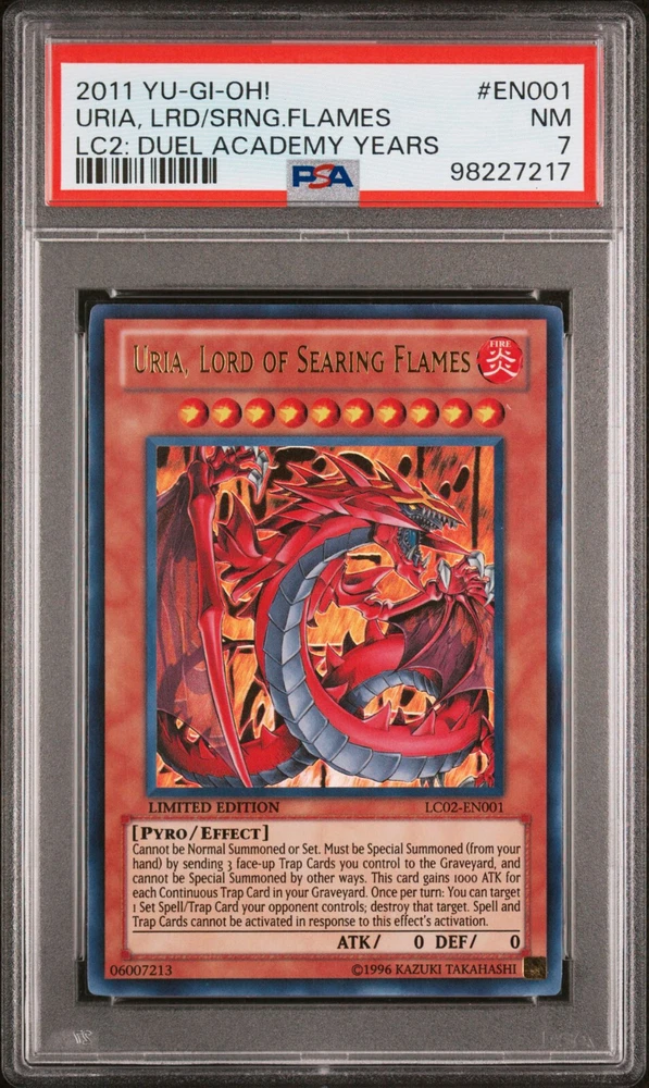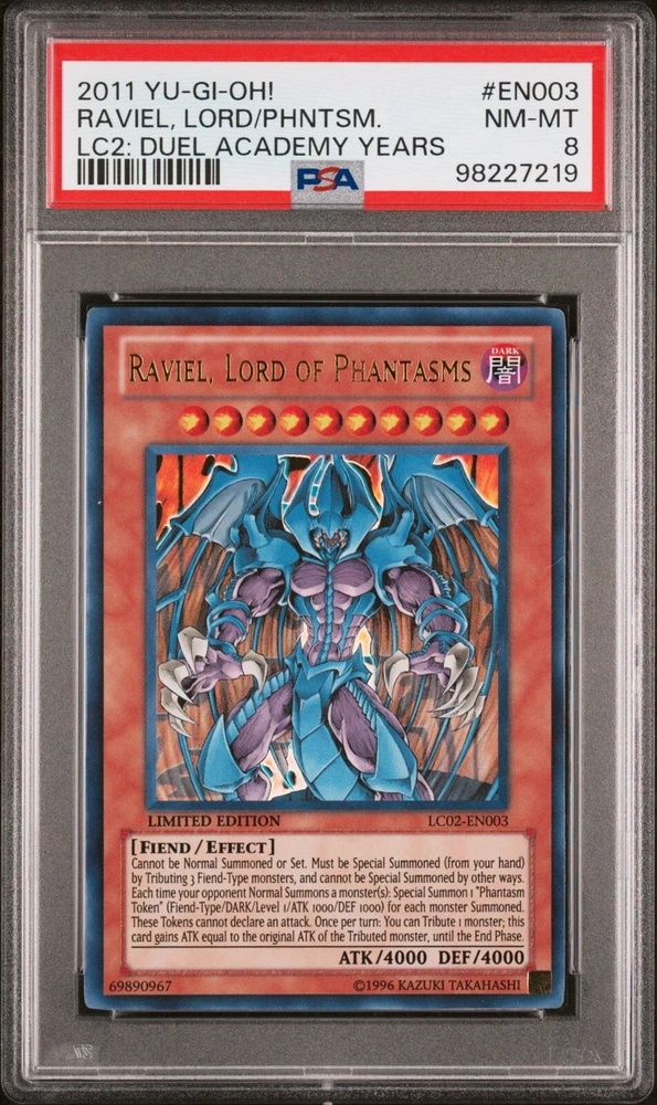 This sequential lot of 3 PSA graded Yu-Gi-Oh! cards from the 2011 Legendary Collection 2: The Duel Academy Years features the Limited Edition Lord creatures Raviel, Lord of Phantasms, Hamon Lord of Striking Thunder, and Uria, Lord of Searing Flames. The cards are made of high-quality card stock with a foil finish, and are all holo rare. They are perfect for any collector or player of the Yu-Gi-Oh! Trading Card Game. The cards are in English and manufactured by Konami, with the card numbers LC02-EN001, EN002, and EN003. This lot is a great addition to any collection and includes some of the most sought-after cards in the game. Cert numbers are: 98227217, 98227218, and 98227219 Please look at all pictures for this lot. You will get all 3 PSA graded cards shown.