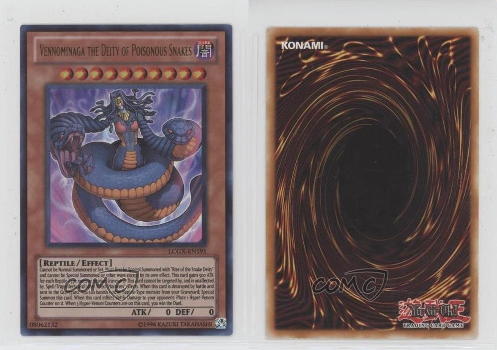2011 Yu-Gi-Oh! GX Legendary Collection 2: The Duel Academy Years - Mega-Pack [Base] - Unlimited #LCGX-EN191 Vennominaga the Deity of Poisonous Snakes COMC Item: 104265178 - YuGiOh Card Search for more: 2011 Yu-Gi-Oh! GX Legendary Collection 2: The Duel Academy Years Search for more: 2011 Yu-Gi-Oh! GX Legendary Collection 2: The Duel Academy Years - Mega-Pack [Base] - Unlimited View all of our Listings Auctions Buy It Now About Us Located in the beautiful Pacific Northwest, COMC (Check Out My Cards) is the world's largest consignment service for trading card singles. More than 10,000 people have used our consignment service to list over 50 million trading cards. Find out how we can help you consign your items on eBay by contacting us through eBay messaging. COMC -- "The Safe & Easy Way to Buy & Sell" Raw Condition for Modern Cards Unless otherwise noted, raw modern cards are listed in Near Mint-Mint condition or better. A NM-MT card appears to be Mint at first glance, but upon closer inspection, may exhibit some of the following: minor print defects (e.g. roller marks, print line, dimple), minor scratches, slight edge wear, and slight corner wear. Centering is clearly visible in the images provided and does not factor into our condition assessment. Raw Condition for Vintage Cards Unless otherwise noted, raw vintage cards are listed in Excellent condition or better. An EX card may exhibit some of the following: minor rounding of corners, surface wear, print defects, light scratches, and slight edge wear/chipping. Centering is clearly visible in the images provided and does not factor into our condition assessment. Domestic Shipping Combined shipping for multiple items is available. To receive combined shipping, please ensure all desired items are in your eBay shopping cart before proceeding to checkout. eBay limits orders to 40 items per order. We automatically combine multiple orders placed on the same day. If you place multiple orders on the same day, please contact us to request a refund of applicable shipping costs. Signature confirmation may be required on invoices over $400. All cards are protected and shipped securely. International Shipping COMC offers eBay's International Shipping (EIS) for international orders under $2,500* (see country exceptions below). All duties and import fees are paid at checkout; in the rare event that there are additional import fees upon delivery, these are borne by the buyer. EIS packages route through a shipping hub in Erlanger, KY before shipping to their final destination. Please note that EIS does not allow for combined shipments. The shipping rates are determined by eBay and cannot be adjusted. *Maximum sale price exceptions: Colombia, Kuwait ($2,000); Taiwan ($1,539); Chile, Costa Rica, Guatemala, Honduras, Trinidad and Tobago ($1,000); Antigua and Barbuda, Aruba, Belize, Dominica, Grenada, Philippines, Saint Kitts and Nevis, Saint Lucia, Montserrat, Turks and Caicos Islands ($500); Dominican Republic, El Salvador ($200). Please request a shipping quote through eBay messaging for orders that exceed the maximum sale price supported by eBay's International Shipping. You will be responsible for all duties and import fees for international orders shipped outside the EIS. All cards are protected and shipped securely. Payment COMC does not accept offers on our cards through our eBay storefront. COMC utilizes eBay’s managed payments system. If you are experiencing difficulties making a payment, please contact eBay for assistance. Return Policy Returns are only accepted on the rare occasion the item is not as described. If you are making a return, please initiate the return process through eBay so a mailing label can be provided for you. Prior to listing, our expert team carefully assessed this item to represent it accurately. Please review the description and high-definition images prior to purchasing to ensure this item meets your satisfaction. We welcome you to contact us if you have further questions about this item. Trust and Integrity COMC carefully assesses each item consigned to us to prevent fraudulent items from entering the marketplace. If you believe an item offered on COMC may be fraudulent, please contact us with details so we can investigate the issue. Items we determine are outside our supported items policy may be removed. Last Modified: 7/17/2025 9:29:08 PM PDT
