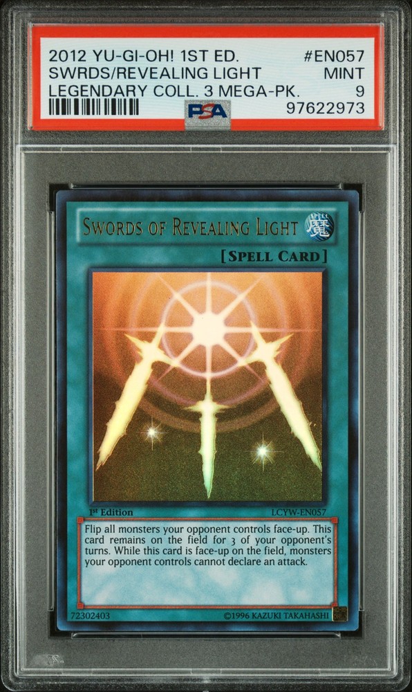 2012 YU-GI-OH! LEGENDARY COLLECTION 3 MEGA-PACK 1ST EDITION #EN057 SWORDS OF REVEALING LIGHT PSA 9 2012 YU-GI-OH! LEGENDARY COLLECTION 3 MEGA-PACK 1ST EDITION #EN057 SWORDS OF REVEALING LIGHT PSA 9 Purchase Info Thank you for your interest in bidding on this item consigned with PSA! By bidding on this item, you acknowledge and agree to the following terms: All sales are final. Returns not accepted. Payment must be made within 7 days of auction close. All items are sold "as is" and without warranty of Collectors Universe, Inc. (d/b/a PSA), and ANY AND ALL IMPLIED WARRANTIES ARE DISCLAIMED AND EXCLUDED. Sales tax may apply depending on shipping address. PSA does not guarantee that another third-party grading company's authentication or certification of an item as genuine is correct or accurate. Neither a difference of opinion between third-party grading companies about authenticity, nor a company's subsequent reversal of its earlier authentication or certification of an item, will be a basis for rescinding a sale. Any dispute with another third-party grading company relating to the authenticity of an item must be resolved directly with that other company. Collectors' maximum liability in the event of loss or damage to an item during shipping will be the lesser of (a) the price paid for the item and (b) the change in fair market value of the item. You release Collectors from all other liability including for any claims of punitive damages, emotional distress, consequential damages, lost profits, or lost interest, except as prohibited by law. Shipping Purchased Items will be shipped directly from PSA Vault. You stay hands-free. PSA Vault When you purchase this item, you can save on sales tax and selling fees by keeping it in the PSA Vault, official Vault of eBay. Items already in PSA Vault and will be sent to PSA Vault will have no shipping charge Storage of any items with the PSA Vault will be subject to the PSA Vault Terms of Service. Consignment PSA has competitive auction rates on the world's largest collectibles marketplace with the option to list from the PSA Vault or immediately after PSA authentication and grading. Sale Price Under $100 $100 - $499 $500 - $999 $1,000 - $2,499 $2,500 - $4,999 $5,000+ Seller Fee 13% + $3 flat 13% 12% 10% 9% 7% Sellers pay a single fee as reflected above; no additional eBay fees are incurred.
