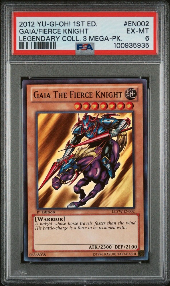 This 2012 Yu-Gi-Oh! card features Gaia, the fierce knight from the Legendary Collection 3: Yugi's World set. With an attack power of 2300 and a defense toughness of 2100, this Super Rare card is a great addition to any warrior's arsenal. The card is in English and has a 1st Edition feature. Konami, the manufacturer of this card, has graded it as a PSA 6. The card's attributes include Earth color, Normal type, and a card number of LCYW-EN002. This collectible card game individual card is perfect for any Yu-Gi-Oh! TCG enthusiast looking to add a powerful warrior to their deck.