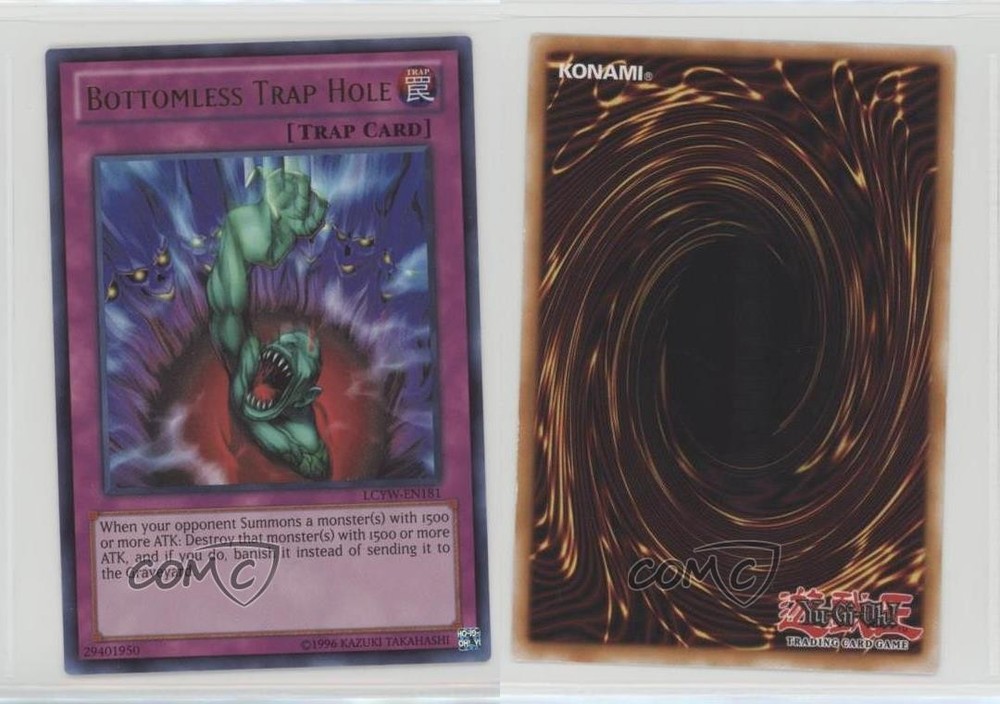 2012 Yu-Gi-Oh! Legendary Collection 3: Yugi's World - Mega-Pack [Base] - Unlimited #LCYW-EN181 UR - Bottomless Trap Hole COMC Item: 38843264 - YuGiOh Card - Featuring Bottomless Trap Hole Search for more: 2012 Yu-Gi-Oh! Legendary Collection 3: Yugi's World Search for more: 2012 Yu-Gi-Oh! Legendary Collection 3: Yugi's World - Mega-Pack [Base] - Unlimited View all of our Listings Auctions Buy It Now About Us Located in the beautiful Pacific Northwest, COMC (Check Out My Cards) is the world's largest consignment service for trading card singles. More than 10,000 people have used our consignment service to list over 50 million trading cards. Find out how we can help you consign your items on eBay by contacting us through eBay messaging. COMC -- "The Safe & Easy Way to Buy & Sell" Raw Condition for Modern Cards Unless otherwise noted, raw modern cards are listed in Near Mint-Mint condition or better. A NM-MT card appears to be Mint at first glance, but upon closer inspection, may exhibit some of the following: minor print defects (e.g. roller marks, print line, dimple), minor scratches, slight edge wear, and slight corner wear. Centering is clearly visible in the images provided and does not factor into our condition assessment. Raw Condition for Vintage Cards Unless otherwise noted, raw vintage cards are listed in Excellent condition or better. An EX card may exhibit some of the following: minor rounding of corners, surface wear, print defects, light scratches, and slight edge wear/chipping. Centering is clearly visible in the images provided and does not factor into our condition assessment. Domestic Shipping Combined shipping for multiple items is available. To receive combined shipping, please ensure all desired items are in your eBay shopping cart before proceeding to checkout. eBay limits orders to 40 items per order. We automatically combine multiple orders placed on the same day. If you place multiple orders on the same day, please contact us to request a refund of applicable shipping costs. Signature confirmation may be required on invoices over $400. All cards are protected and shipped securely. International Shipping COMC offers eBay's International Shipping (EIS) for international orders under $2,500* (see country exceptions below). All duties and import fees are paid at checkout; in the rare event that there are additional import fees upon delivery, these are borne by the buyer. EIS packages route through a shipping hub in Erlanger, KY before shipping to their final destination. Please note that EIS does not allow for combined shipments. The shipping rates are determined by eBay and cannot be adjusted. *Maximum sale price exceptions: Colombia, Kuwait ($2,000); Taiwan ($1,539); Chile, Costa Rica, Guatemala, Honduras, Trinidad and Tobago ($1,000); Antigua and Barbuda, Aruba, Belize, Dominica, Grenada, Philippines, Saint Kitts and Nevis, Saint Lucia, Montserrat, Turks and Caicos Islands ($500); Dominican Republic, El Salvador ($200). Please request a shipping quote through eBay messaging for orders that exceed the maximum sale price supported by eBay's International Shipping. You will be responsible for all duties and import fees for international orders shipped outside the EIS. All cards are protected and shipped securely. Payment COMC does not accept offers on our cards through our eBay storefront. COMC utilizes eBay’s managed payments system. If you are experiencing difficulties making a payment, please contact eBay for assistance. Return Policy Returns are only accepted on the rare occasion the item is not as described. If you are making a return, please initiate the return process through eBay so a mailing label can be provided for you. Prior to listing, our expert team carefully assessed this item to represent it accurately. Please review the description and high-definition images prior to purchasing to ensure this item meets your satisfaction. We welcome you to contact us if you have further questions about this item. Trust and Integrity COMC carefully assesses each item consigned to us to prevent fraudulent items from entering the marketplace. If you believe an item offered on COMC may be fraudulent, please contact us with details so we can investigate the issue. Items we determine are outside our supported items policy may be removed. Last Modified: 5/26/2025 8:36:22 PM PDT