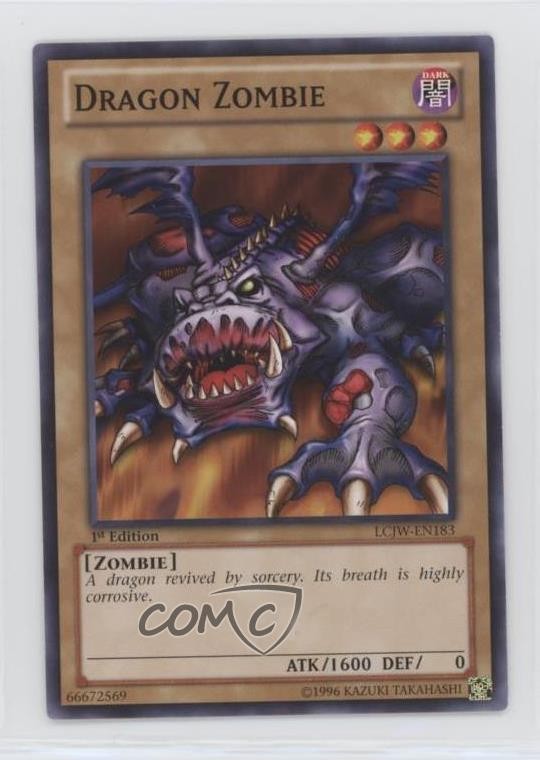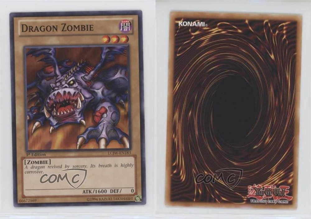 2013 Yu-Gi-Oh! Legendary Collection 4: Joey's World - Mega-Pack [Base] - 1st Edition #LCJW-EN183 Dragon Zombie COMC Item: 144072399 - YuGiOh Card - Featuring Dragon Zombie Search for more: 2013 Yu-Gi-Oh! Legendary Collection 4: Joey's World Search for more: 2013 Yu-Gi-Oh! Legendary Collection 4: Joey's World - Mega-Pack [Base] - 1st Edition View all of our Listings Auctions Buy It Now About Us Located in the beautiful Pacific Northwest, COMC (Check Out My Cards) is the world's largest consignment service for trading card singles. More than 10,000 people have used our consignment service to list over 50 million trading cards. Find out how we can help you consign your items on eBay by contacting us through eBay messaging. COMC -- "The Safe & Easy Way to Buy & Sell" Raw Condition for Modern Cards Unless otherwise noted, raw modern cards are listed in Near Mint-Mint condition or better. A NM-MT card appears to be Mint at first glance, but upon closer inspection, may exhibit some of the following: minor print defects (e.g. roller marks, print line, dimple), minor scratches, slight edge wear, and slight corner wear. Centering is clearly visible in the images provided and does not factor into our condition assessment. Raw Condition for Vintage Cards Unless otherwise noted, raw vintage cards are listed in Excellent condition or better. An EX card may exhibit some of the following: minor rounding of corners, surface wear, print defects, light scratches, and slight edge wear/chipping. Centering is clearly visible in the images provided and does not factor into our condition assessment. Domestic Shipping Combined shipping for multiple items is available. To receive combined shipping, please ensure all desired items are in your eBay shopping cart before proceeding to checkout. eBay limits orders to 40 items per order. We automatically combine multiple orders placed on the same day. If you place multiple orders on the same day, please contact us to request a refund of applicable shipping costs. Signature confirmation may be required on invoices over $400. All cards are protected and shipped securely. International Shipping COMC offers eBay's International Shipping (EIS) for international orders under $2,500* (see country exceptions below). All duties and import fees are paid at checkout; in the rare event that there are additional import fees upon delivery, these are borne by the buyer. EIS packages route through a shipping hub in Erlanger, KY before shipping to their final destination. Please note that EIS does not allow for combined shipments. The shipping rates are determined by eBay and cannot be adjusted. *Maximum sale price exceptions: Colombia, Kuwait ($2,000); Taiwan ($1,539); Chile, Costa Rica, Guatemala, Honduras, Trinidad and Tobago ($1,000); Antigua and Barbuda, Aruba, Belize, Dominica, Grenada, Philippines, Saint Kitts and Nevis, Saint Lucia, Montserrat, Turks and Caicos Islands ($500); Dominican Republic, El Salvador ($200). Please request a shipping quote through eBay messaging for orders that exceed the maximum sale price supported by eBay's International Shipping. You will be responsible for all duties and import fees for international orders shipped outside the EIS. All cards are protected and shipped securely. Payment COMC does not accept offers on our cards through our eBay storefront. COMC utilizes eBay’s managed payments system. If you are experiencing difficulties making a payment, please contact eBay for assistance. Return Policy Returns are only accepted on the rare occasion the item is not as described. If you are making a return, please initiate the return process through eBay so a mailing label can be provided for you. Prior to listing, our expert team carefully assessed this item to represent it accurately. Please review the description and high-definition images prior to purchasing to ensure this item meets your satisfaction. We welcome you to contact us if you have further questions about this item. Trust and Integrity COMC carefully assesses each item consigned to us to prevent fraudulent items from entering the marketplace. If you believe an item offered on COMC may be fraudulent, please contact us with details so we can investigate the issue. Items we determine are outside our supported items policy may be removed. Last Modified: 7/7/2025 6:39:12 PM PDT