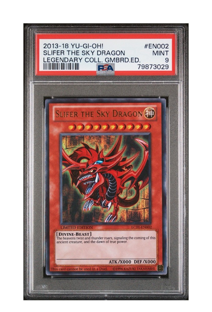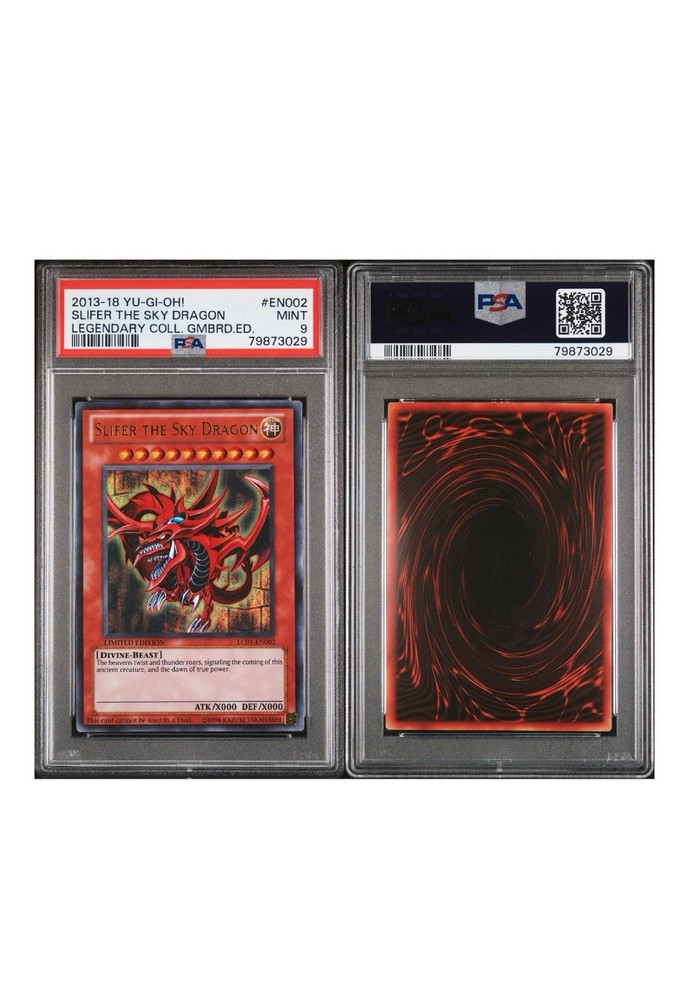 The product is a 2013-18 Yu-Gi-Oh! Legendary Collection EN002 Slifer The Sky Dragon Gameboard Edition card graded PSA 9. This collectible card is part of the Yu-Gi-Oh! Trading Card Game and features the iconic character Slifer The Sky Dragon. Manufactured by Konami, this card is a sought-after item for collectors of Yu-Gi-Oh! cards and memorabilia.