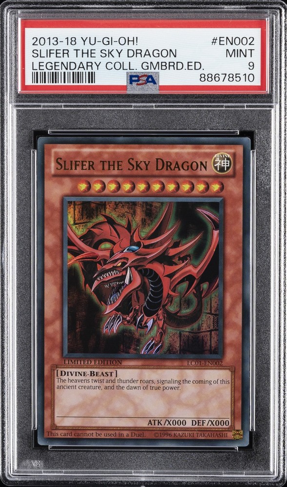 2013-2018 YU-GI-OH! LEGENDARY COLLECTION GAMEBOARD EDITION #EN002 SLIFER THE SKY DRAGON PSA 9 2013-2018 YU-GI-OH! LEGENDARY COLLECTION GAMEBOARD EDITION #EN002 SLIFER THE SKY DRAGON PSA 9 Purchase Info Thank you for your interest in bidding on this item consigned with PSA! By bidding on this item, you acknowledge and agree to the following terms: All sales are final. Returns not accepted. Payment must be made within 7 days of auction close. All items are sold "as is" and without warranty of Collectors Universe, Inc. (d/b/a PSA), and ANY AND ALL IMPLIED WARRANTIES ARE DISCLAIMED AND EXCLUDED. Sales tax may apply depending on shipping address. PSA does not guarantee that another third-party grading company's authentication or certification of an item as genuine is correct or accurate. Neither a difference of opinion between third-party grading companies about authenticity, nor a company's subsequent reversal of its earlier authentication or certification of an item, will be a basis for rescinding a sale. Any dispute with another third-party grading company relating to the authenticity of an item must be resolved directly with that other company. Collectors' maximum liability in the event of loss or damage to an item during shipping will be the lesser of (a) the price paid for the item and (b) the change in fair market value of the item. You release Collectors from all other liability including for any claims of punitive damages, emotional distress, consequential damages, lost profits, or lost interest, except as prohibited by law. Shipping Purchased Items will be shipped directly from PSA Vault. You stay hands-free. PSA Vault When you purchase this item, you can save on sales tax and selling fees by keeping it in the PSA Vault, official Vault of eBay. Items already in PSA Vault and will be sent to PSA Vault will have no shipping charge Storage of any items with the PSA Vault will be subject to the PSA Vault Terms of Service. Consignment PSA has competitive auction rates on the world's largest collectibles marketplace with the option to list from the PSA Vault or immediately after PSA authentication and grading. Sale Price Under $100 $100 - $499 $500 - $999 $1,000 - $2,499 $2,500 - $4,999 $5,000+ Seller Fee 13% + $3 flat 13% 12% 10% 9% 7% Sellers pay a single fee as reflected above; no additional eBay fees are incurred.