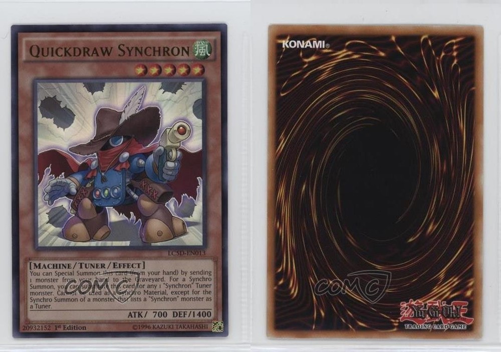 2014 Yu-Gi-Oh! Legendary Collection 5Ds - Mega-Pack [Base] - 1st Edition #LC5D-EN013 UR - Quickdraw Synchron COMC Item: 172356551 - YuGiOh Card - Featuring Quickdraw Synchron Search for more: 2014 Yu-Gi-Oh! Legendary Collection 5Ds Search for more: 2014 Yu-Gi-Oh! Legendary Collection 5Ds - Mega-Pack [Base] - 1st Edition View all of our Listings Auctions Buy It Now About Us Located in the beautiful Pacific Northwest, COMC (Check Out My Cards) is the world's largest consignment service for trading card singles. More than 10,000 people have used our consignment service to list over 50 million trading cards. Find out how we can help you consign your items on eBay by contacting us through eBay messaging. COMC -- "The Safe & Easy Way to Buy & Sell" Raw Condition for Modern Cards Unless otherwise noted, raw modern cards are listed in Near Mint-Mint condition or better. A NM-MT card appears to be Mint at first glance, but upon closer inspection, may exhibit some of the following: minor print defects (e.g. roller marks, print line, dimple), minor scratches, slight edge wear, and slight corner wear. Centering is clearly visible in the images provided and does not factor into our condition assessment. Raw Condition for Vintage Cards Unless otherwise noted, raw vintage cards are listed in Excellent condition or better. An EX card may exhibit some of the following: minor rounding of corners, surface wear, print defects, light scratches, and slight edge wear/chipping. Centering is clearly visible in the images provided and does not factor into our condition assessment. Domestic Shipping Combined shipping for multiple items is available. To receive combined shipping, please ensure all desired items are in your eBay shopping cart before proceeding to checkout. eBay limits orders to 40 items per order. We automatically combine multiple orders placed on the same day. If you place multiple orders on the same day, please contact us to request a refund of applicable shipping costs. Signature confirmation may be required on invoices over $400. All cards are protected and shipped securely. International Shipping COMC offers eBay's International Shipping (EIS) for international orders under $2,500* (see country exceptions below). All duties and import fees are paid at checkout; in the rare event that there are additional import fees upon delivery, these are borne by the buyer. EIS packages route through a shipping hub in Erlanger, KY before shipping to their final destination. Please note that EIS does not allow for combined shipments. The shipping rates are determined by eBay and cannot be adjusted. *Maximum sale price exceptions: Colombia, Kuwait ($2,000); Taiwan ($1,539); Chile, Costa Rica, Guatemala, Honduras, Trinidad and Tobago ($1,000); Antigua and Barbuda, Aruba, Belize, Dominica, Grenada, Philippines, Saint Kitts and Nevis, Saint Lucia, Montserrat, Turks and Caicos Islands ($500); Dominican Republic, El Salvador ($200). Please request a shipping quote through eBay messaging for orders that exceed the maximum sale price supported by eBay's International Shipping. You will be responsible for all duties and import fees for international orders shipped outside the EIS. All cards are protected and shipped securely. Payment COMC does not accept offers on our cards through our eBay storefront. COMC utilizes eBay’s managed payments system. If you are experiencing difficulties making a payment, please contact eBay for assistance. Return Policy Returns are only accepted on the rare occasion the item is not as described. If you are making a return, please initiate the return process through eBay so a mailing label can be provided for you. Prior to listing, our expert team carefully assessed this item to represent it accurately. Please review the description and high-definition images prior to purchasing to ensure this item meets your satisfaction. We welcome you to contact us if you have further questions about this item. Trust and Integrity COMC carefully assesses each item consigned to us to prevent fraudulent items from entering the marketplace. If you believe an item offered on COMC may be fraudulent, please contact us with details so we can investigate the issue. Items we determine are outside our supported items policy may be removed. Last Modified: 7/26/2025 5:27:48 AM PDT