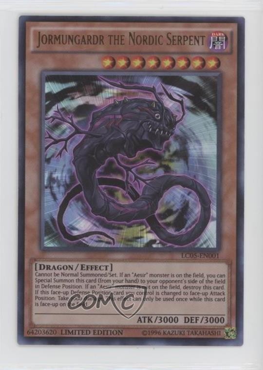 2014 Yu-Gi-Oh! Legendary Collection 5Ds - Collector's Set [Base] - Limited Edition #LC05-EN001 Jormungardr the Nordic Serpent COMC Item: 125088295 - YuGiOh Card - Featuring Jormungardr the Nordic Serpent Search for more: 2014 Yu-Gi-Oh! Legendary Collection 5Ds Search for more: 2014 Yu-Gi-Oh! Legendary Collection 5Ds - Collector's Set [Base] - Limited Edition View all of our Listings Auctions Buy It Now About Us Located in the beautiful Pacific Northwest, COMC (Check Out My Cards) is the world's largest consignment service for trading card singles. More than 10,000 people have used our consignment service to list over 50 million trading cards. Find out how we can help you consign your items on eBay by contacting us through eBay messaging. COMC -- "The Safe & Easy Way to Buy & Sell" Raw Condition for Modern Cards Unless otherwise noted, raw modern cards are listed in Near Mint-Mint condition or better. A NM-MT card appears to be Mint at first glance, but upon closer inspection, may exhibit some of the following: minor print defects (e.g. roller marks, print line, dimple), minor scratches, slight edge wear, and slight corner wear. Centering is clearly visible in the images provided and does not factor into our condition assessment. Raw Condition for Vintage Cards Unless otherwise noted, raw vintage cards are listed in Excellent condition or better. An EX card may exhibit some of the following: minor rounding of corners, surface wear, print defects, light scratches, and slight edge wear/chipping. Centering is clearly visible in the images provided and does not factor into our condition assessment. Domestic Shipping Combined shipping for multiple items is available. To receive combined shipping, please ensure all desired items are in your eBay shopping cart before proceeding to checkout. eBay limits orders to 40 items per order. We automatically combine multiple orders placed on the same day. If you place multiple orders on the same day, please contact us to request a refund of applicable shipping costs. Signature confirmation may be required on invoices over $400. All cards are protected and shipped securely. International Shipping COMC offers eBay's International Shipping (EIS) for international orders under $2,500* (see country exceptions below). All duties and import fees are paid at checkout; in the rare event that there are additional import fees upon delivery, these are borne by the buyer. EIS packages route through a shipping hub in Erlanger, KY before shipping to their final destination. Please note that EIS does not allow for combined shipments. The shipping rates are determined by eBay and cannot be adjusted. *Maximum sale price exceptions: Colombia, Kuwait ($2,000); Taiwan ($1,539); Chile, Costa Rica, Guatemala, Honduras, Trinidad and Tobago ($1,000); Antigua and Barbuda, Aruba, Belize, Dominica, Grenada, Philippines, Saint Kitts and Nevis, Saint Lucia, Montserrat, Turks and Caicos Islands ($500); Dominican Republic, El Salvador ($200). Please request a shipping quote through eBay messaging for orders that exceed the maximum sale price supported by eBay's International Shipping. You will be responsible for all duties and import fees for international orders shipped outside the EIS. All cards are protected and shipped securely. Payment COMC does not accept offers on our cards through our eBay storefront. COMC utilizes eBay’s managed payments system. If you are experiencing difficulties making a payment, please contact eBay for assistance. Return Policy Returns are only accepted on the rare occasion the item is not as described. If you are making a return, please initiate the return process through eBay so a mailing label can be provided for you. Prior to listing, our expert team carefully assessed this item to represent it accurately. Please review the description and high-definition images prior to purchasing to ensure this item meets your satisfaction. We welcome you to contact us if you have further questions about this item. Trust and Integrity COMC carefully assesses each item consigned to us to prevent fraudulent items from entering the marketplace. If you believe an item offered on COMC may be fraudulent, please contact us with details so we can investigate the issue. Items we determine are outside our supported items policy may be removed. Last Modified: 5/14/2025 8:35:19 AM PDT