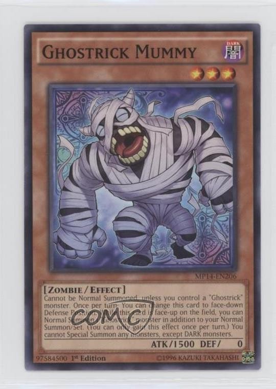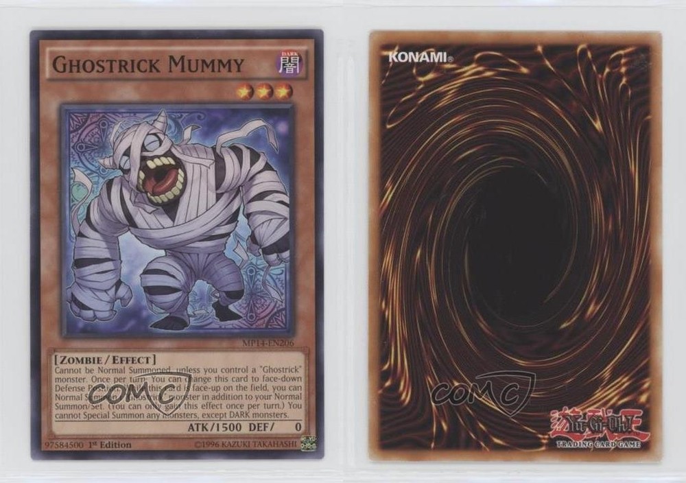 2014 Yu-Gi-Oh! Mega-Tins Mega Pack - [Base] - 1st Edition #MP14-EN206 Ghostrick Mummy COMC Item: 110666187 - YuGiOh Card Search for more: 2014 Yu-Gi-Oh! Mega-Tins Mega Pack Search for more: 2014 Yu-Gi-Oh! Mega-Tins Mega Pack - [Base] - 1st Edition View all of our Listings Auctions Buy It Now About Us Located in the beautiful Pacific Northwest, COMC (Check Out My Cards) is the world's largest consignment service for trading card singles. More than 10,000 people have used our consignment service to list over 50 million trading cards. Find out how we can help you consign your items on eBay by contacting us through eBay messaging. COMC -- "The Safe & Easy Way to Buy & Sell" Raw Condition for Modern Cards Unless otherwise noted, raw modern cards are listed in Near Mint-Mint condition or better. A NM-MT card appears to be Mint at first glance, but upon closer inspection, may exhibit some of the following: minor print defects (e.g. roller marks, print line, dimple), minor scratches, slight edge wear, and slight corner wear. Centering is clearly visible in the images provided and does not factor into our condition assessment. Raw Condition for Vintage Cards Unless otherwise noted, raw vintage cards are listed in Excellent condition or better. An EX card may exhibit some of the following: minor rounding of corners, surface wear, print defects, light scratches, and slight edge wear/chipping. Centering is clearly visible in the images provided and does not factor into our condition assessment. Domestic Shipping Combined shipping for multiple items is available. To receive combined shipping, please ensure all desired items are in your eBay shopping cart before proceeding to checkout. eBay limits orders to 40 items per order. We automatically combine multiple orders placed on the same day. If you place multiple orders on the same day, please contact us to request a refund of applicable shipping costs. Signature confirmation may be required on invoices over $400. All cards are protected and shipped securely. International Shipping COMC offers eBay's International Shipping (EIS) for international orders under $2,500* (see country exceptions below). All duties and import fees are paid at checkout; in the rare event that there are additional import fees upon delivery, these are borne by the buyer. EIS packages route through a shipping hub in Erlanger, KY before shipping to their final destination. Please note that EIS does not allow for combined shipments. The shipping rates are determined by eBay and cannot be adjusted. *Maximum sale price exceptions: Colombia, Kuwait ($2,000); Taiwan ($1,539); Chile, Costa Rica, Guatemala, Honduras, Trinidad and Tobago ($1,000); Antigua and Barbuda, Aruba, Belize, Dominica, Grenada, Philippines, Saint Kitts and Nevis, Saint Lucia, Montserrat, Turks and Caicos Islands ($500); Dominican Republic, El Salvador ($200). Please request a shipping quote through eBay messaging for orders that exceed the maximum sale price supported by eBay's International Shipping. You will be responsible for all duties and import fees for international orders shipped outside the EIS. All cards are protected and shipped securely. Payment COMC does not accept offers on our cards through our eBay storefront. COMC utilizes eBay’s managed payments system. If you are experiencing difficulties making a payment, please contact eBay for assistance. Return Policy Returns are only accepted on the rare occasion the item is not as described. If you are making a return, please initiate the return process through eBay so a mailing label can be provided for you. Prior to listing, our expert team carefully assessed this item to represent it accurately. Please review the description and high-definition images prior to purchasing to ensure this item meets your satisfaction. We welcome you to contact us if you have further questions about this item. Trust and Integrity COMC carefully assesses each item consigned to us to prevent fraudulent items from entering the marketplace. If you believe an item offered on COMC may be fraudulent, please contact us with details so we can investigate the issue. Items we determine are outside our supported items policy may be removed. Last Modified: 6/9/2025 3:07:11 PM PDT