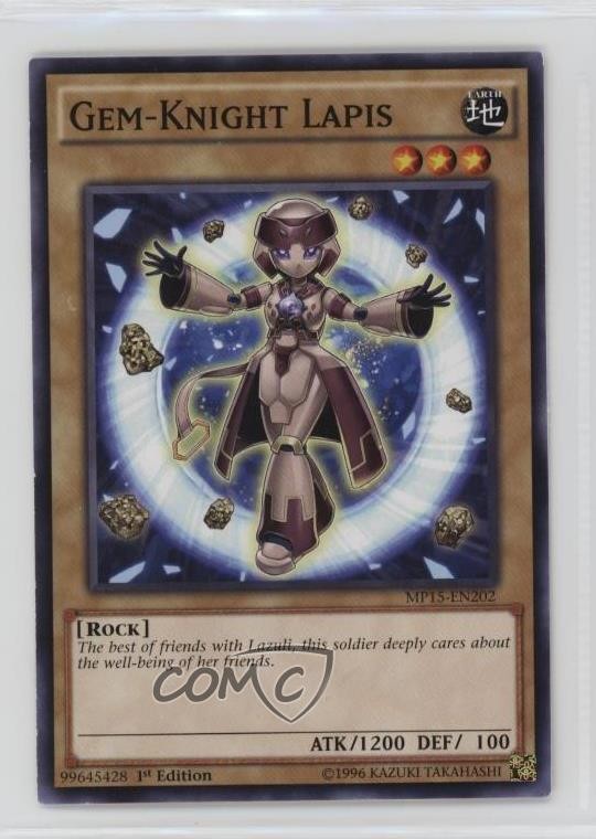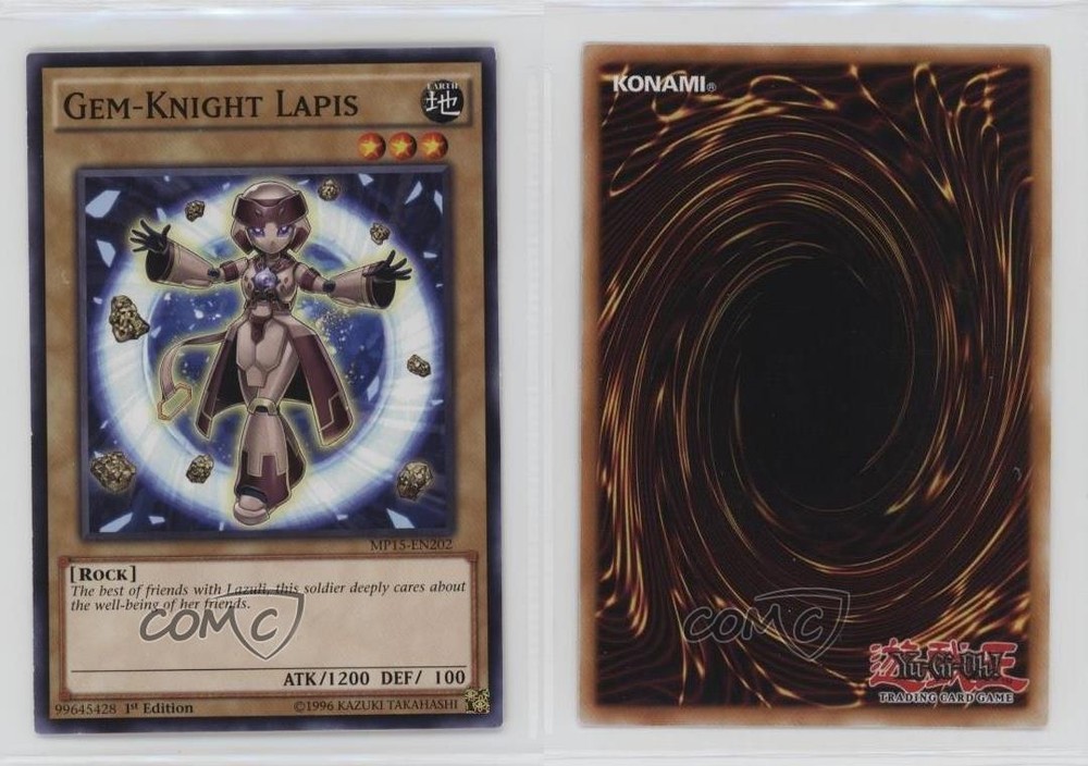 2015 Yu-Gi-Oh! Mega-Tins - Mega Pack [Base] - 1st Edition #MP15-EN202 Gem-Knight Lapis COMC Item: 270294521 - YuGiOh Card - Featuring Gem-Knight Lapis Search for more: 2015 Yu-Gi-Oh! Mega-Tins Search for more: 2015 Yu-Gi-Oh! Mega-Tins - Mega Pack [Base] - 1st Edition View all of our Listings Auctions Buy It Now About Us Located in the beautiful Pacific Northwest, COMC (Check Out My Cards) is the world's largest consignment service for trading card singles. More than 10,000 people have used our consignment service to list over 50 million trading cards. Find out how we can help you consign your items on eBay by contacting us through eBay messaging. COMC -- "The Safe & Easy Way to Buy & Sell" Raw Condition for Modern Cards Unless otherwise noted, raw modern cards are listed in Near Mint-Mint condition or better. A NM-MT card appears to be Mint at first glance, but upon closer inspection, may exhibit some of the following: minor print defects (e.g. roller marks, print line, dimple), minor scratches, slight edge wear, and slight corner wear. Centering is clearly visible in the images provided and does not factor into our condition assessment. Raw Condition for Vintage Cards Unless otherwise noted, raw vintage cards are listed in Excellent condition or better. An EX card may exhibit some of the following: minor rounding of corners, surface wear, print defects, light scratches, and slight edge wear/chipping. Centering is clearly visible in the images provided and does not factor into our condition assessment. Domestic Shipping Combined shipping for multiple items is available. To receive combined shipping, please ensure all desired items are in your eBay shopping cart before proceeding to checkout. eBay limits orders to 40 items per order. We automatically combine multiple orders placed on the same day. If you place multiple orders on the same day, please contact us to request a refund of applicable shipping costs. Signature confirmation may be required on invoices over $400. All cards are protected and shipped securely. International Shipping COMC offers eBay's International Shipping (EIS) for international orders under $2,500* (see country exceptions below). All duties and import fees are paid at checkout; in the rare event that there are additional import fees upon delivery, these are borne by the buyer. EIS packages route through a shipping hub in Erlanger, KY before shipping to their final destination. Please note that EIS does not allow for combined shipments. The shipping rates are determined by eBay and cannot be adjusted. *Maximum sale price exceptions: Colombia, Kuwait ($2,000); Taiwan ($1,539); Chile, Costa Rica, Guatemala, Honduras, Trinidad and Tobago ($1,000); Antigua and Barbuda, Aruba, Belize, Dominica, Grenada, Philippines, Saint Kitts and Nevis, Saint Lucia, Montserrat, Turks and Caicos Islands ($500); Dominican Republic, El Salvador ($200). Please request a shipping quote through eBay messaging for orders that exceed the maximum sale price supported by eBay's International Shipping. You will be responsible for all duties and import fees for international orders shipped outside the EIS. All cards are protected and shipped securely. Payment COMC does not accept offers on our cards through our eBay storefront. COMC utilizes eBay’s managed payments system. If you are experiencing difficulties making a payment, please contact eBay for assistance. Return Policy Returns are only accepted on the rare occasion the item is not as described. If you are making a return, please initiate the return process through eBay so a mailing label can be provided for you. Prior to listing, our expert team carefully assessed this item to represent it accurately. Please review the description and high-definition images prior to purchasing to ensure this item meets your satisfaction. We welcome you to contact us if you have further questions about this item. Trust and Integrity COMC carefully assesses each item consigned to us to prevent fraudulent items from entering the marketplace. If you believe an item offered on COMC may be fraudulent, please contact us with details so we can investigate the issue. Items we determine are outside our supported items policy may be removed. Last Modified: 5/22/2025 9:31:48 AM PDT