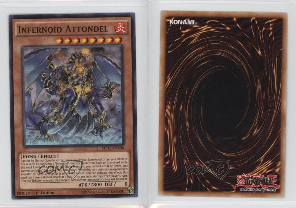2015 Yu-Gi-Oh! Mega-Tins - Mega Pack [Base] - 1st Edition #MP15-EN208 Infernoid Attondel COMC Item: 33394764 - YuGiOh Card - Featuring Infernoid Attondel Search for more: 2015 Yu-Gi-Oh! Mega-Tins Search for more: 2015 Yu-Gi-Oh! Mega-Tins - Mega Pack [Base] - 1st Edition View all of our Listings Auctions Buy It Now About Us Located in the beautiful Pacific Northwest, COMC (Check Out My Cards) is the world's largest consignment service for trading card singles. More than 10,000 people have used our consignment service to list over 50 million trading cards. Find out how we can help you consign your items on eBay by contacting us through eBay messaging. COMC -- "The Safe & Easy Way to Buy & Sell" Raw Condition for Modern Cards Unless otherwise noted, raw modern cards are listed in Near Mint-Mint condition or better. A NM-MT card appears to be Mint at first glance, but upon closer inspection, may exhibit some of the following: minor print defects (e.g. roller marks, print line, dimple), minor scratches, slight edge wear, and slight corner wear. Centering is clearly visible in the images provided and does not factor into our condition assessment. Raw Condition for Vintage Cards Unless otherwise noted, raw vintage cards are listed in Excellent condition or better. An EX card may exhibit some of the following: minor rounding of corners, surface wear, print defects, light scratches, and slight edge wear/chipping. Centering is clearly visible in the images provided and does not factor into our condition assessment. Domestic Shipping Combined shipping for multiple items is available. To receive combined shipping, please ensure all desired items are in your eBay shopping cart before proceeding to checkout. eBay limits orders to 40 items per order. We automatically combine multiple orders placed on the same day. If you place multiple orders on the same day, please contact us to request a refund of applicable shipping costs. Signature confirmation may be required on invoices over $400. All cards are protected and shipped securely. International Shipping COMC offers eBay's International Shipping (EIS) for international orders under $2,500* (see country exceptions below). All duties and import fees are paid at checkout; in the rare event that there are additional import fees upon delivery, these are borne by the buyer. EIS packages route through a shipping hub in Erlanger, KY before shipping to their final destination. Please note that EIS does not allow for combined shipments. The shipping rates are determined by eBay and cannot be adjusted. *Maximum sale price exceptions: Colombia, Kuwait ($2,000); Taiwan ($1,539); Chile, Costa Rica, Guatemala, Honduras, Trinidad and Tobago ($1,000); Antigua and Barbuda, Aruba, Belize, Dominica, Grenada, Philippines, Saint Kitts and Nevis, Saint Lucia, Montserrat, Turks and Caicos Islands ($500); Dominican Republic, El Salvador ($200). Please request a shipping quote through eBay messaging for orders that exceed the maximum sale price supported by eBay's International Shipping. You will be responsible for all duties and import fees for international orders shipped outside the EIS. All cards are protected and shipped securely. Payment COMC does not accept offers on our cards through our eBay storefront. COMC utilizes eBay’s managed payments system. If you are experiencing difficulties making a payment, please contact eBay for assistance. Return Policy Returns are only accepted on the rare occasion the item is not as described. If you are making a return, please initiate the return process through eBay so a mailing label can be provided for you. Prior to listing, our expert team carefully assessed this item to represent it accurately. Please review the description and high-definition images prior to purchasing to ensure this item meets your satisfaction. We welcome you to contact us if you have further questions about this item. Trust and Integrity COMC carefully assesses each item consigned to us to prevent fraudulent items from entering the marketplace. If you believe an item offered on COMC may be fraudulent, please contact us with details so we can investigate the issue. Items we determine are outside our supported items policy may be removed. Last Modified: 5/6/2025 2:37:01 AM PDT