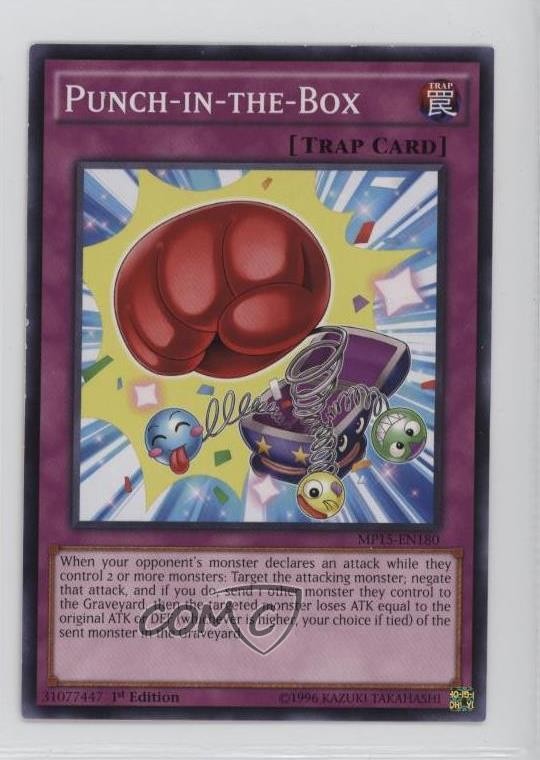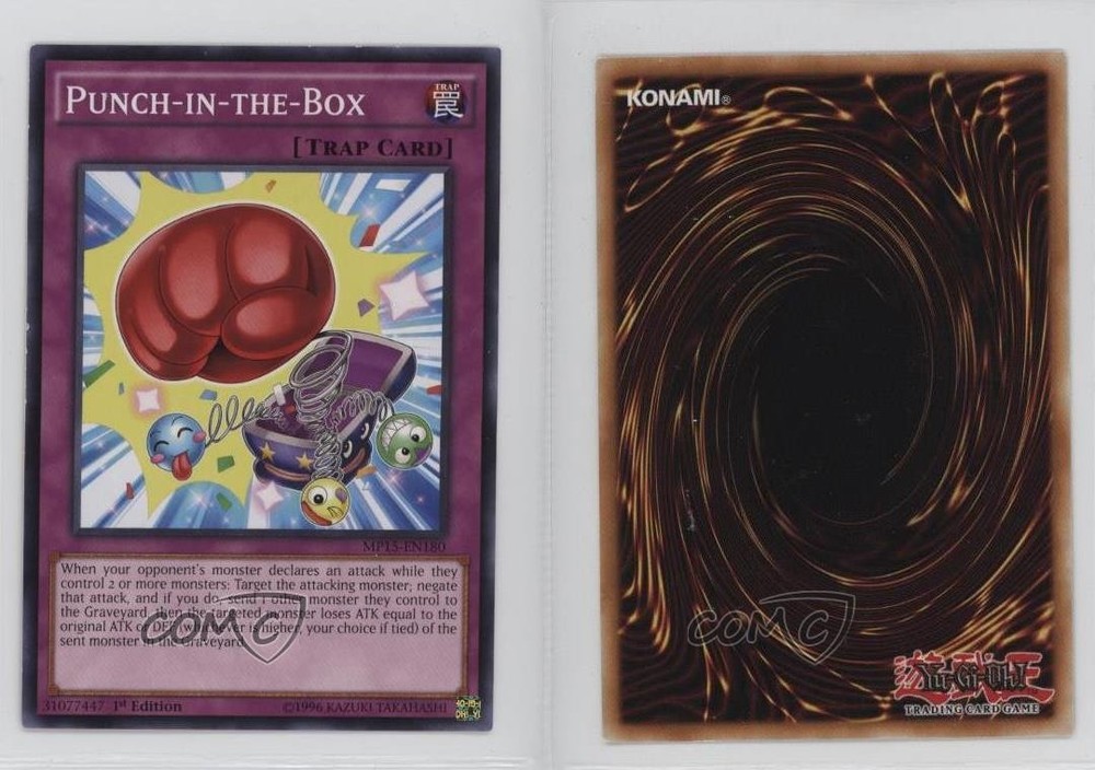 2015 Yu-Gi-Oh! Mega-Tins - Mega Pack [Base] - 1st Edition #MP15-EN180 Punch-In-The-Box COMC Item: 270294639 - YuGiOh Card - Featuring Punch-In-The-Box Search for more: 2015 Yu-Gi-Oh! Mega-Tins Search for more: 2015 Yu-Gi-Oh! Mega-Tins - Mega Pack [Base] - 1st Edition View all of our Listings Auctions Buy It Now About Us Located in the beautiful Pacific Northwest, COMC (Check Out My Cards) is the world's largest consignment service for trading card singles. More than 10,000 people have used our consignment service to list over 50 million trading cards. Find out how we can help you consign your items on eBay by contacting us through eBay messaging. COMC -- "The Safe & Easy Way to Buy & Sell" Raw Condition for Modern Cards Unless otherwise noted, raw modern cards are listed in Near Mint-Mint condition or better. A NM-MT card appears to be Mint at first glance, but upon closer inspection, may exhibit some of the following: minor print defects (e.g. roller marks, print line, dimple), minor scratches, slight edge wear, and slight corner wear. Centering is clearly visible in the images provided and does not factor into our condition assessment. Raw Condition for Vintage Cards Unless otherwise noted, raw vintage cards are listed in Excellent condition or better. An EX card may exhibit some of the following: minor rounding of corners, surface wear, print defects, light scratches, and slight edge wear/chipping. Centering is clearly visible in the images provided and does not factor into our condition assessment. Domestic Shipping Combined shipping for multiple items is available. To receive combined shipping, please ensure all desired items are in your eBay shopping cart before proceeding to checkout. eBay limits orders to 40 items per order. We automatically combine multiple orders placed on the same day. If you place multiple orders on the same day, please contact us to request a refund of applicable shipping costs. Signature confirmation may be required on invoices over $400. All cards are protected and shipped securely. International Shipping COMC offers eBay's International Shipping (EIS) for international orders under $2,500* (see country exceptions below). All duties and import fees are paid at checkout; in the rare event that there are additional import fees upon delivery, these are borne by the buyer. EIS packages route through a shipping hub in Erlanger, KY before shipping to their final destination. Please note that EIS does not allow for combined shipments. The shipping rates are determined by eBay and cannot be adjusted. *Maximum sale price exceptions: Colombia, Kuwait ($2,000); Taiwan ($1,539); Chile, Costa Rica, Guatemala, Honduras, Trinidad and Tobago ($1,000); Antigua and Barbuda, Aruba, Belize, Dominica, Grenada, Philippines, Saint Kitts and Nevis, Saint Lucia, Montserrat, Turks and Caicos Islands ($500); Dominican Republic, El Salvador ($200). Please request a shipping quote through eBay messaging for orders that exceed the maximum sale price supported by eBay's International Shipping. You will be responsible for all duties and import fees for international orders shipped outside the EIS. All cards are protected and shipped securely. Payment COMC does not accept offers on our cards through our eBay storefront. COMC utilizes eBay’s managed payments system. If you are experiencing difficulties making a payment, please contact eBay for assistance. Return Policy Returns are only accepted on the rare occasion the item is not as described. If you are making a return, please initiate the return process through eBay so a mailing label can be provided for you. Prior to listing, our expert team carefully assessed this item to represent it accurately. Please review the description and high-definition images prior to purchasing to ensure this item meets your satisfaction. We welcome you to contact us if you have further questions about this item. Trust and Integrity COMC carefully assesses each item consigned to us to prevent fraudulent items from entering the marketplace. If you believe an item offered on COMC may be fraudulent, please contact us with details so we can investigate the issue. Items we determine are outside our supported items policy may be removed. Last Modified: 5/22/2025 9:31:39 AM PDT