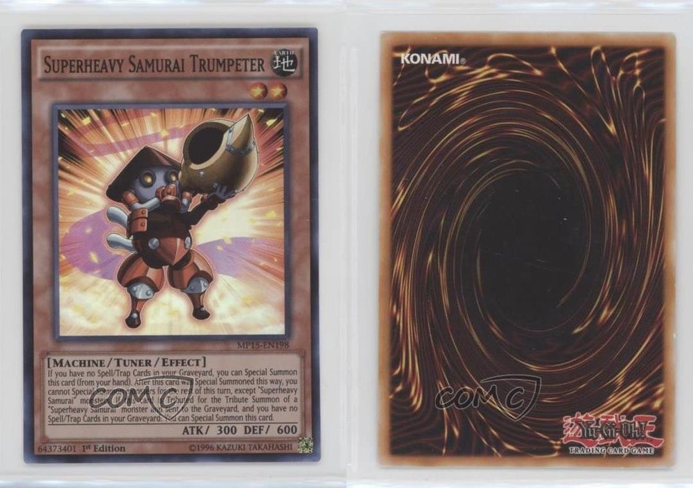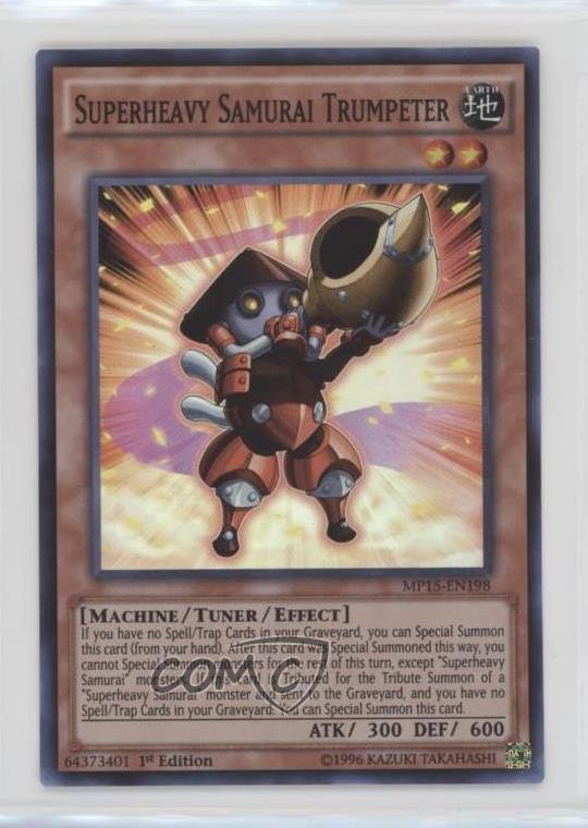 2015 Yu-Gi-Oh! Mega-Tins - Mega Pack [Base] - 1st Edition #MP15-EN198 Superheavy Samurai Trumpeter COMC Item: 128305033 - YuGiOh Card Search for more: 2015 Yu-Gi-Oh! Mega-Tins Search for more: 2015 Yu-Gi-Oh! Mega-Tins - Mega Pack [Base] - 1st Edition View all of our Listings Auctions Buy It Now About Us Located in the beautiful Pacific Northwest, COMC (Check Out My Cards) is the world's largest consignment service for trading card singles. More than 10,000 people have used our consignment service to list over 50 million trading cards. Find out how we can help you consign your items on eBay by contacting us through eBay messaging. COMC -- "The Safe & Easy Way to Buy & Sell" Raw Condition for Modern Cards Unless otherwise noted, raw modern cards are listed in Near Mint-Mint condition or better. A NM-MT card appears to be Mint at first glance, but upon closer inspection, may exhibit some of the following: minor print defects (e.g. roller marks, print line, dimple), minor scratches, slight edge wear, and slight corner wear. Centering is clearly visible in the images provided and does not factor into our condition assessment. Raw Condition for Vintage Cards Unless otherwise noted, raw vintage cards are listed in Excellent condition or better. An EX card may exhibit some of the following: minor rounding of corners, surface wear, print defects, light scratches, and slight edge wear/chipping. Centering is clearly visible in the images provided and does not factor into our condition assessment. Domestic Shipping Combined shipping for multiple items is available. To receive combined shipping, please ensure all desired items are in your eBay shopping cart before proceeding to checkout. eBay limits orders to 40 items per order. We automatically combine multiple orders placed on the same day. If you place multiple orders on the same day, please contact us to request a refund of applicable shipping costs. Signature confirmation may be required on invoices over $400. All cards are protected and shipped securely. International Shipping COMC offers eBay's International Shipping (EIS) for international orders under $2,500* (see country exceptions below). All duties and import fees are paid at checkout; in the rare event that there are additional import fees upon delivery, these are borne by the buyer. EIS packages route through a shipping hub in Erlanger, KY before shipping to their final destination. Please note that EIS does not allow for combined shipments. The shipping rates are determined by eBay and cannot be adjusted. *Maximum sale price exceptions: Colombia, Kuwait ($2,000); Taiwan ($1,539); Chile, Costa Rica, Guatemala, Honduras, Trinidad and Tobago ($1,000); Antigua and Barbuda, Aruba, Belize, Dominica, Grenada, Philippines, Saint Kitts and Nevis, Saint Lucia, Montserrat, Turks and Caicos Islands ($500); Dominican Republic, El Salvador ($200). Please request a shipping quote through eBay messaging for orders that exceed the maximum sale price supported by eBay's International Shipping. You will be responsible for all duties and import fees for international orders shipped outside the EIS. All cards are protected and shipped securely. Payment COMC does not accept offers on our cards through our eBay storefront. COMC utilizes eBay’s managed payments system. If you are experiencing difficulties making a payment, please contact eBay for assistance. Return Policy Returns are only accepted on the rare occasion the item is not as described. If you are making a return, please initiate the return process through eBay so a mailing label can be provided for you. Prior to listing, our expert team carefully assessed this item to represent it accurately. Please review the description and high-definition images prior to purchasing to ensure this item meets your satisfaction. We welcome you to contact us if you have further questions about this item. Trust and Integrity COMC carefully assesses each item consigned to us to prevent fraudulent items from entering the marketplace. If you believe an item offered on COMC may be fraudulent, please contact us with details so we can investigate the issue. Items we determine are outside our supported items policy may be removed. Last Modified: 5/18/2025 2:39:35 PM PDT