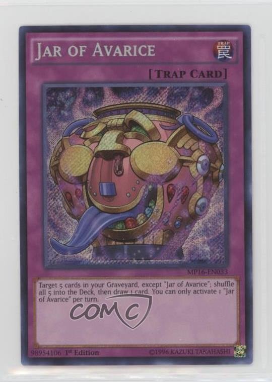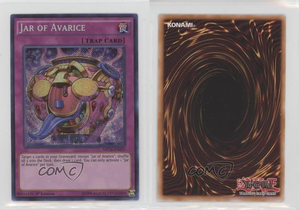 2016 Yu-Gi-Oh! Mega-Tin - Mega Pack [Base] - 1st Edition #MP16-EN033 Jar of Avrice COMC Item: 108914604 - YuGiOh Card Search for more: 2016 Yu-Gi-Oh! Mega-Tin Search for more: 2016 Yu-Gi-Oh! Mega-Tin - Mega Pack [Base] - 1st Edition View all of our Listings Auctions Buy It Now About Us Located in the beautiful Pacific Northwest, COMC (Check Out My Cards) is the world's largest consignment service for trading card singles. More than 10,000 people have used our consignment service to list over 50 million trading cards. Find out how we can help you consign your items on eBay by contacting us through eBay messaging. COMC -- "The Safe & Easy Way to Buy & Sell" Raw Condition for Modern Cards Unless otherwise noted, raw modern cards are listed in Near Mint-Mint condition or better. A NM-MT card appears to be Mint at first glance, but upon closer inspection, may exhibit some of the following: minor print defects (e.g. roller marks, print line, dimple), minor scratches, slight edge wear, and slight corner wear. Centering is clearly visible in the images provided and does not factor into our condition assessment. Raw Condition for Vintage Cards Unless otherwise noted, raw vintage cards are listed in Excellent condition or better. An EX card may exhibit some of the following: minor rounding of corners, surface wear, print defects, light scratches, and slight edge wear/chipping. Centering is clearly visible in the images provided and does not factor into our condition assessment. Domestic Shipping Combined shipping for multiple items is available. To receive combined shipping, please ensure all desired items are in your eBay shopping cart before proceeding to checkout. eBay limits orders to 40 items per order. We automatically combine multiple orders placed on the same day. If you place multiple orders on the same day, please contact us to request a refund of applicable shipping costs. Signature confirmation may be required on invoices over $400. All cards are protected and shipped securely. International Shipping COMC offers eBay's International Shipping (EIS) for international orders under $2,500* (see country exceptions below). All duties and import fees are paid at checkout; in the rare event that there are additional import fees upon delivery, these are borne by the buyer. EIS packages route through a shipping hub in Erlanger, KY before shipping to their final destination. Please note that EIS does not allow for combined shipments. The shipping rates are determined by eBay and cannot be adjusted. *Maximum sale price exceptions: Colombia, Kuwait ($2,000); Taiwan ($1,539); Chile, Costa Rica, Guatemala, Honduras, Trinidad and Tobago ($1,000); Antigua and Barbuda, Aruba, Belize, Dominica, Grenada, Philippines, Saint Kitts and Nevis, Saint Lucia, Montserrat, Turks and Caicos Islands ($500); Dominican Republic, El Salvador ($200). Please request a shipping quote through eBay messaging for orders that exceed the maximum sale price supported by eBay's International Shipping. You will be responsible for all duties and import fees for international orders shipped outside the EIS. All cards are protected and shipped securely. Payment COMC does not accept offers on our cards through our eBay storefront. COMC utilizes eBay’s managed payments system. If you are experiencing difficulties making a payment, please contact eBay for assistance. Return Policy Returns are only accepted on the rare occasion the item is not as described. If you are making a return, please initiate the return process through eBay so a mailing label can be provided for you. Prior to listing, our expert team carefully assessed this item to represent it accurately. Please review the description and high-definition images prior to purchasing to ensure this item meets your satisfaction. We welcome you to contact us if you have further questions about this item. Trust and Integrity COMC carefully assesses each item consigned to us to prevent fraudulent items from entering the marketplace. If you believe an item offered on COMC may be fraudulent, please contact us with details so we can investigate the issue. Items we determine are outside our supported items policy may be removed. Last Modified: 5/7/2025 7:29:19 PM PDT