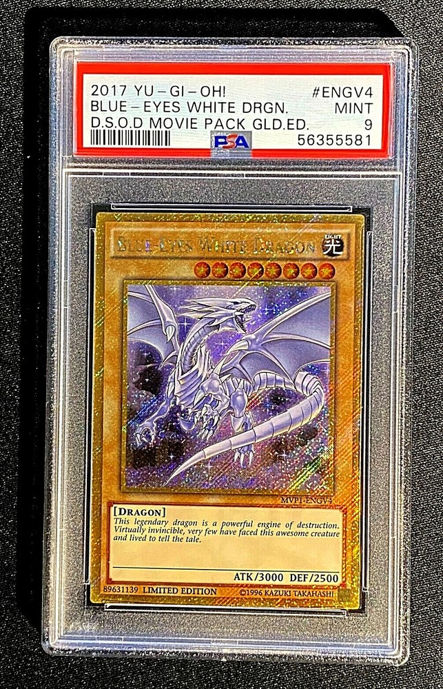 2017 PSA 9 ENGV4 BLUE EYES WHITE DRAGON MOVIE PACK GOLD ED. DSOD 3113/14&3443/44 BEST PACKING ON EBAY GUARANTEED. WITH THAT SAID I HAVE BEEN TOLD I “OVER-DO-IT”. But I feel this is a testament to how much respect and care I have for your item. PLEASE, if you see an error in one of my listing send me a message, Thank you. ig= card.addiction Please subscribe if you are interested in a monthly news letter. Items with multiple cards of the same card for sale are mailed out in random order , but are all within the same condition as stated in “Card Condition” and or Item Description. SLABS MAY HAVE SOME SCRATCHES AND OR OTHER IMPERFECTIONS. IF YOU NEED A PRISTINE SLAB PLEASE JUST SHOP ELSEWHERE. INTERNATIONAL SHIPPING = ONLY THROUGH EBAY SHIPPING PLATFORM ! Add multiple cards to your shopping cart and or just request combined shipping at any time; 50 cents each additional single raw card and or 1 dollar each additional graded card. 10 dollars maximum shipping no matter how many cards you buy. Highest shipping cost plus .50 or $1.00 to a max of $10.00 SHIPPING, for trading cards only AND OR other small items , like jewlery, which CAN be combined. Please inquire FIRST, about combined shipping, if buying trading cards AND other items from my store. JUST PURCHASE I WILL REFUND DIFFERENCE OF SHIPPING ON MULTIPLE PURCHACES AFTER CHECK-OUT ... PLEASE give me time to respond and provide your refund of the shipping difference and to respond to messages. If you have any questions what-so-ever please ask BEFORE you bid, not after. I OFFER NO GUARANTEES ON ANY RAW CARDS EXCEPT THAT YOU WILL GET THE EXACT CARD IN THE PICTURE, except when there are multiples of a card for sale. No shipping over the weekends and holidays. Payments made Friday’s after 9:00 am will be shipped on Mondays, as long as the post office is open. =#’s= at end of item description are for cataloging purposes only, cross-referencing . I highly suggest LOW FEEDBACKERS to contact me prior to purchasing or be at risk of having your order canceled and being blocked.